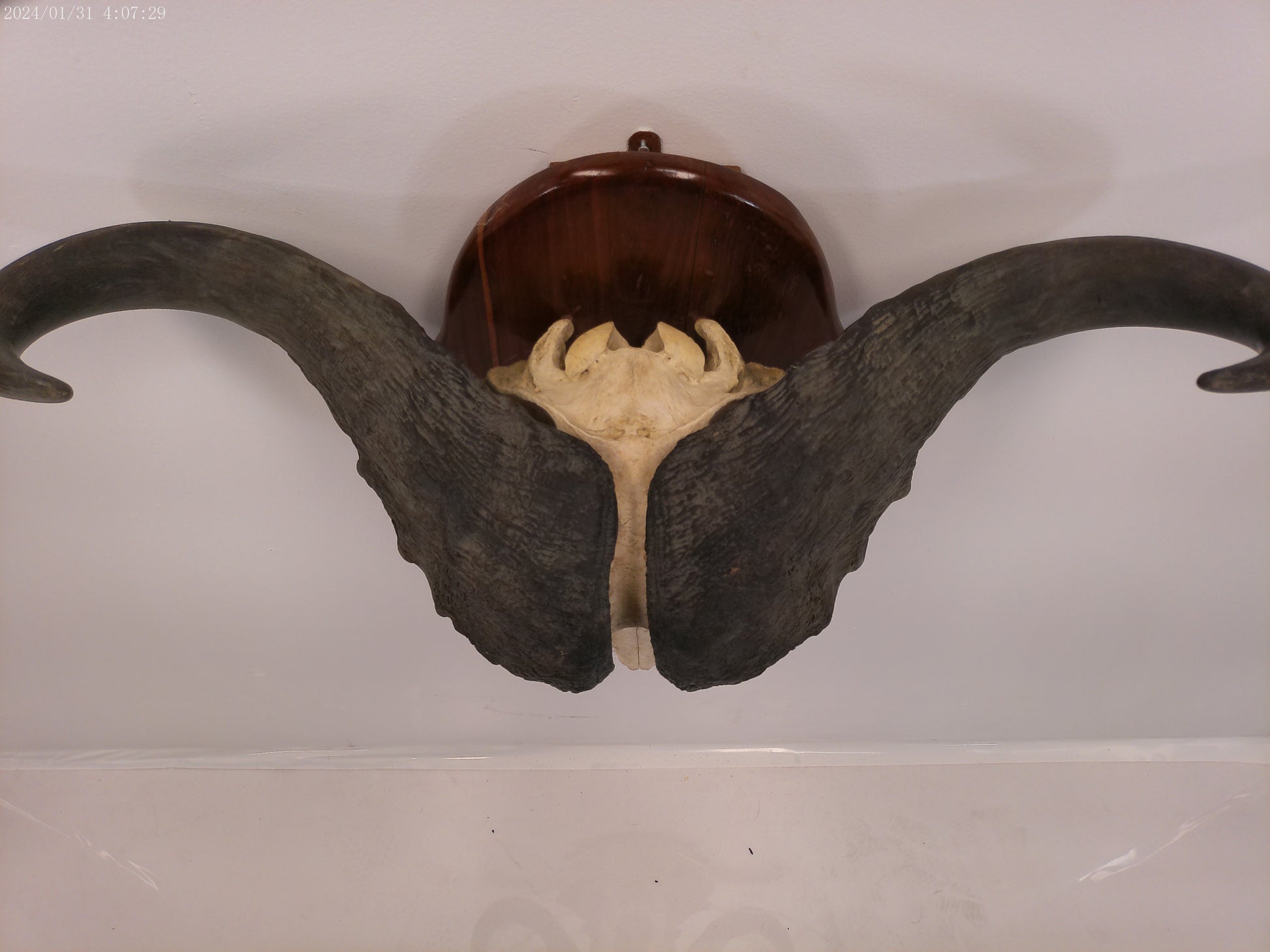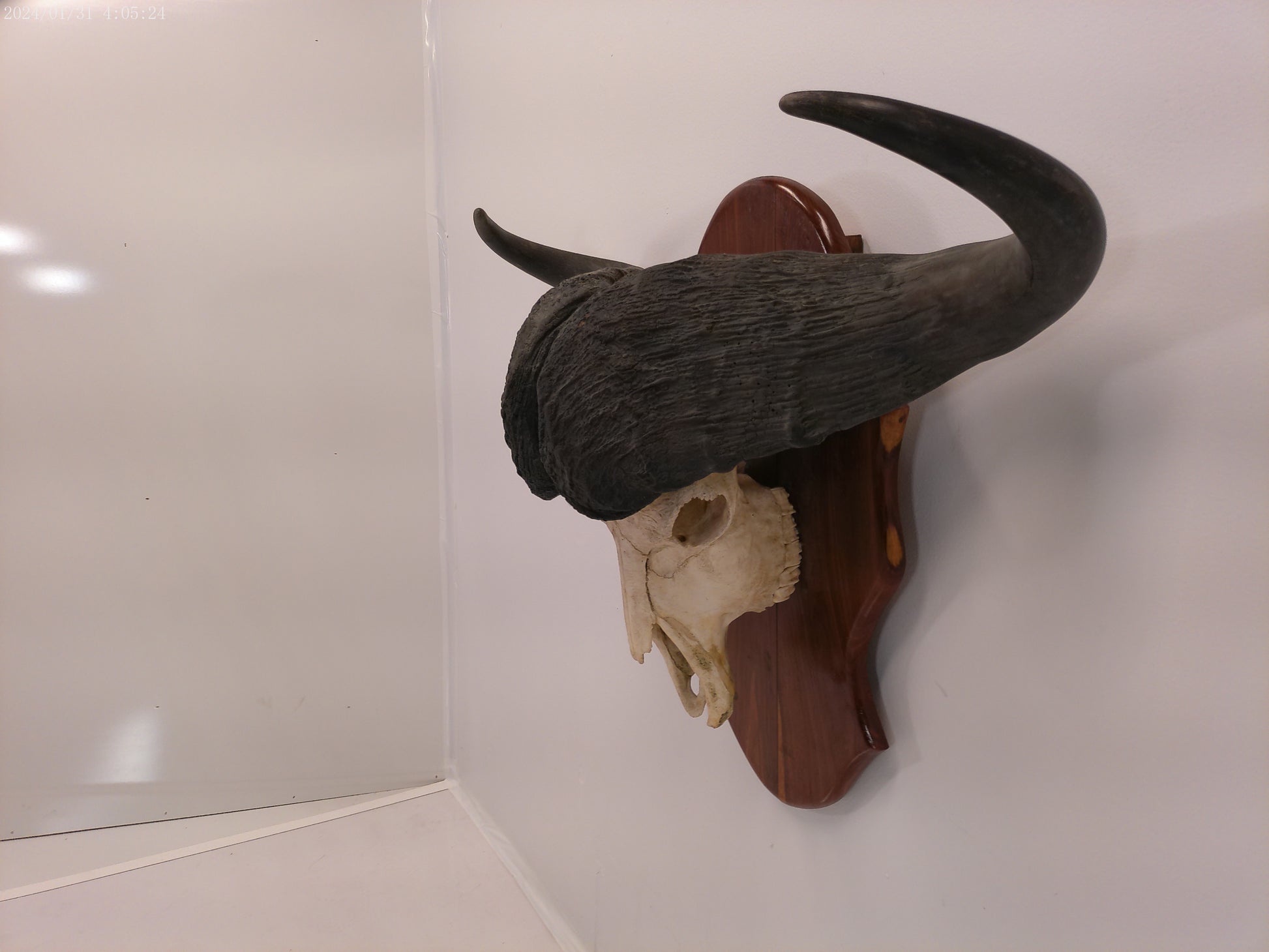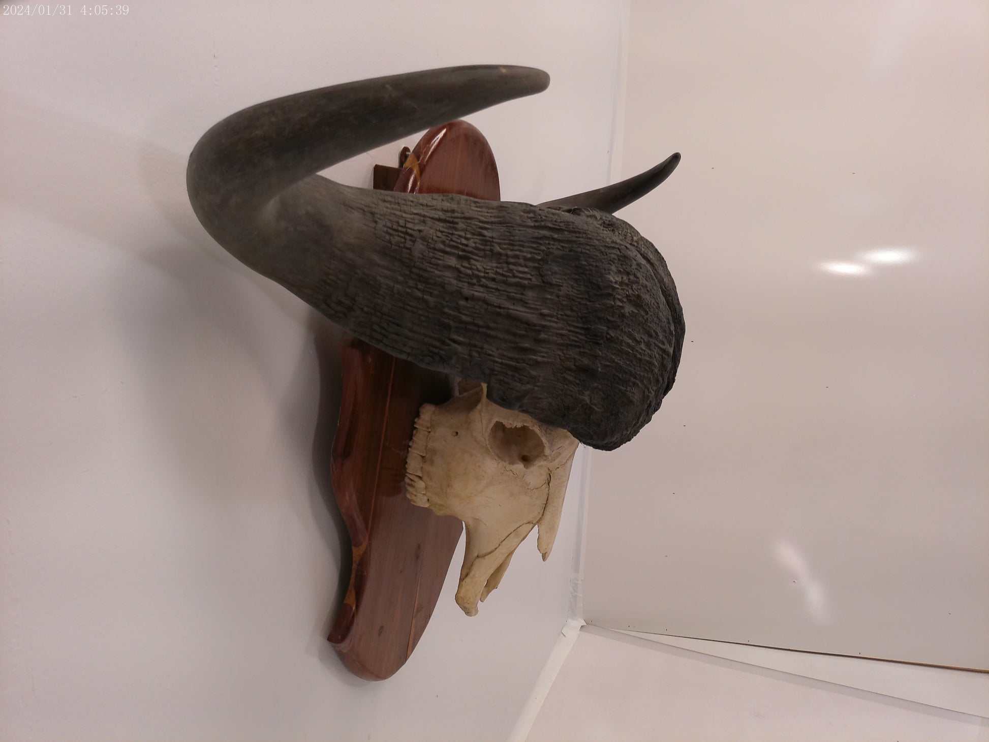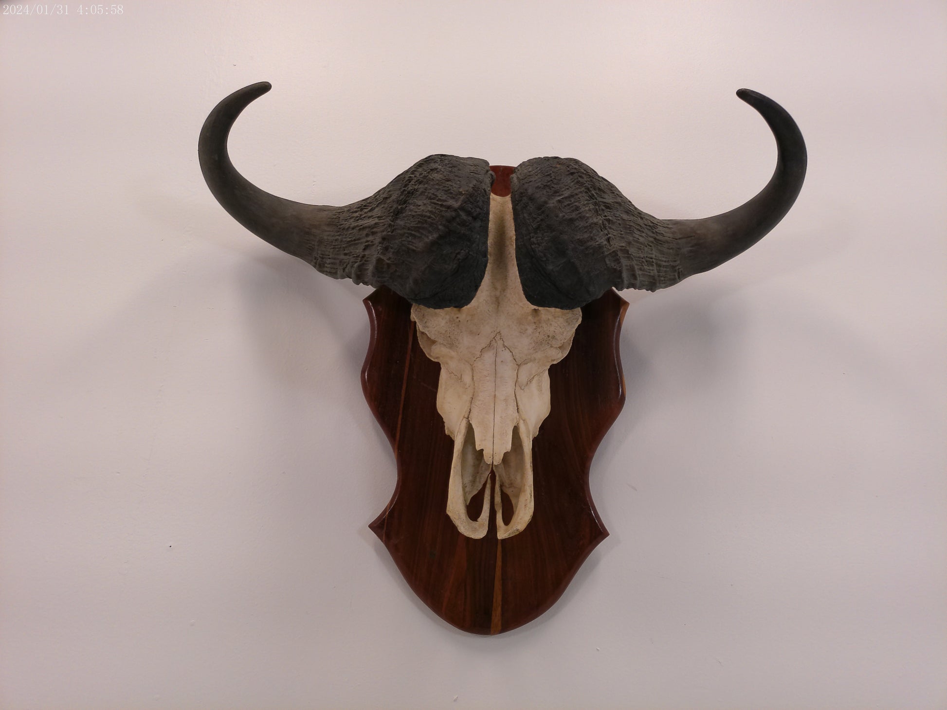 This impressive African Cape Buffalo is mounted on a board, showcasing its large and formidable horns. As a symbol of strength and power, this piece adds a touch of African safari to any space. A must-have for any wildlife enthusiast or collector.