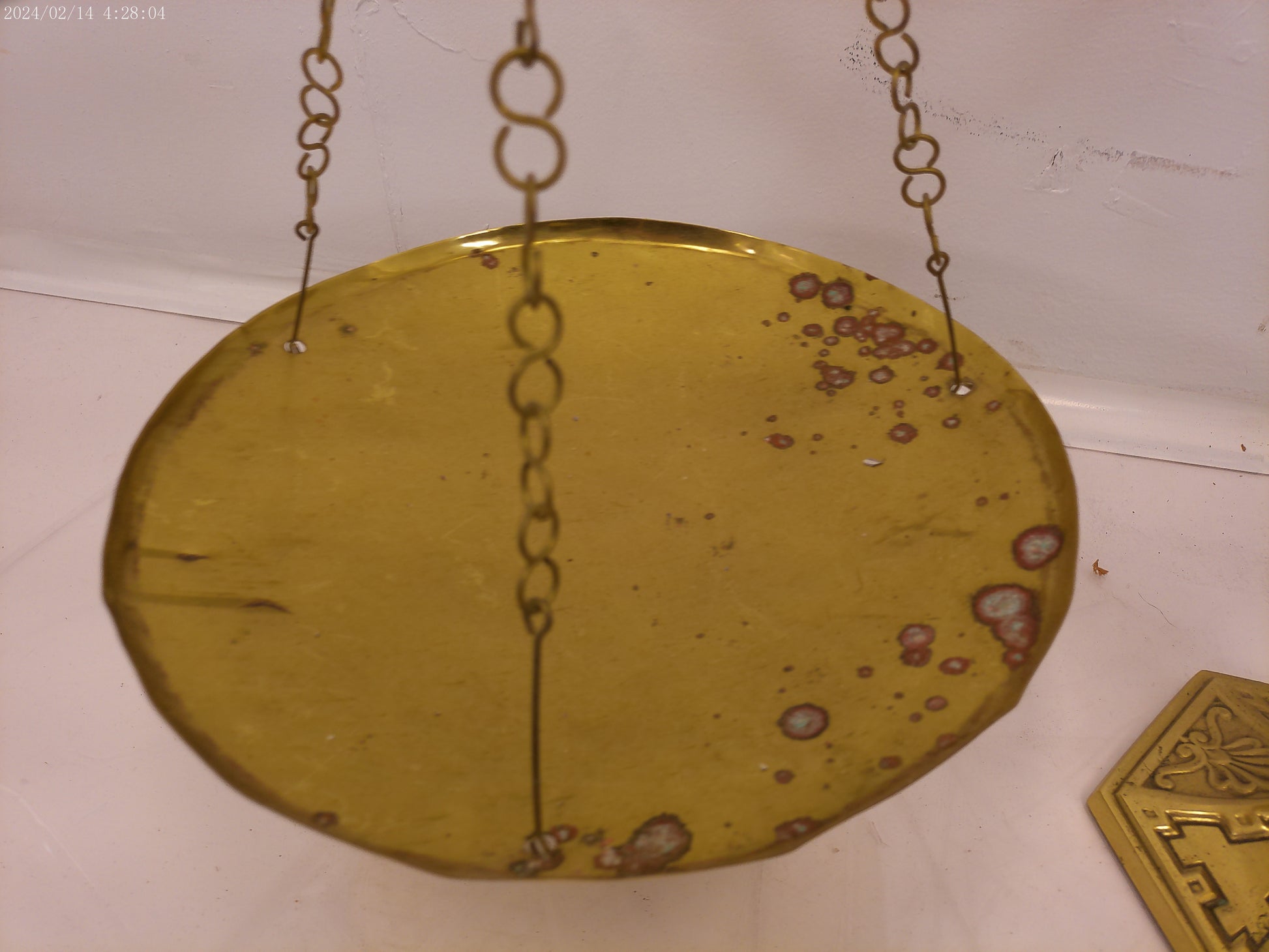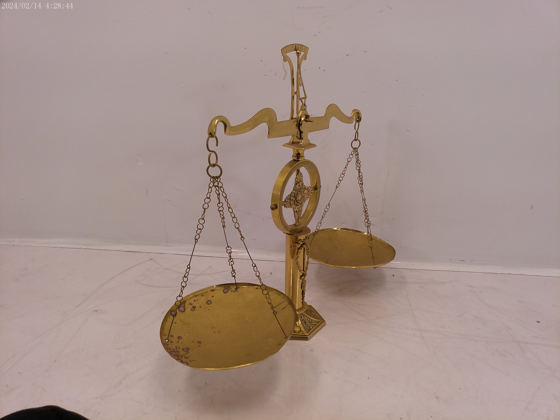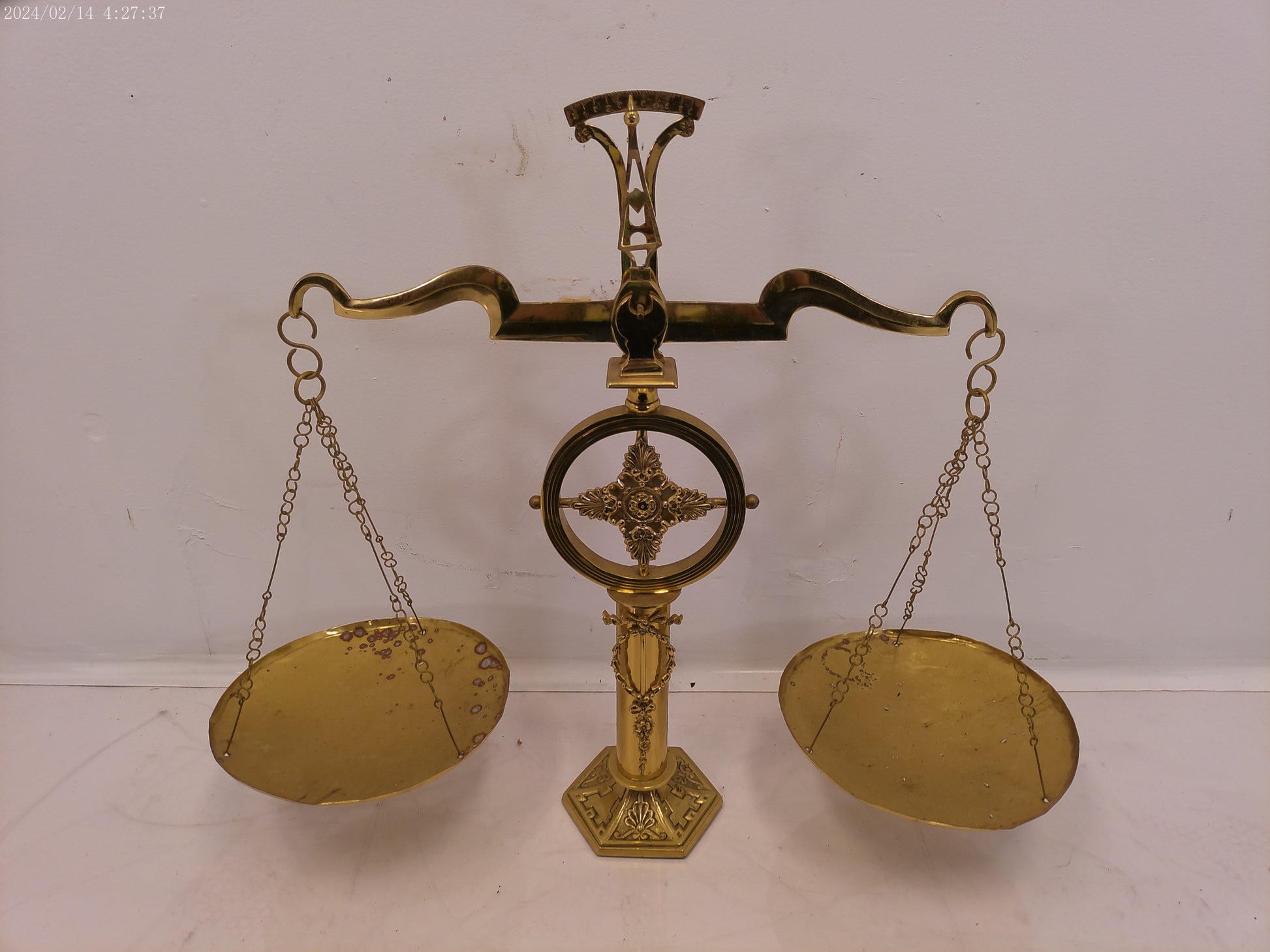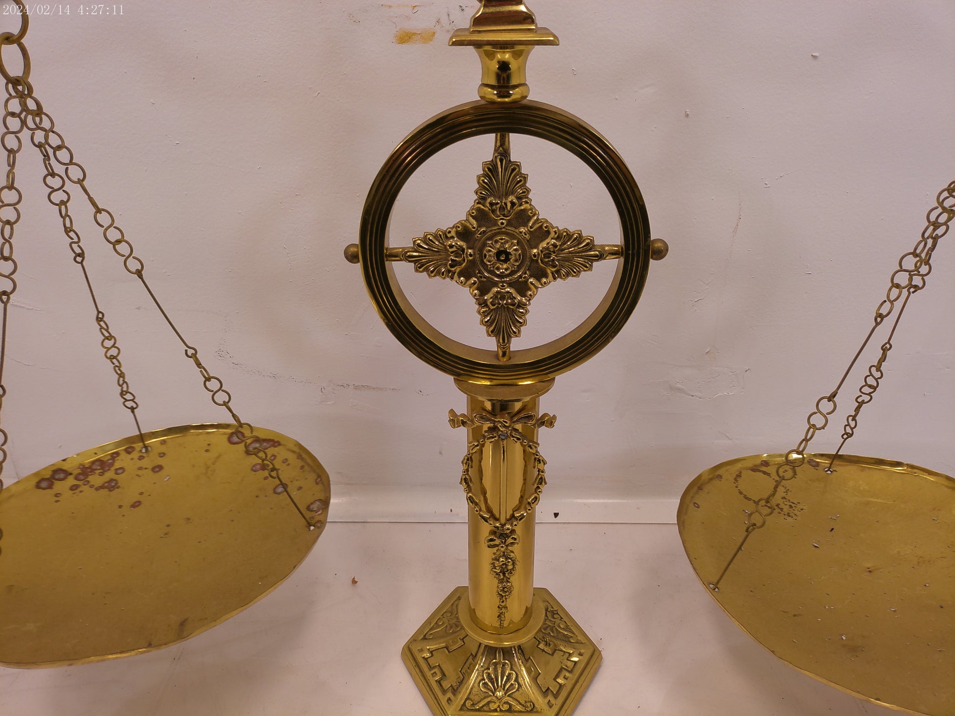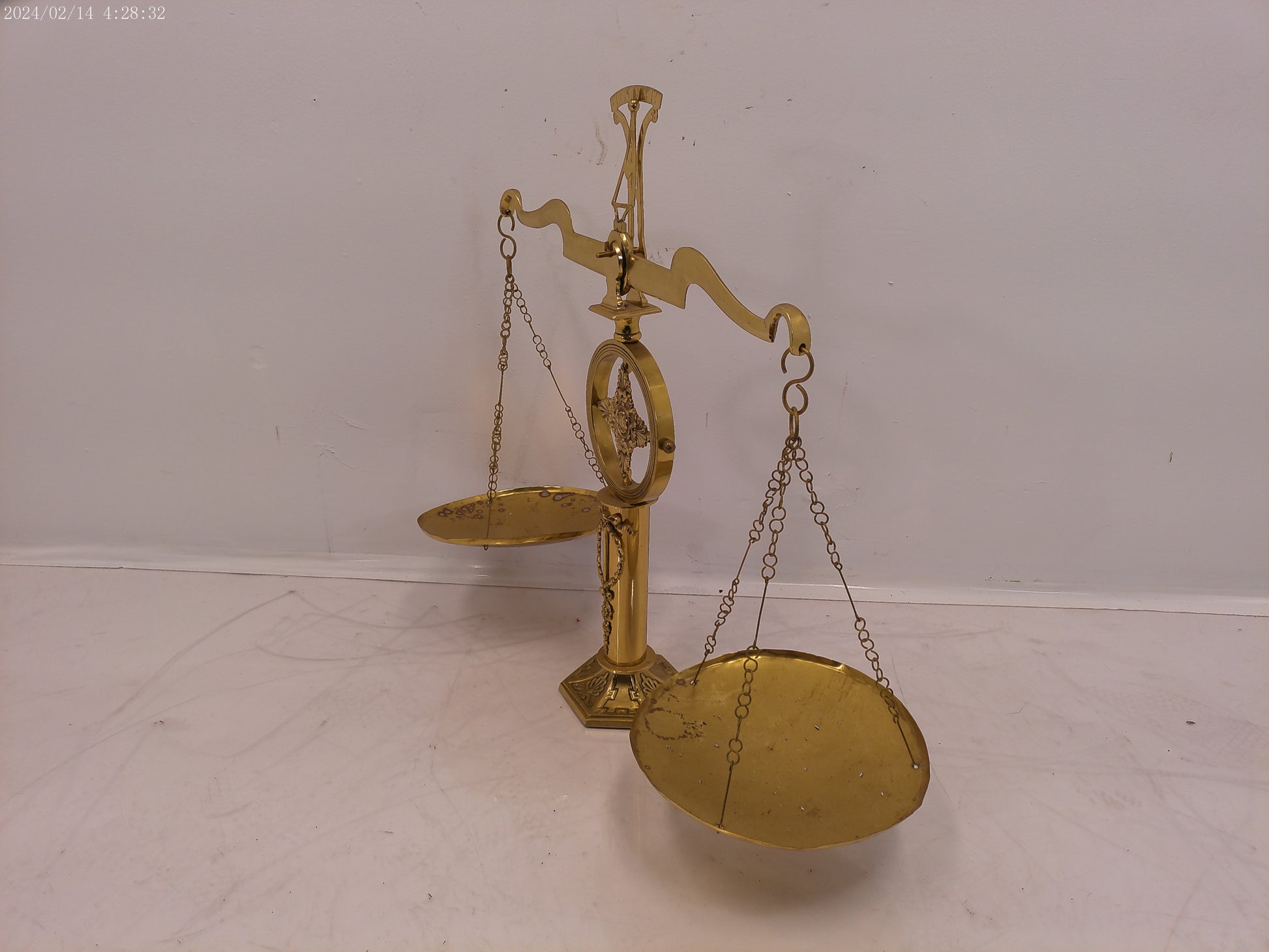 This antique brass scale of justice, made of solid brass and designed in a large lawyer scale style, is the perfect addition to any law office or legal collection. The intricate details and high-quality materials make it a unique and valuable piece for both decorative and practical use.