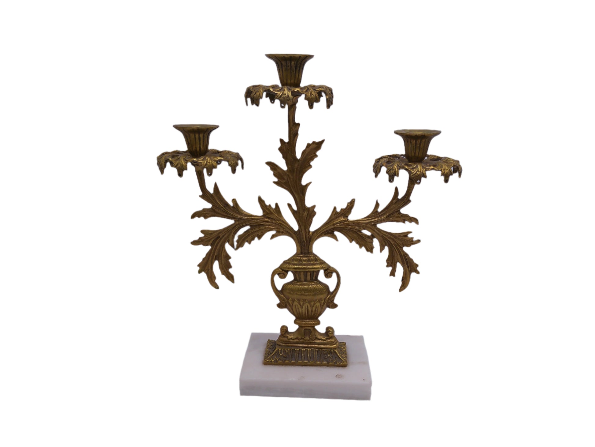 Enhance the ambiance of any room with the Antique Gilt Goddess Fortuna Triple Girandole Candelabra. Crafted with a marble base, this candelabra features an intricate design of the goddess Fortuna, believed to bring good fortune. With three candle stands, it provides both functionality and elegance to your space.