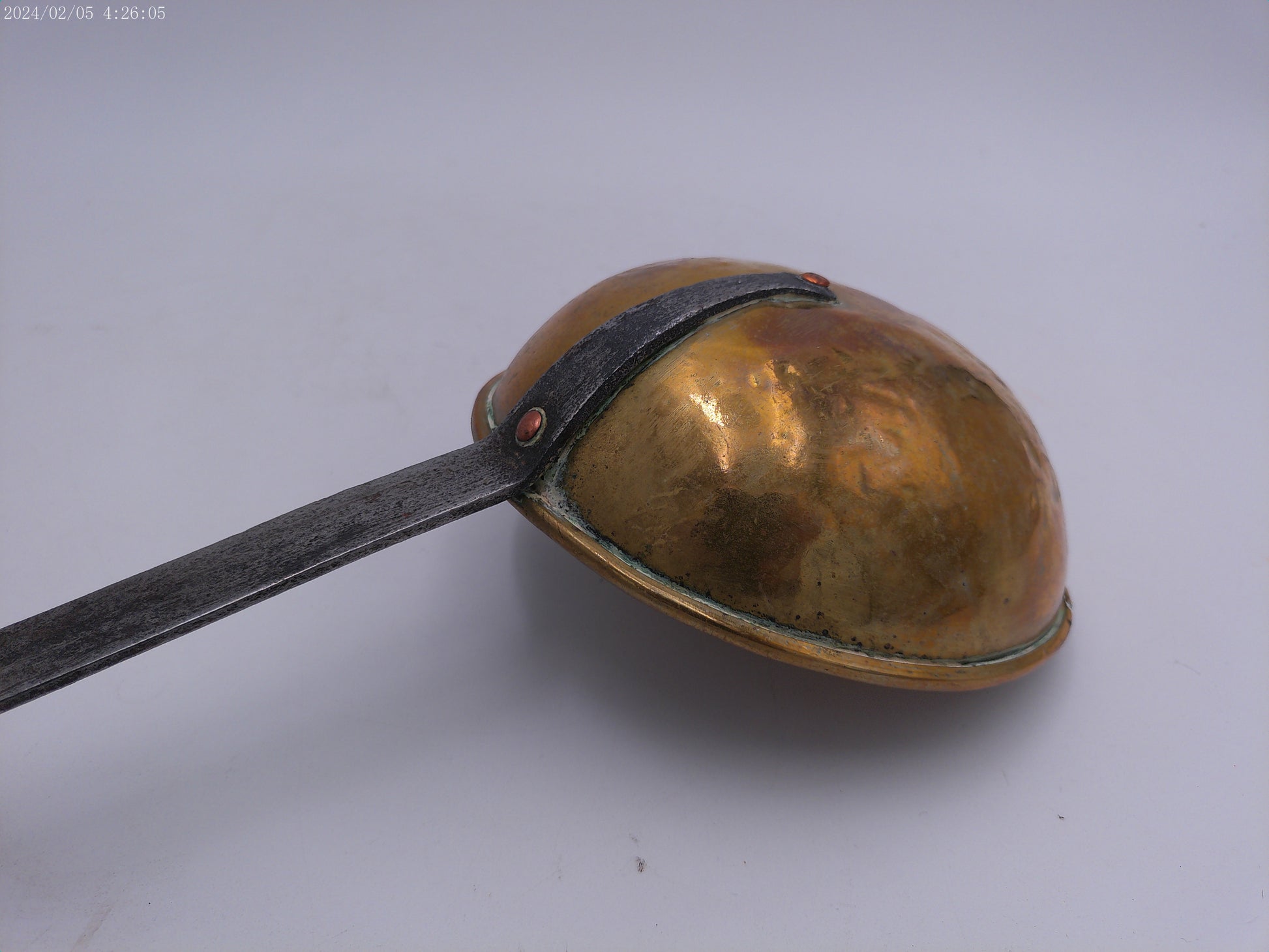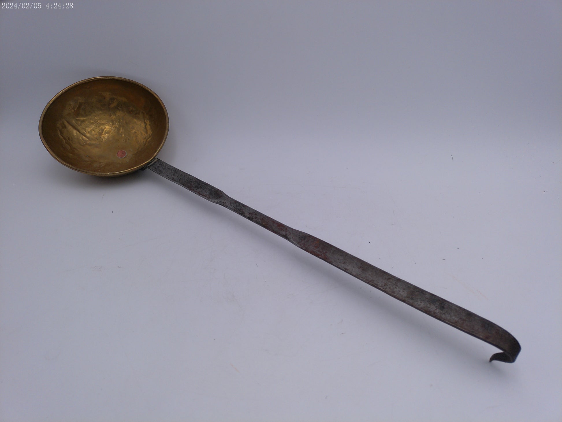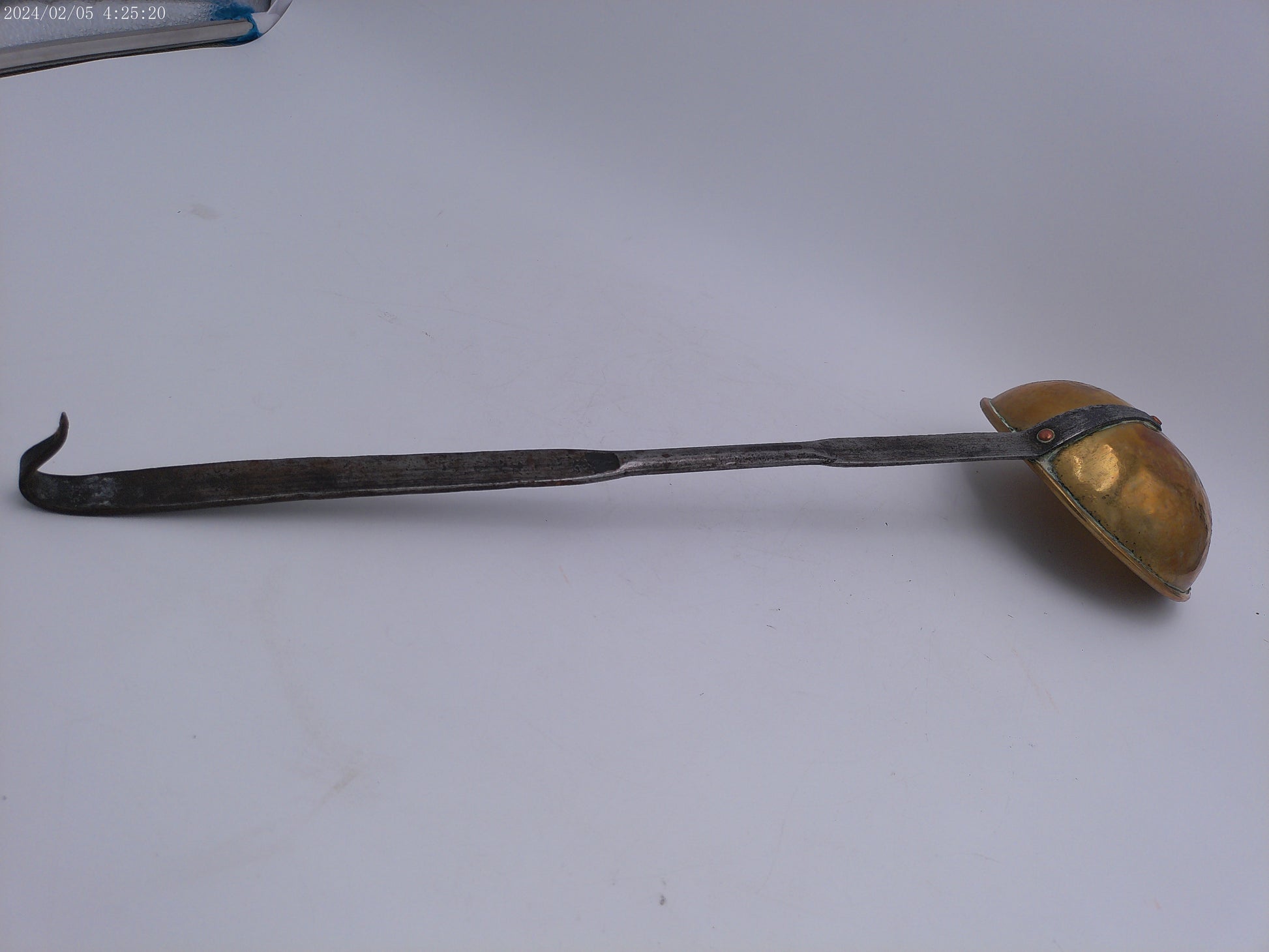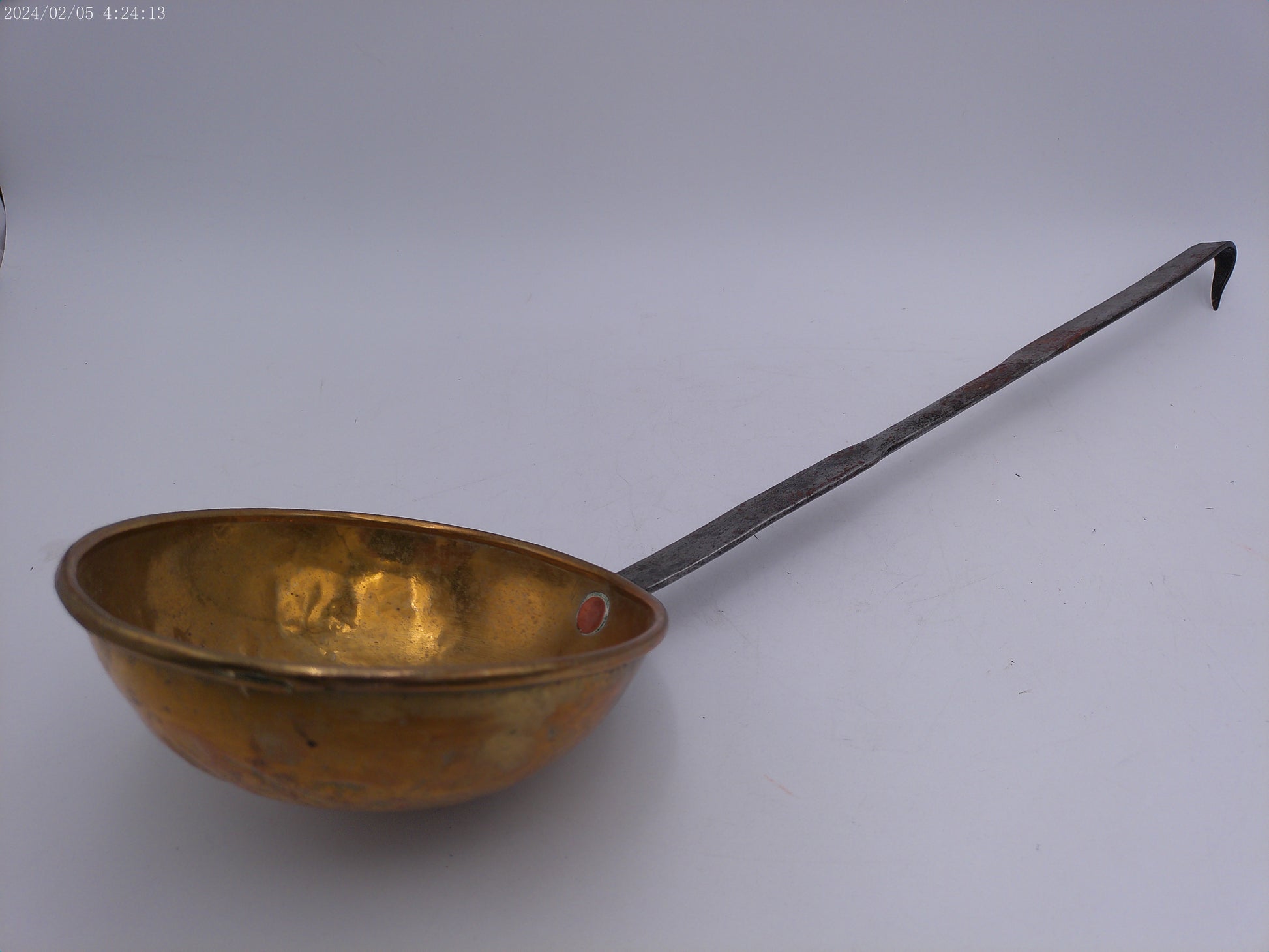 This Antique Hand Forged Wrought Iron & Brass Ladle Dipper with a 21.5" Hook Hanger is a beautiful and durable addition to any kitchen or fireplace. Its handcrafted design showcases the expert craftsmanship of the era. The perfect blend of form and function, this ladle dipper is a must-have for any vintage enthusiast.