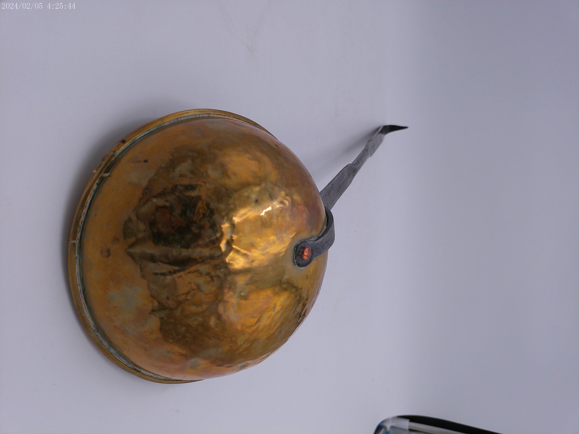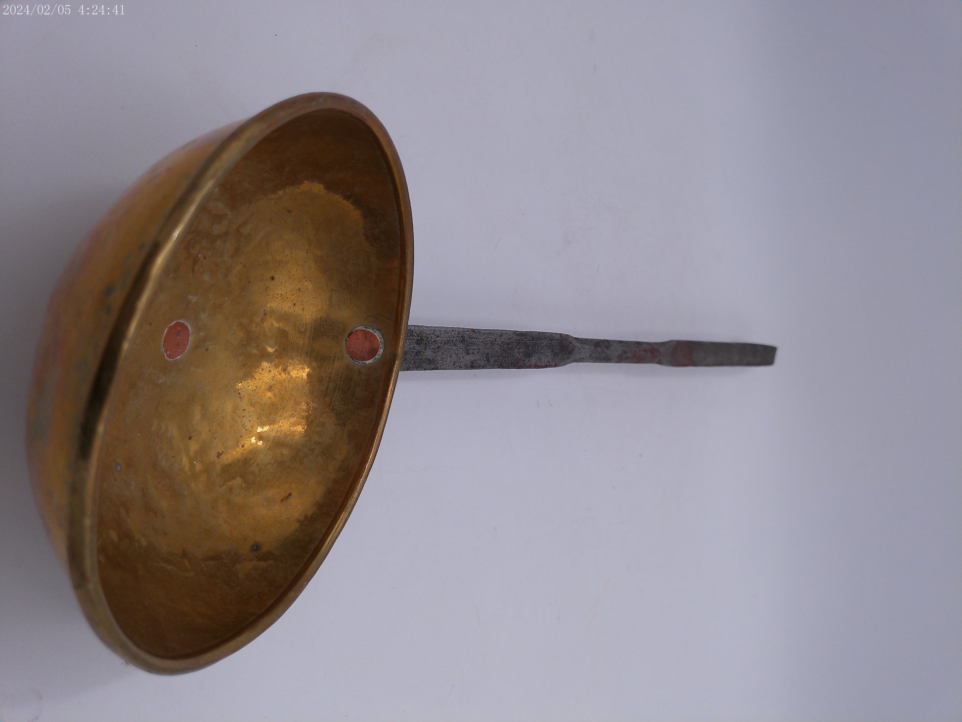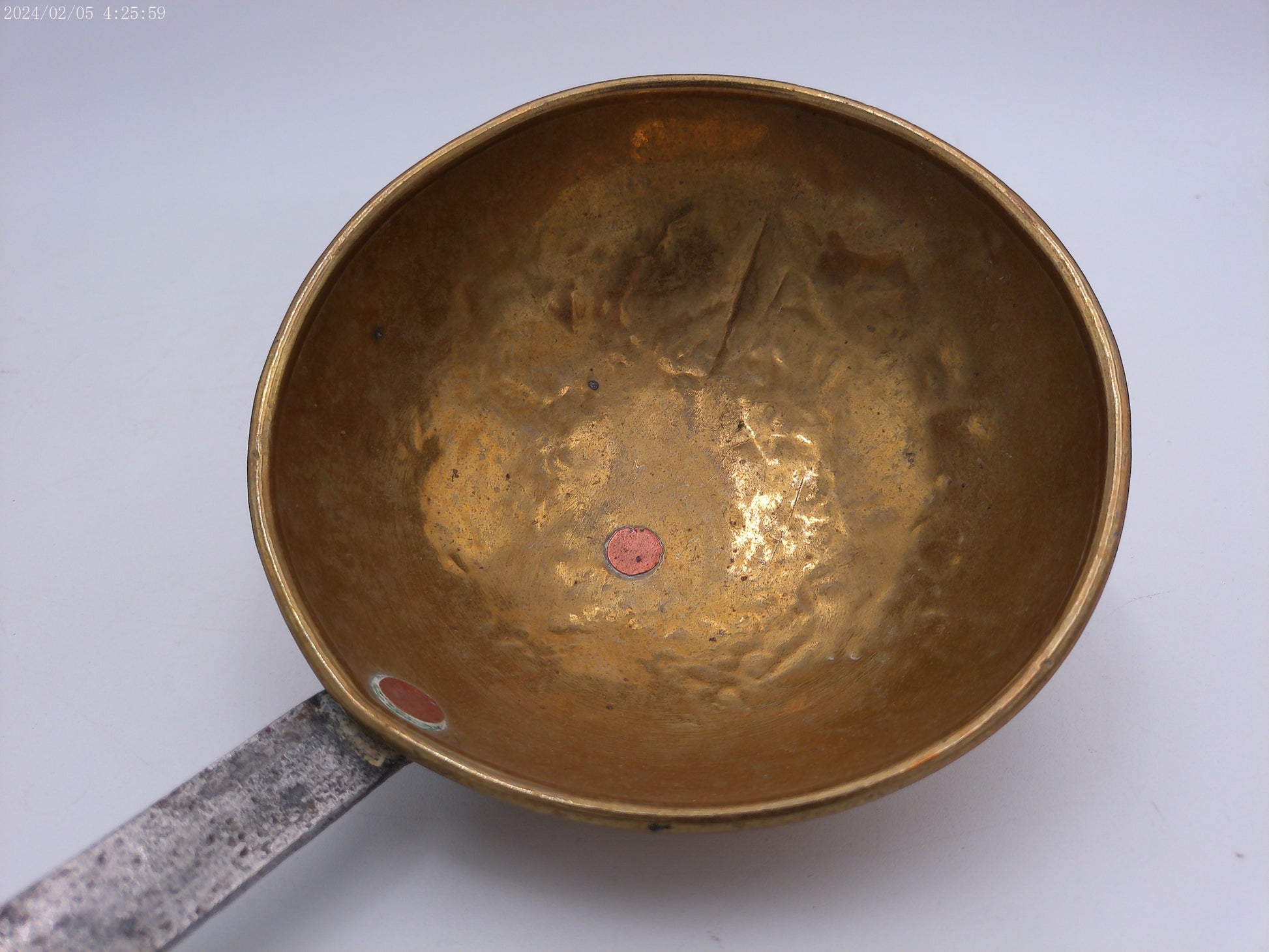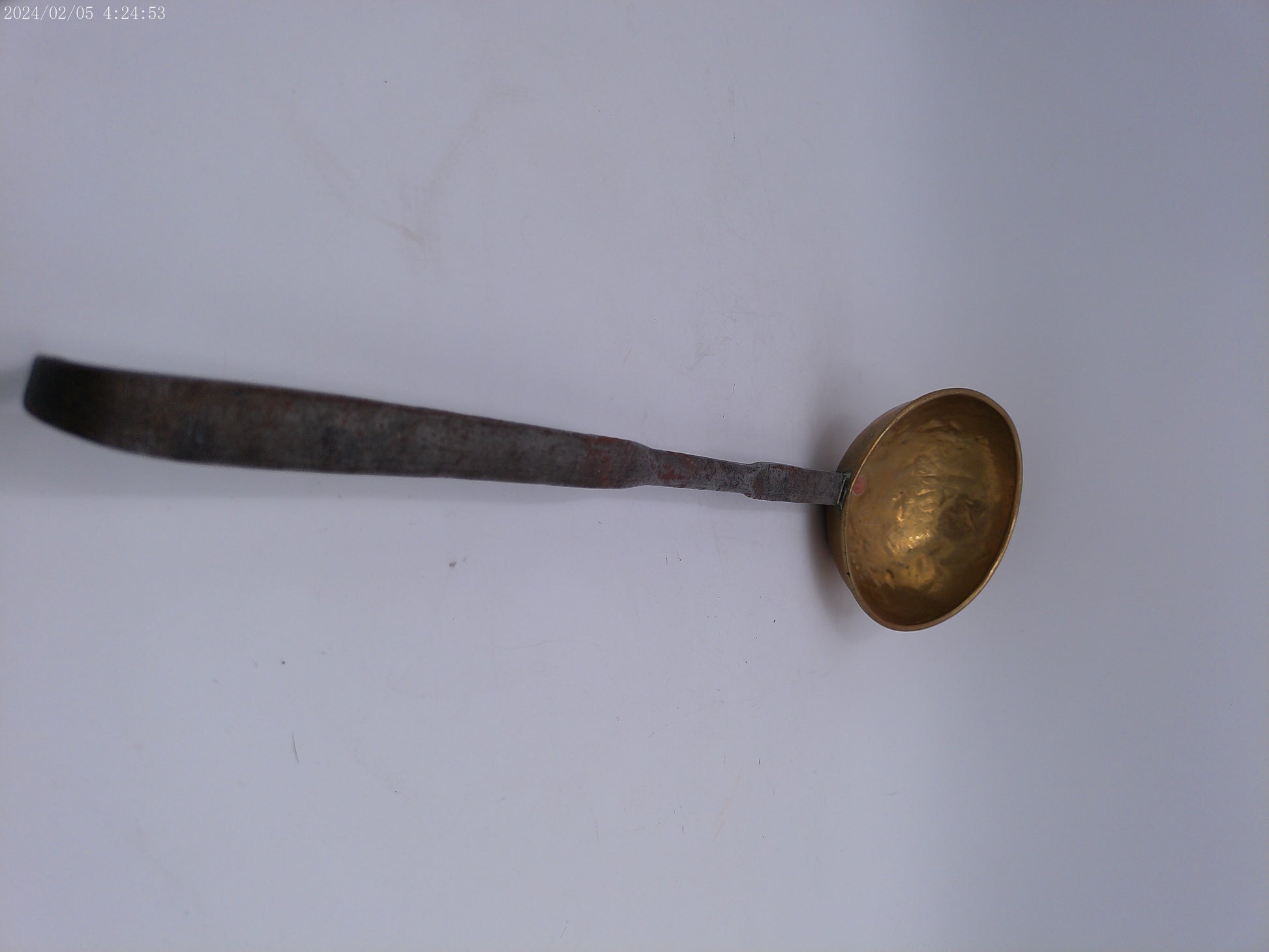 This Antique Hand Forged Wrought Iron & Brass Ladle Dipper with a 21.5" Hook Hanger is a beautiful and durable addition to any kitchen or fireplace. Its handcrafted design showcases the expert craftsmanship of the era. The perfect blend of form and function, this ladle dipper is a must-have for any vintage enthusiast.