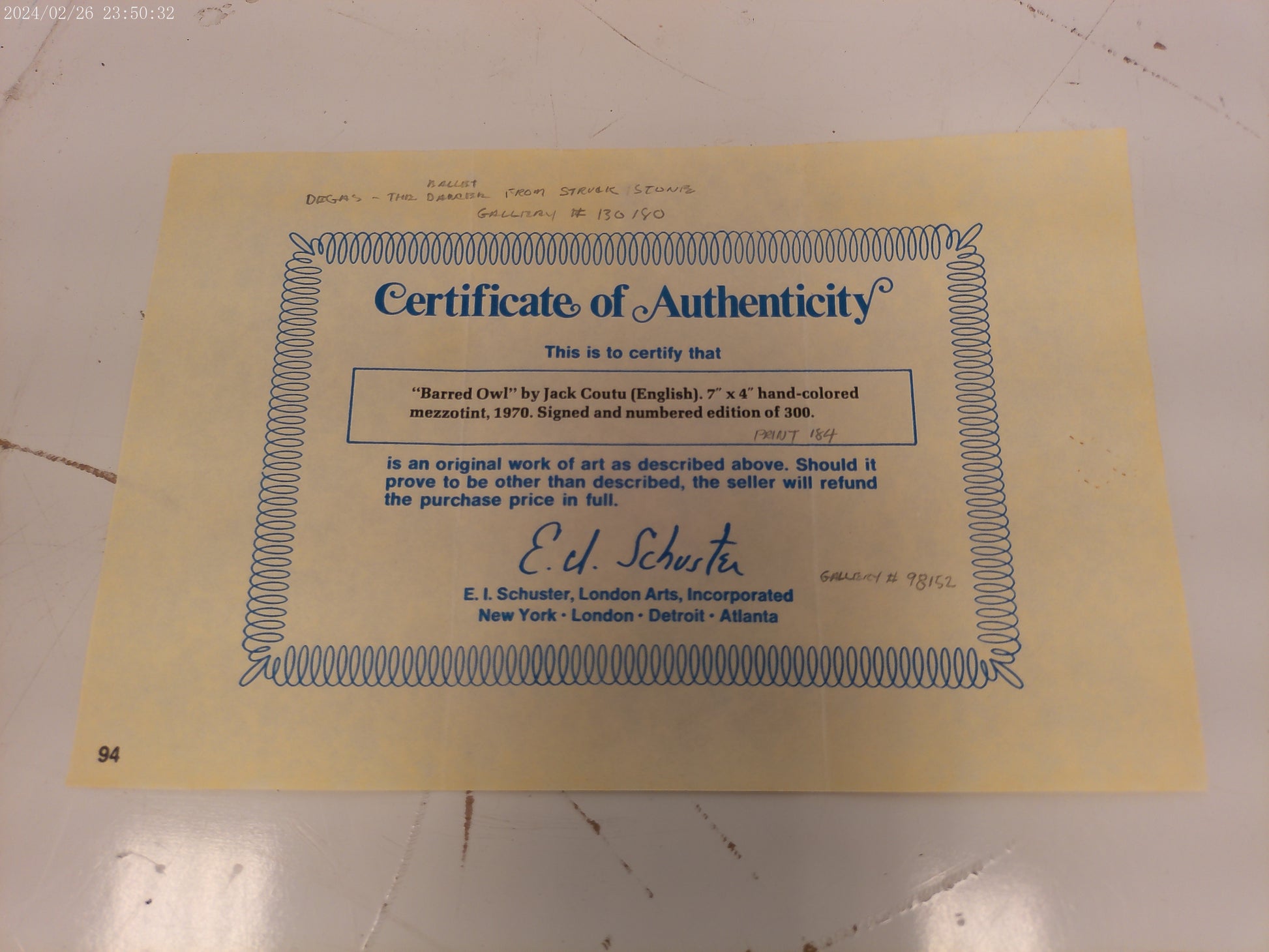 This signed print by Jack Coutu features a stunning depiction of a barn owl. With exquisite detail and expert artistry, this piece will bring a touch of nature and beauty to any room. Own a unique and valuable piece of art by this talented artist. Add to your collection today.