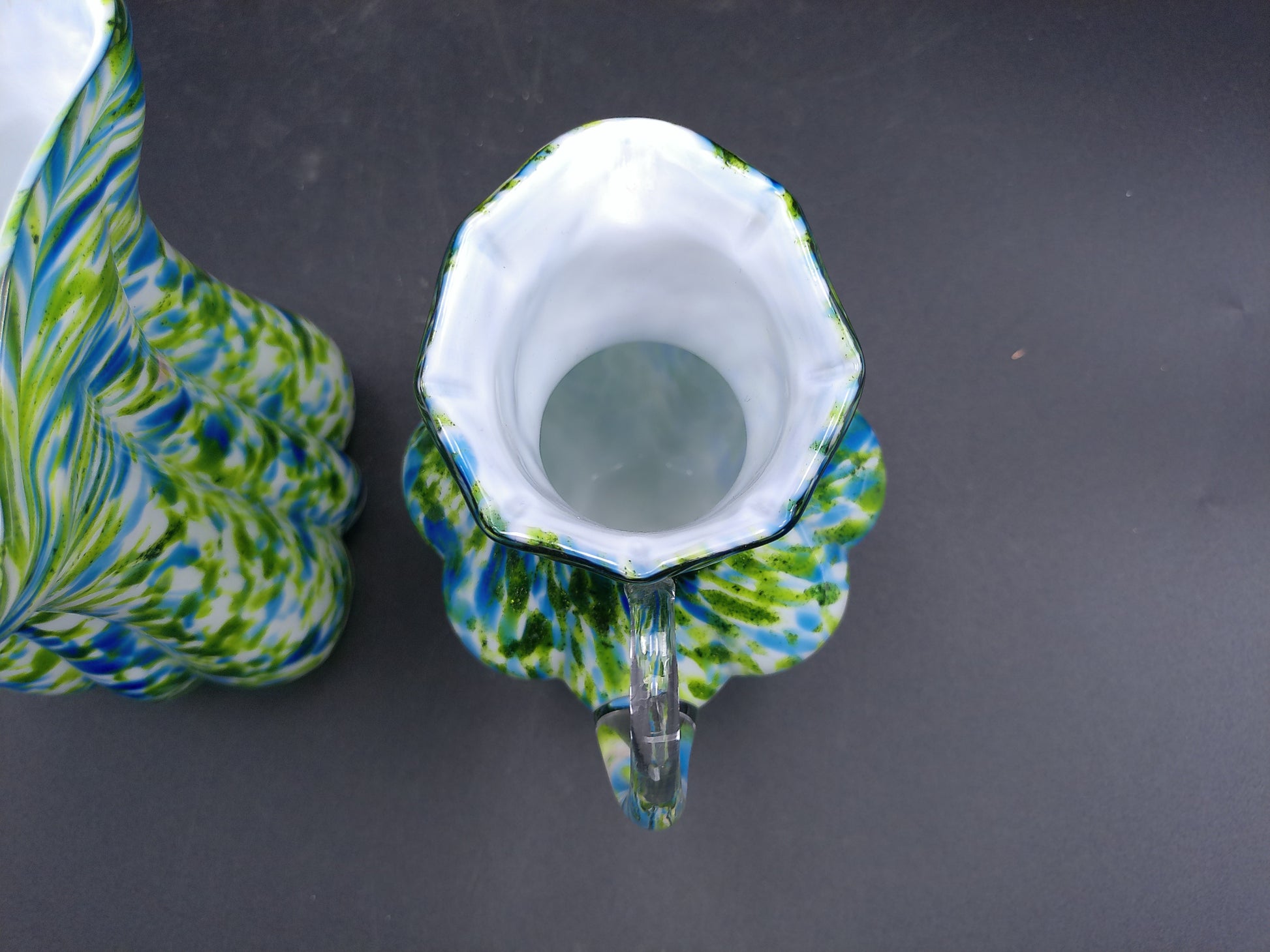Elevate your home decor with our stunning Art Glass Porcelain Green Large Pitcher, adorned with mesmerizing Blue Aventurine. Its elegant design and vibrant colors will add a touch of sophistication to any space. Perfect as a centerpiece or for serving your favorite beverages. Elevate your space with this artistic and functional piece.