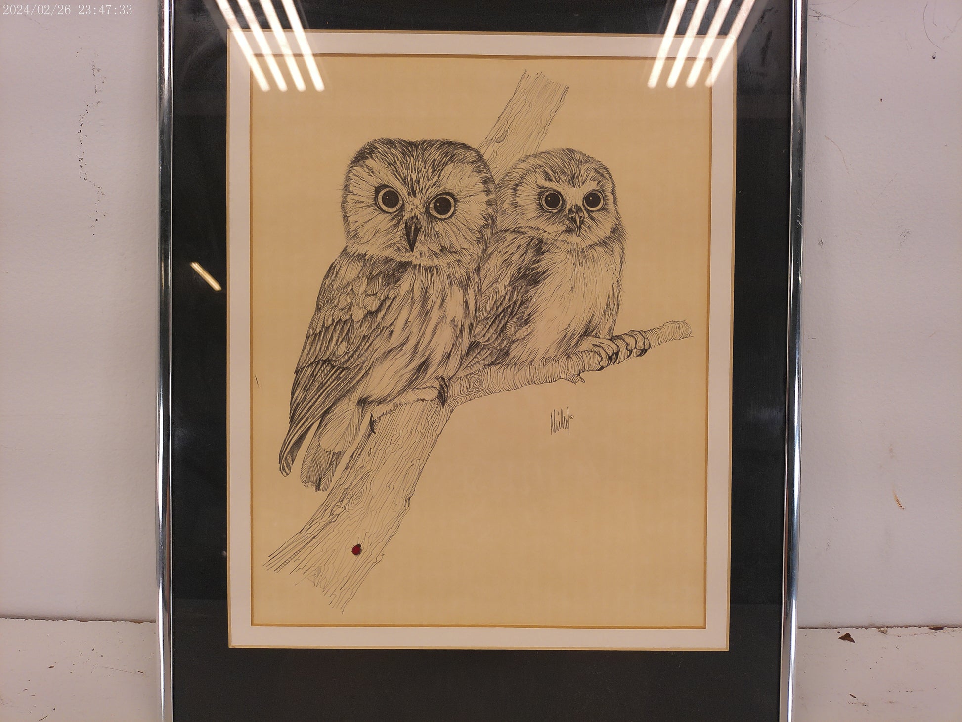Art Pair of Owls Painting Signed Metal Frmaw with Glass