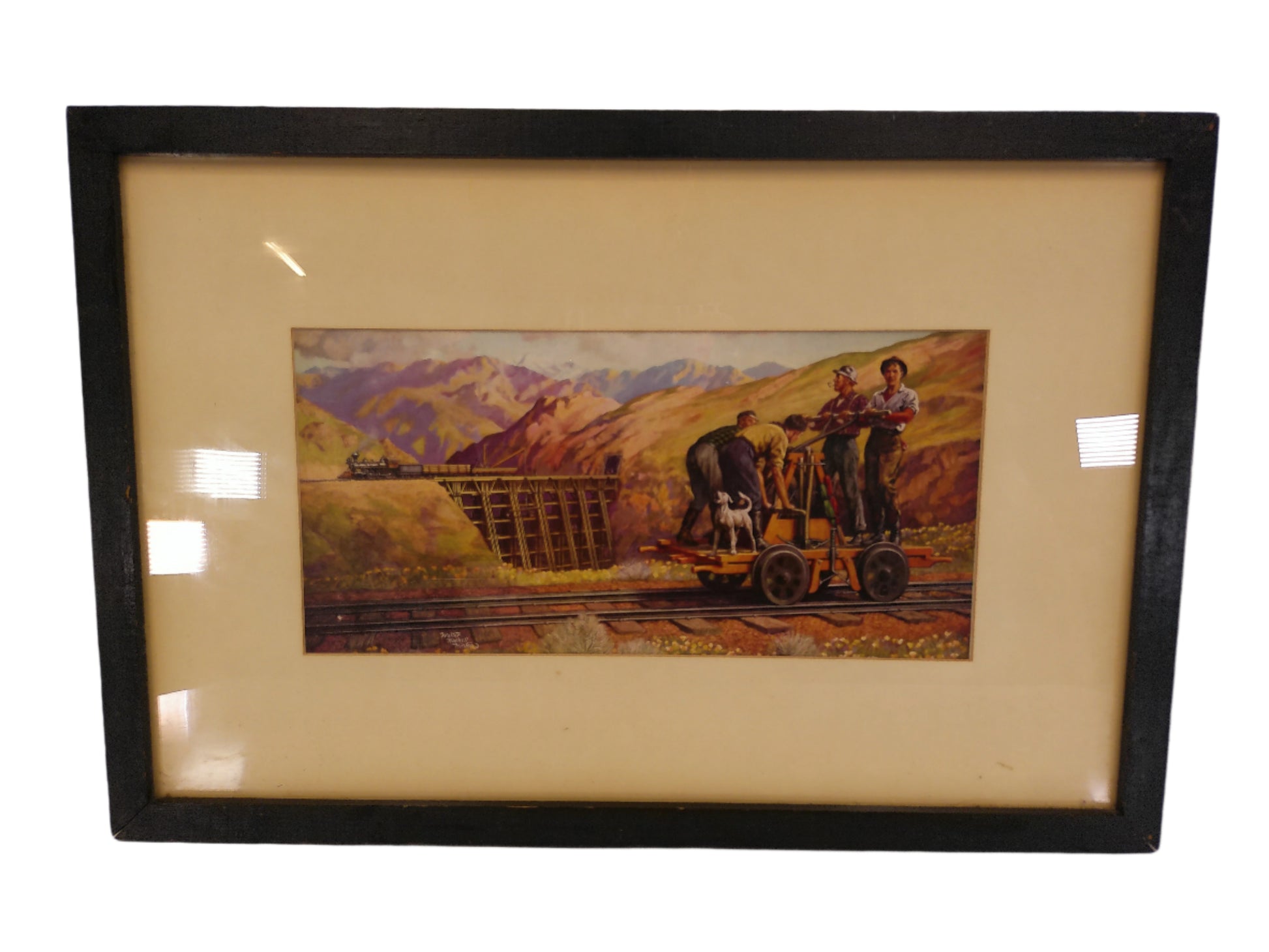 Art Railroad Picture of Men on a Cart Wood Frame with Glass
