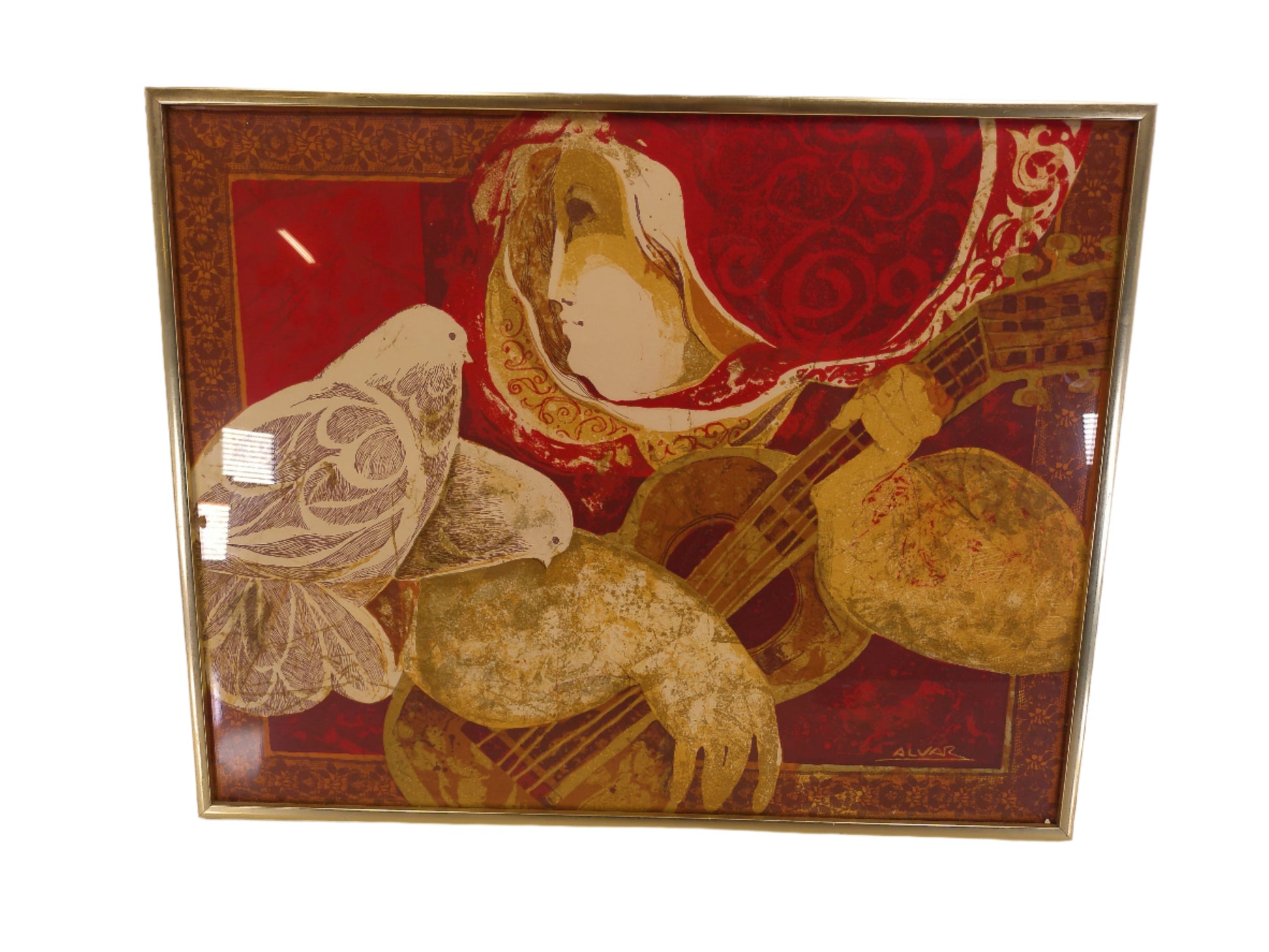 Art Spanish Artist Sunol Alvar The Guitarist and The Pigeons Framed Lithograph