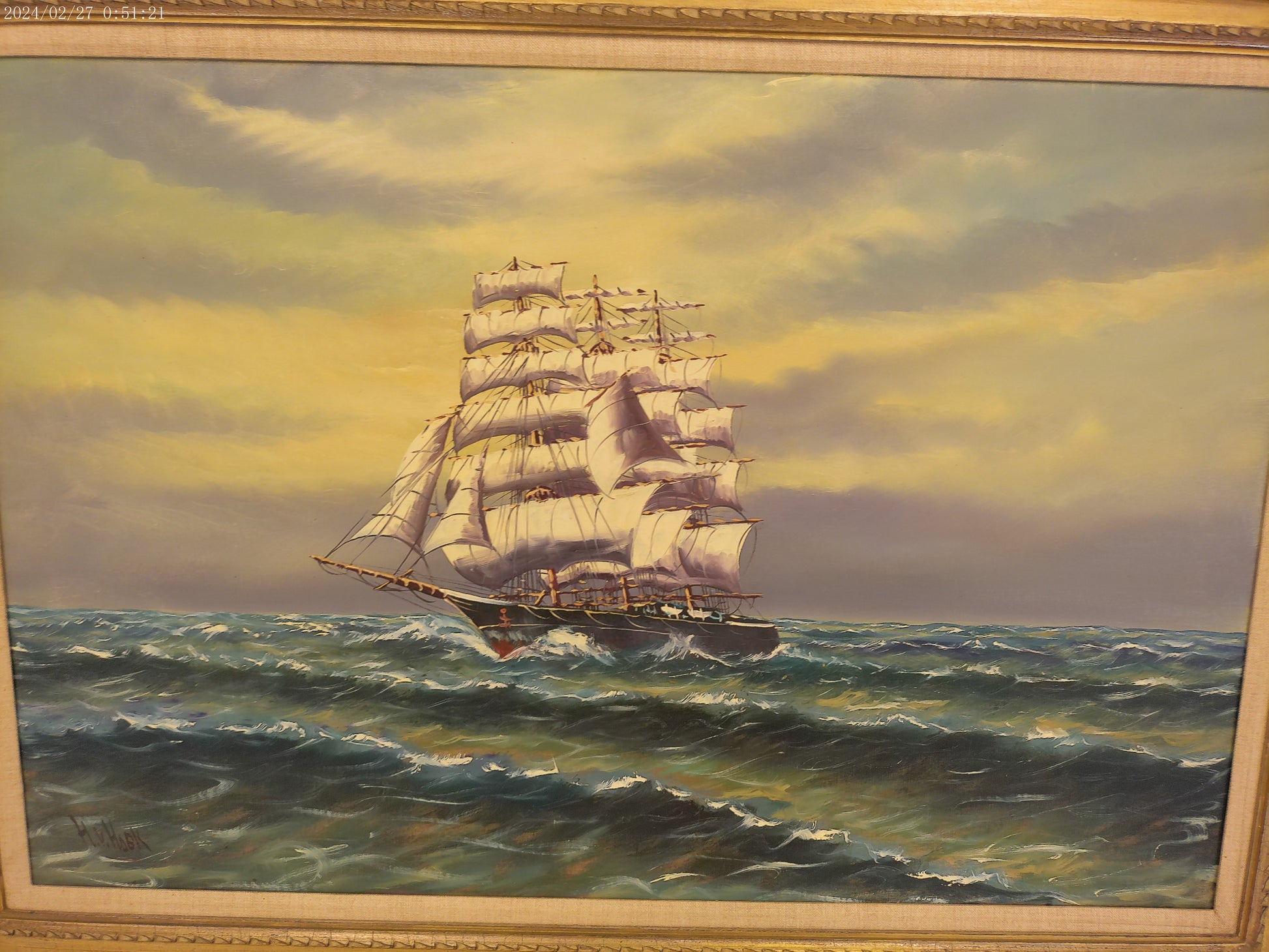 Art Vintage Sailboat Oil Painting Clipper Ship H.W. Hook