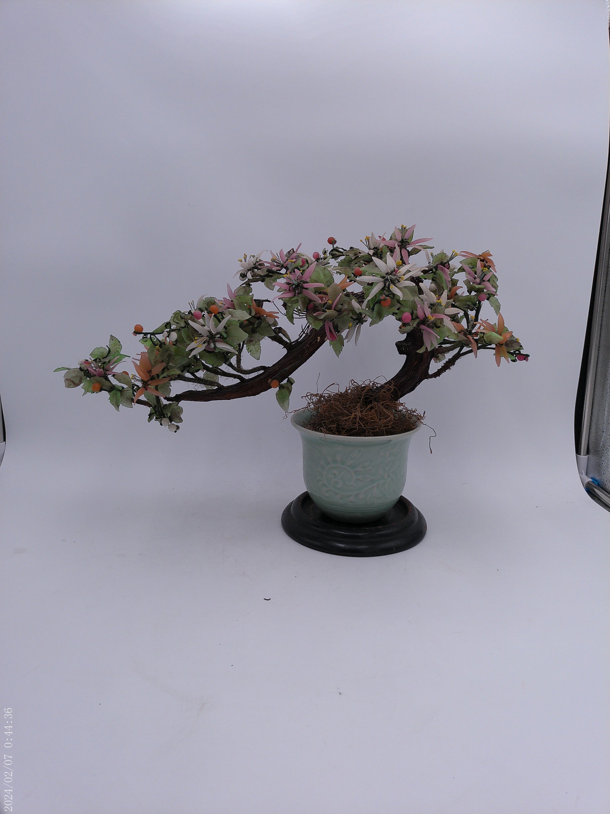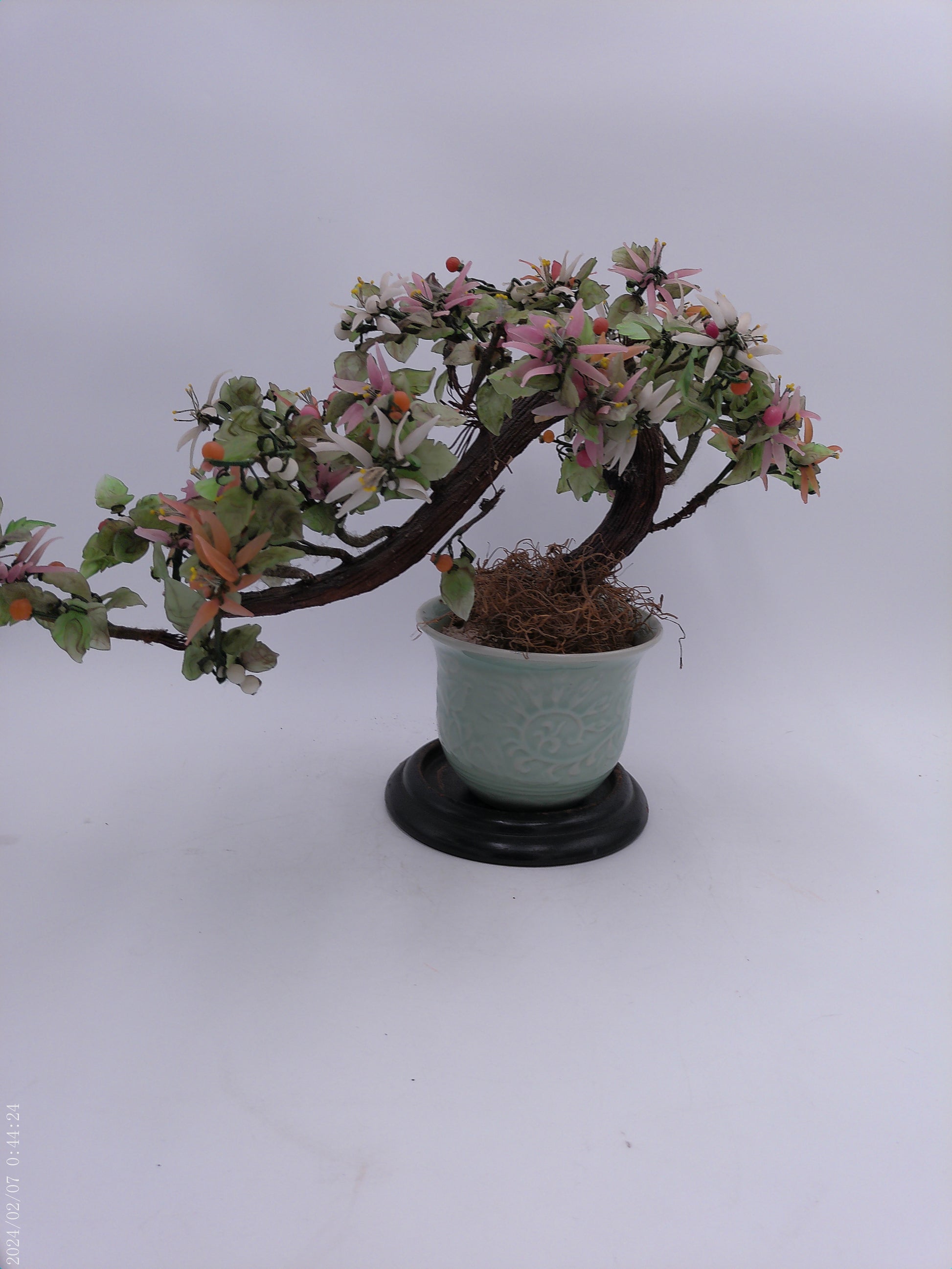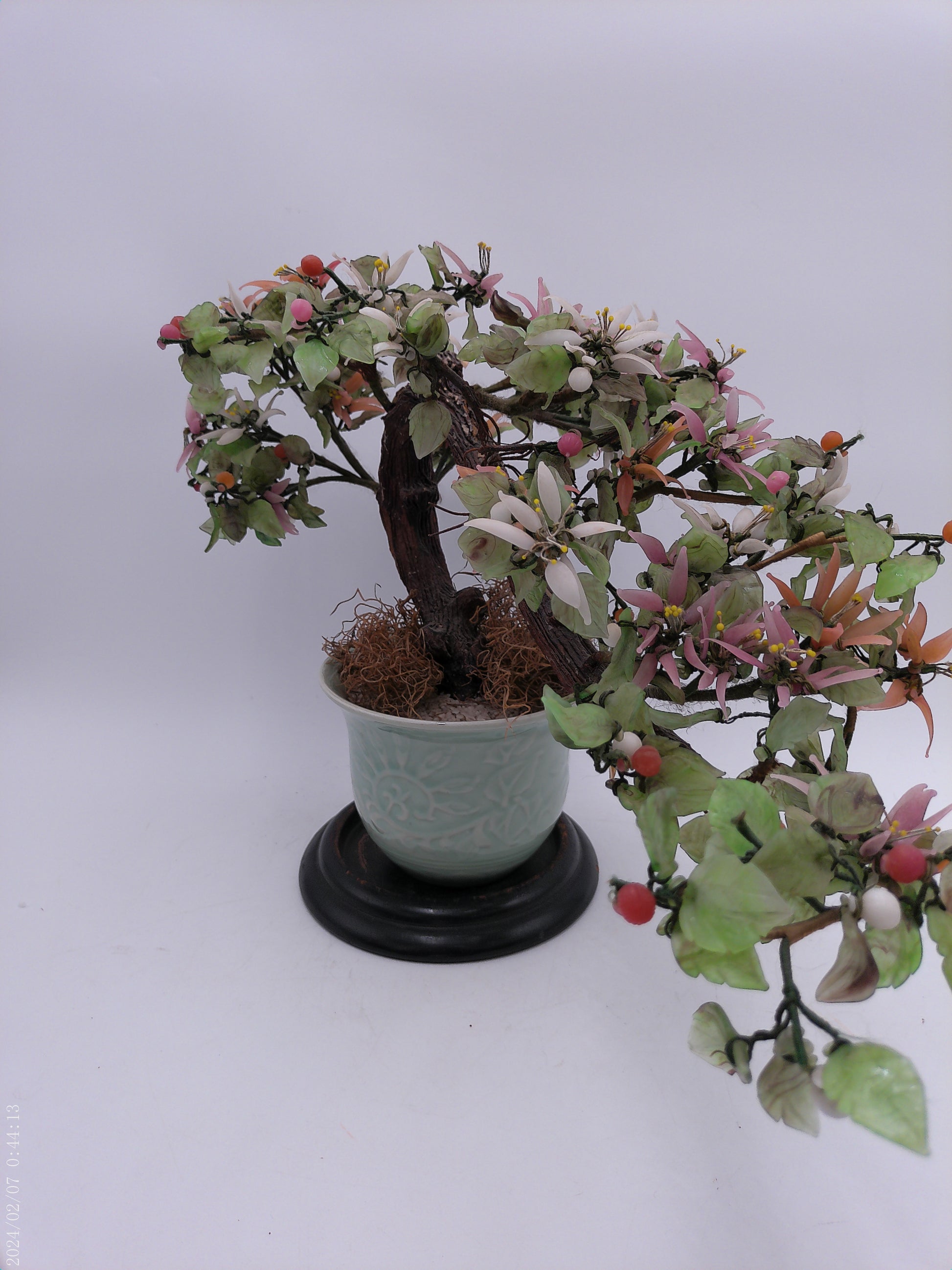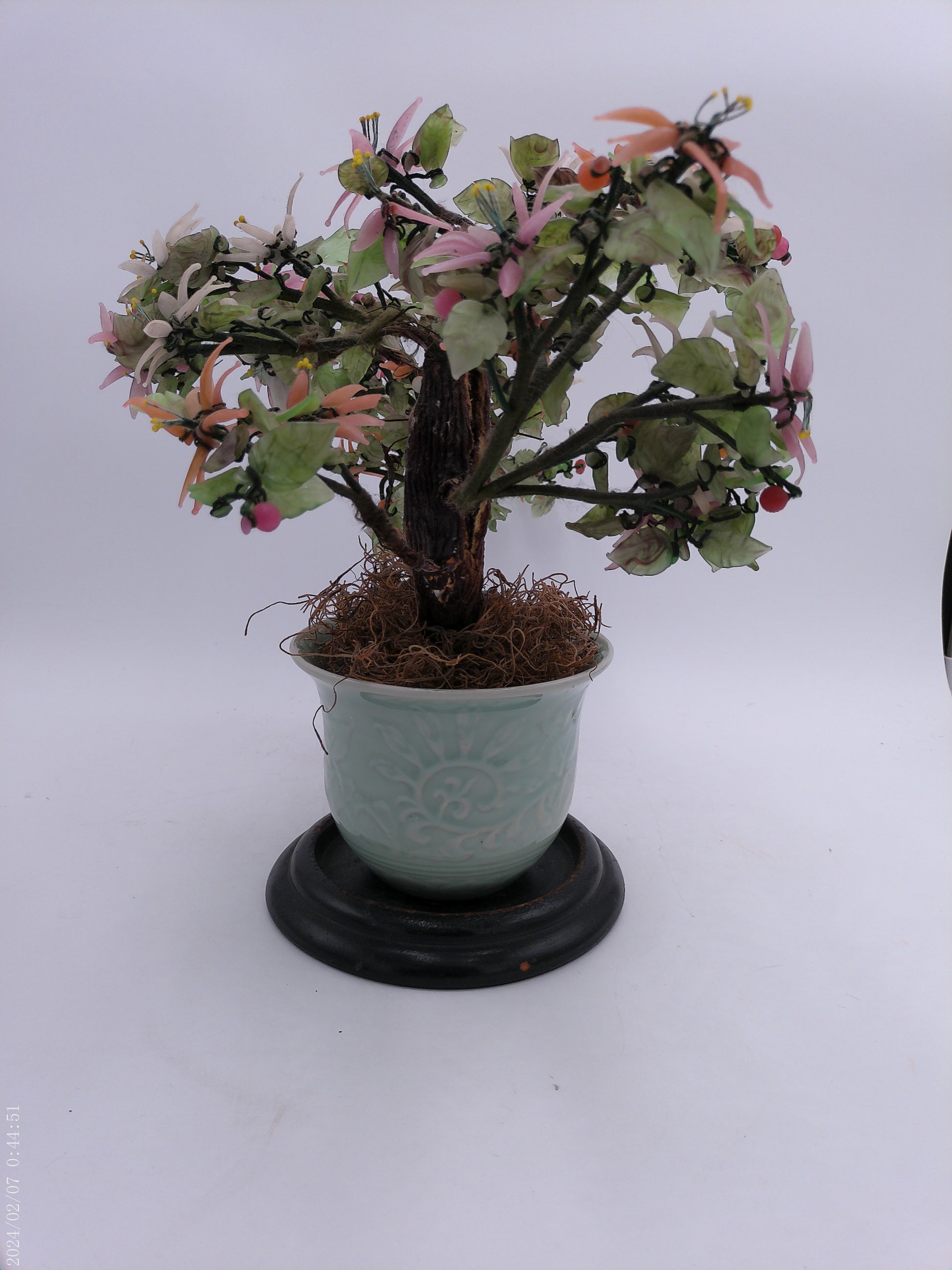 Expertly crafted with stunning attention to detail, this Asian hardstone bonsai form jade tree is a must-have for any home garden or office space. The delicate pink, salmon-colored, and white blossoms and buds add a touch of elegance to the celadon green ceramic pot, creating a peaceful and serene atmosphere wherever it is placed. With its unique combination of beauty and tranquility, this bonsai tree is the perfect addition to any interior design.