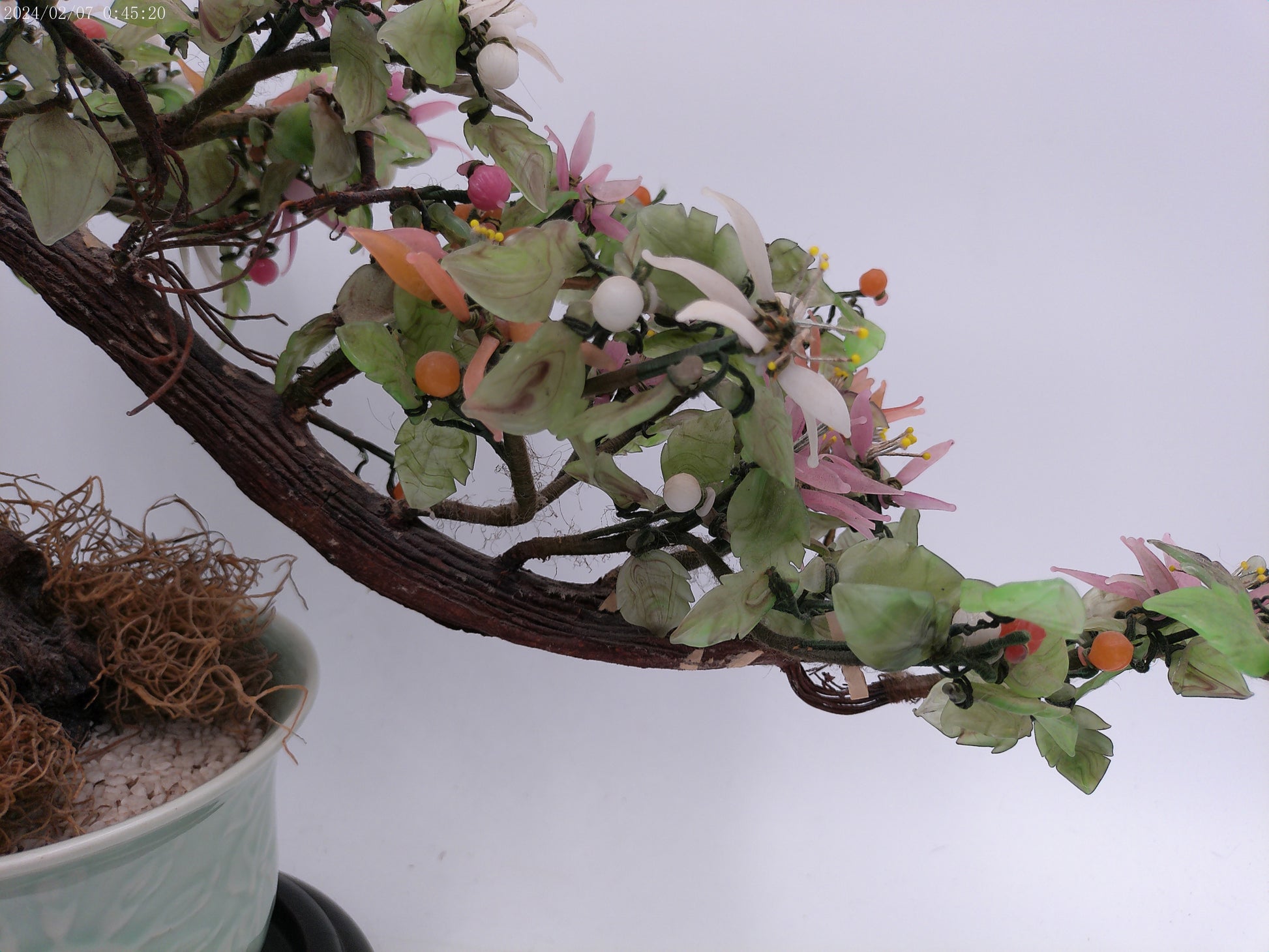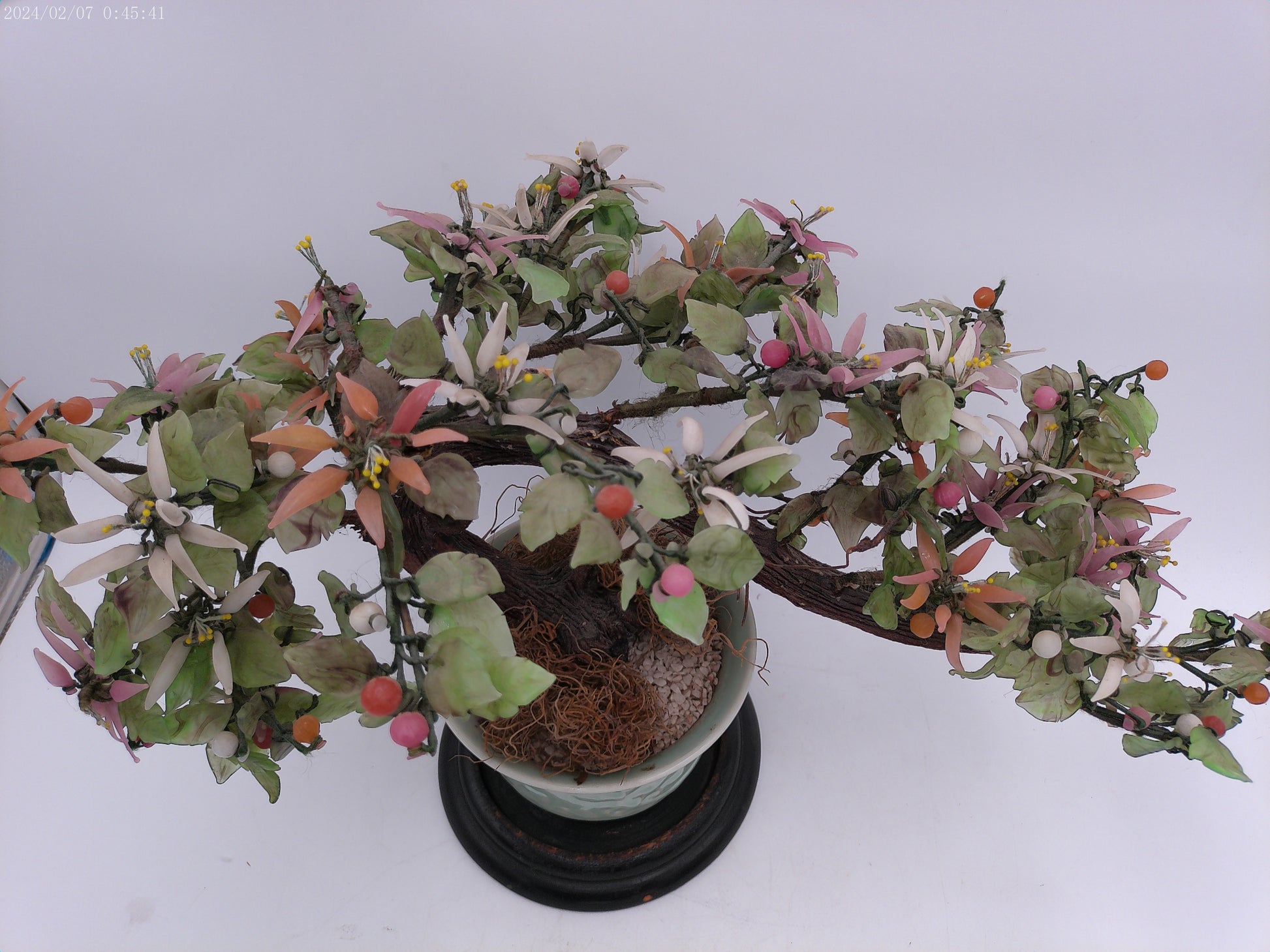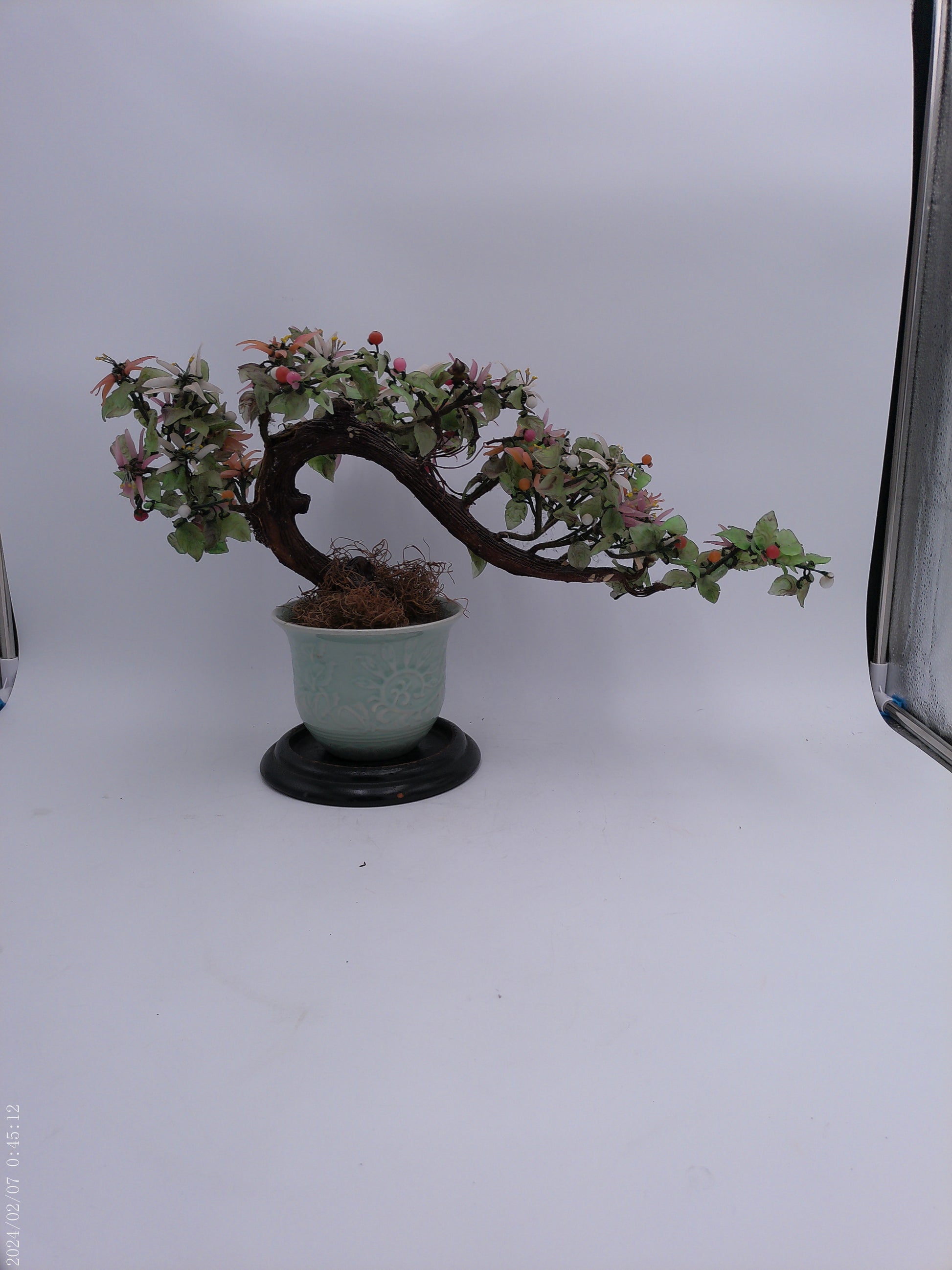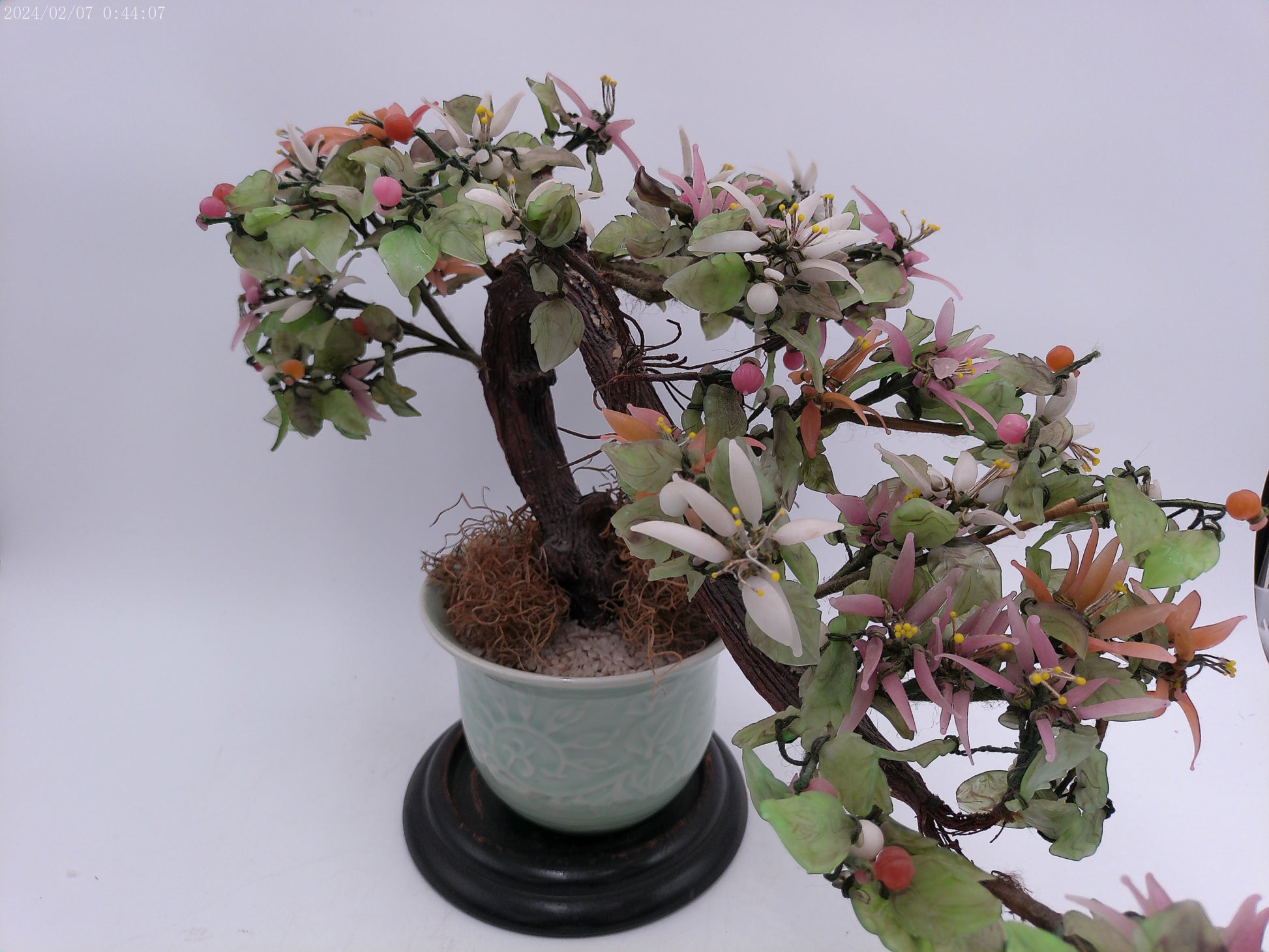 Expertly crafted with stunning attention to detail, this Asian hardstone bonsai form jade tree is a must-have for any home garden or office space. The delicate pink, salmon-colored, and white blossoms and buds add a touch of elegance to the celadon green ceramic pot, creating a peaceful and serene atmosphere wherever it is placed. With its unique combination of beauty and tranquility, this bonsai tree is the perfect addition to any interior design.