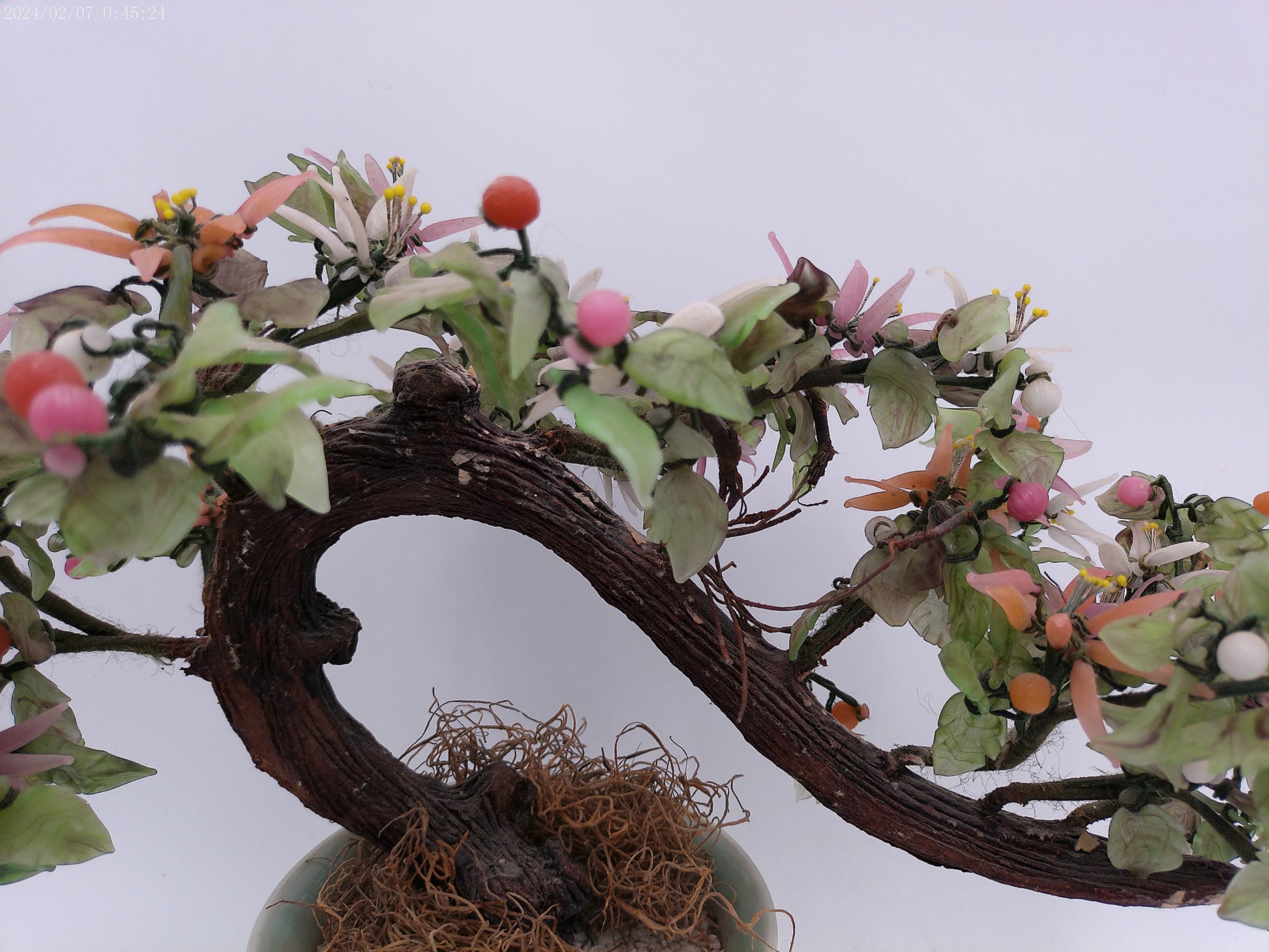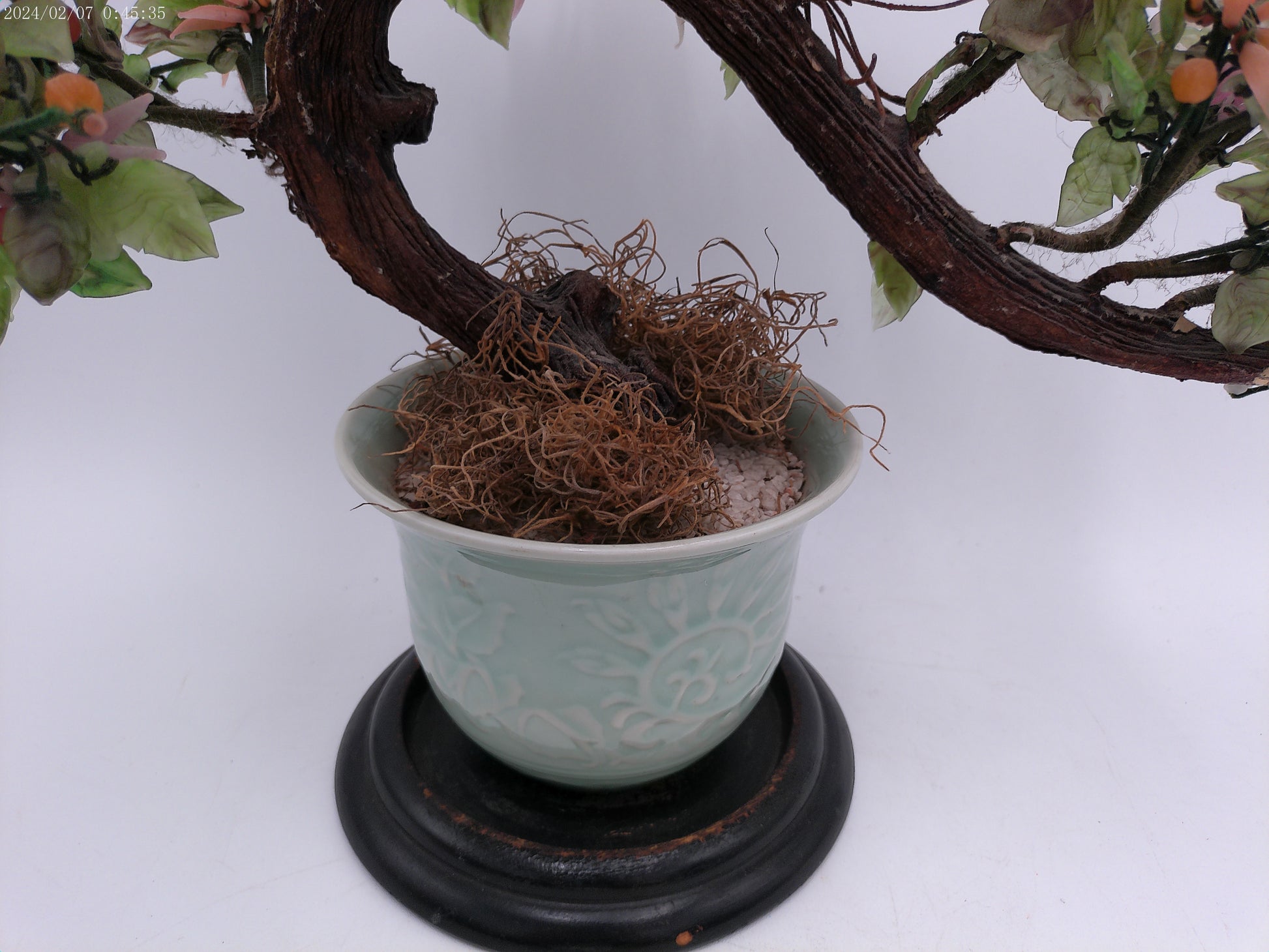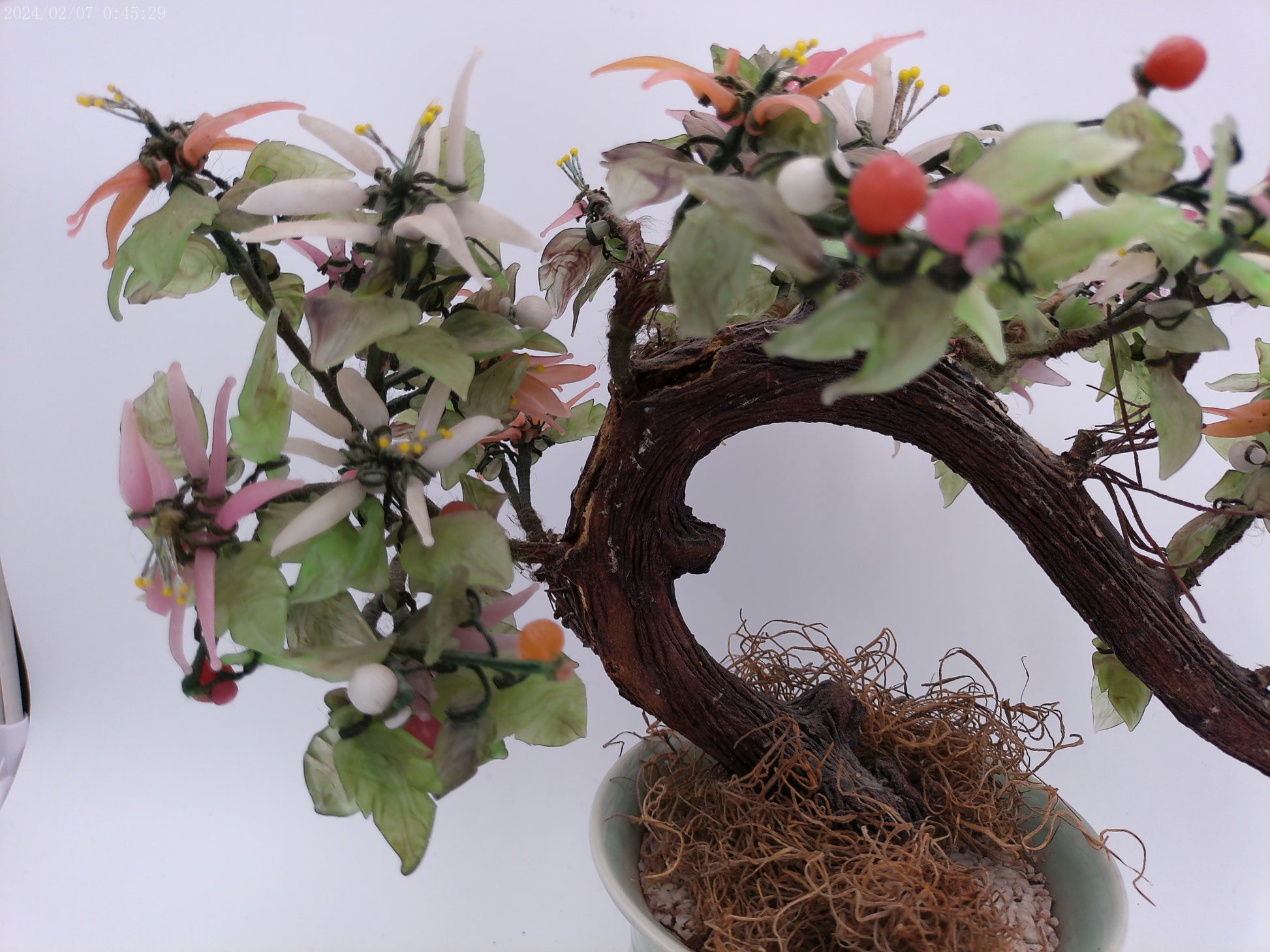 Asian hardstone bonsai form jade tree with pink salmon-colored ceramic pot