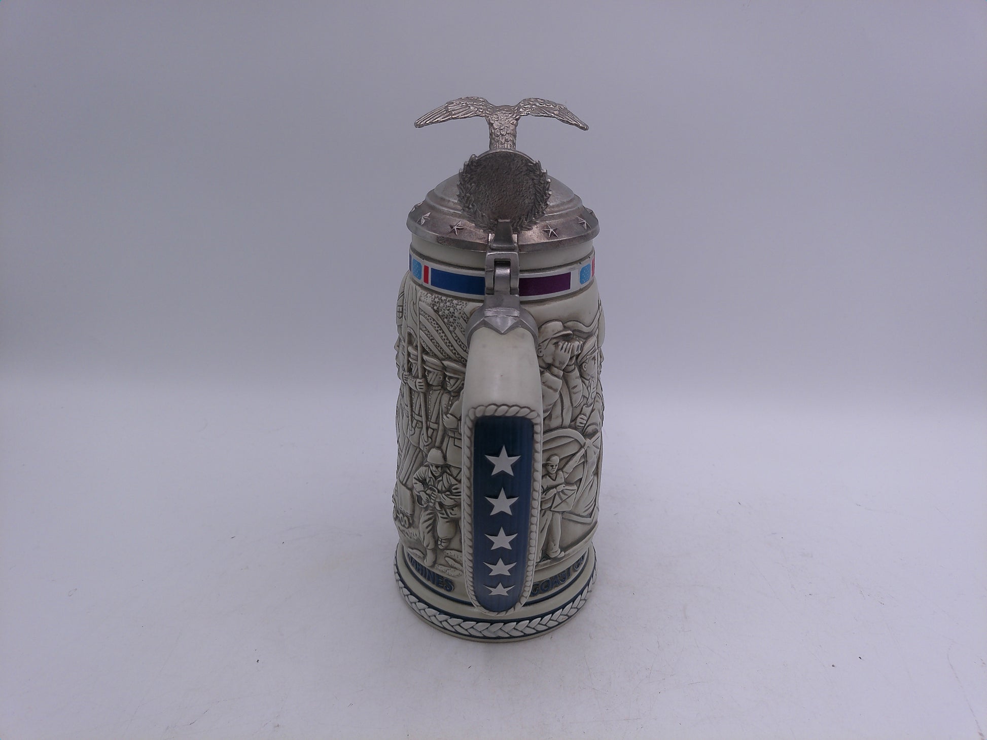 Celebrate the bravery of the American Armed Forces with this stunning Beer Stein from Avon. Made in 1990, this limited edition collector's item features intricate detailing and comes with its original box. A perfect addition to any collection or a thoughtful gift for a military enthusiast.