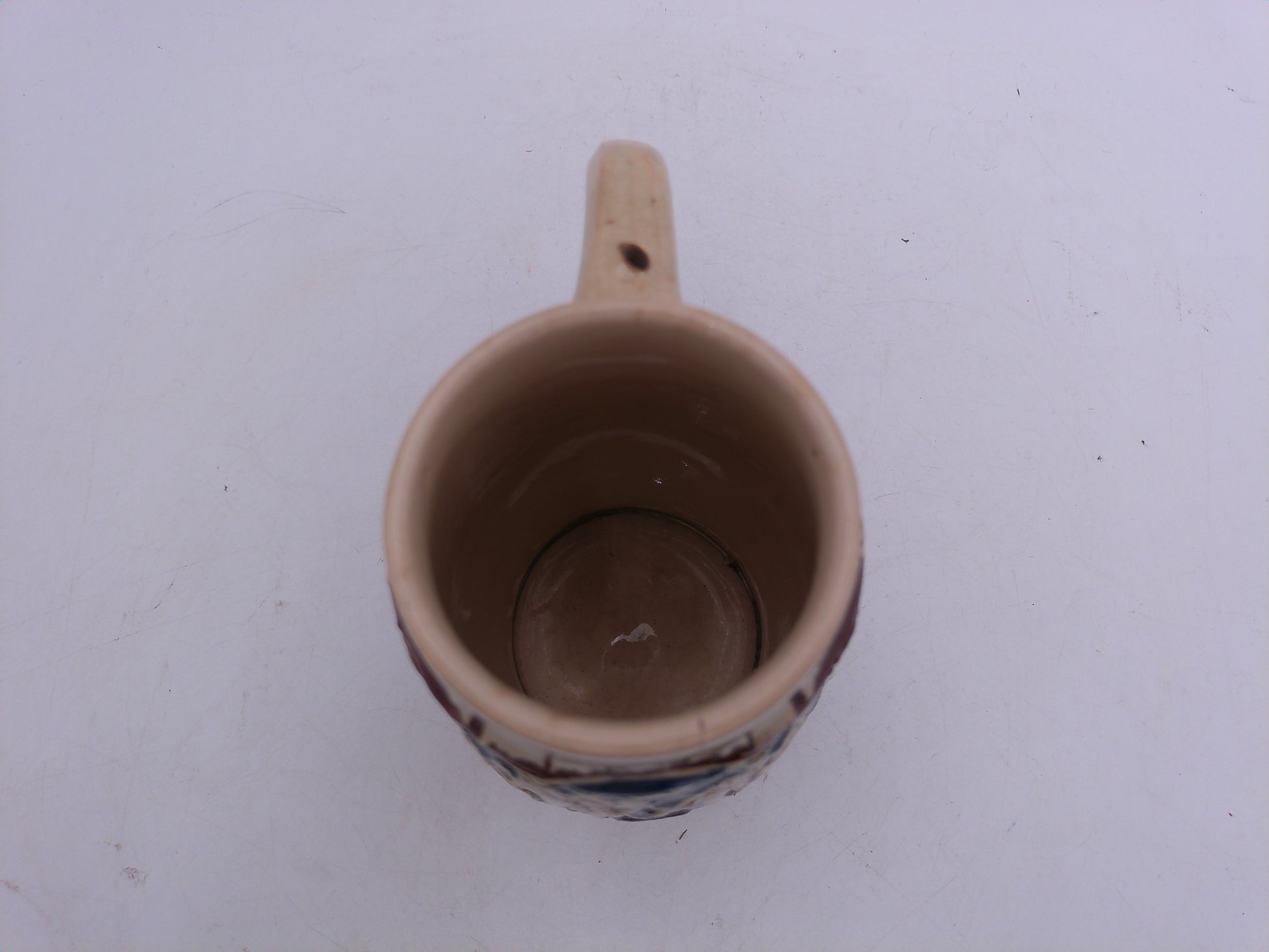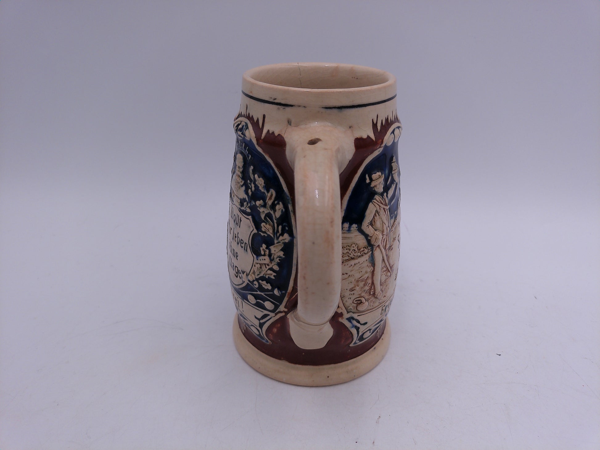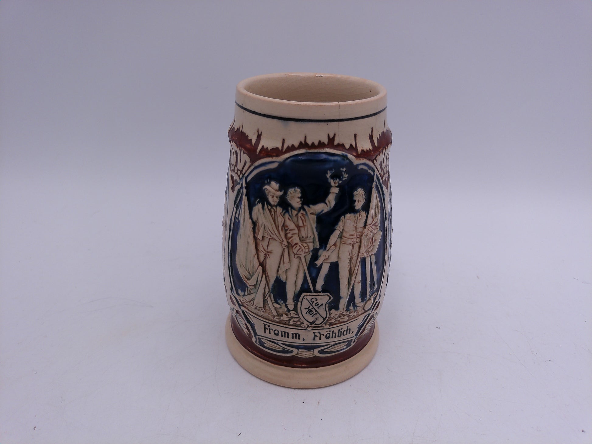 Expertly crafted in Germany, this vintage beer stein boasts a charming small crack for added character. A must-have for any beer connoisseur, this piece is perfect for displaying and enjoying your favorite brew. Elevate your drinking experience with this unique, one-of-a-kind stein. Cheers!