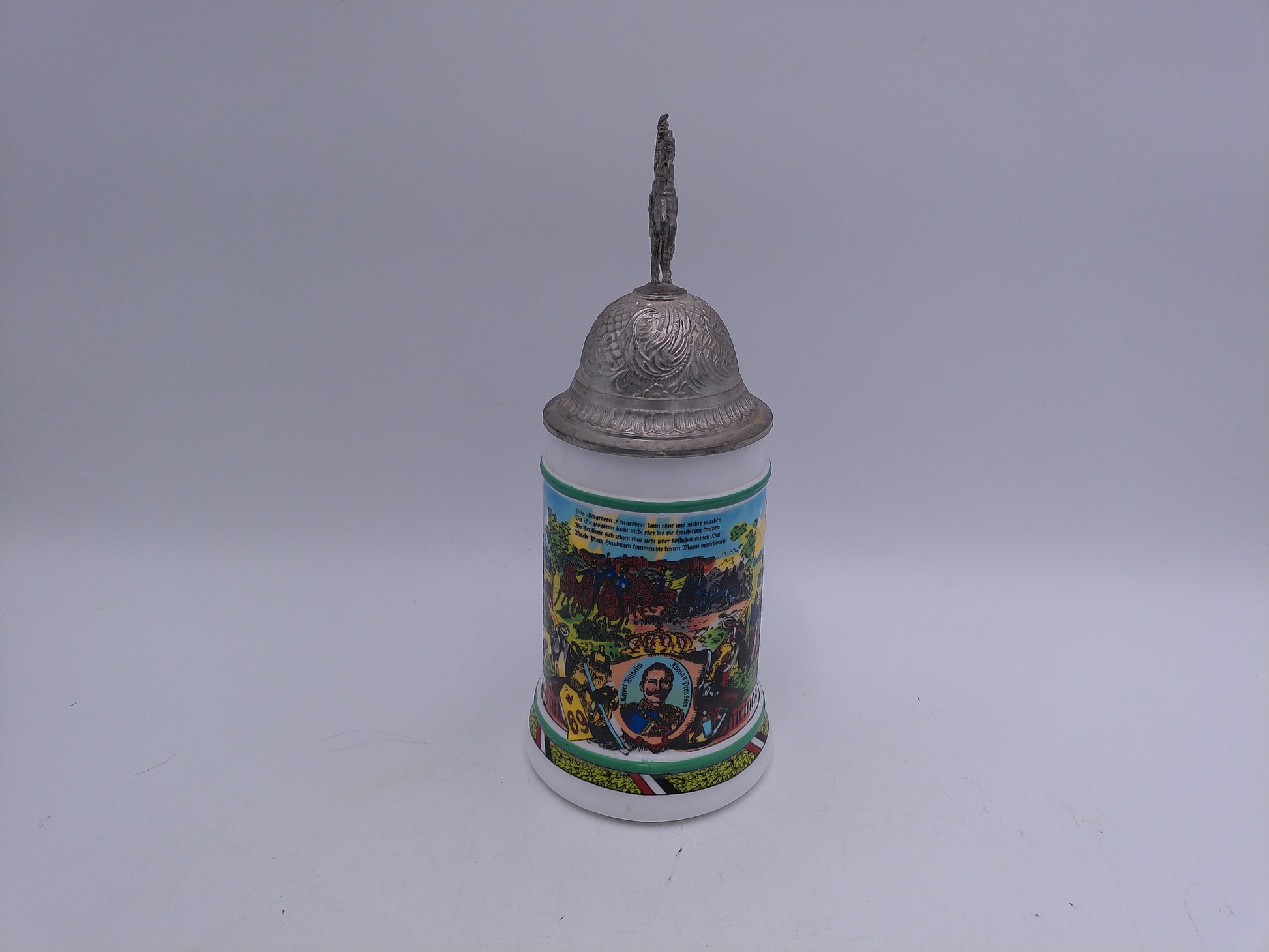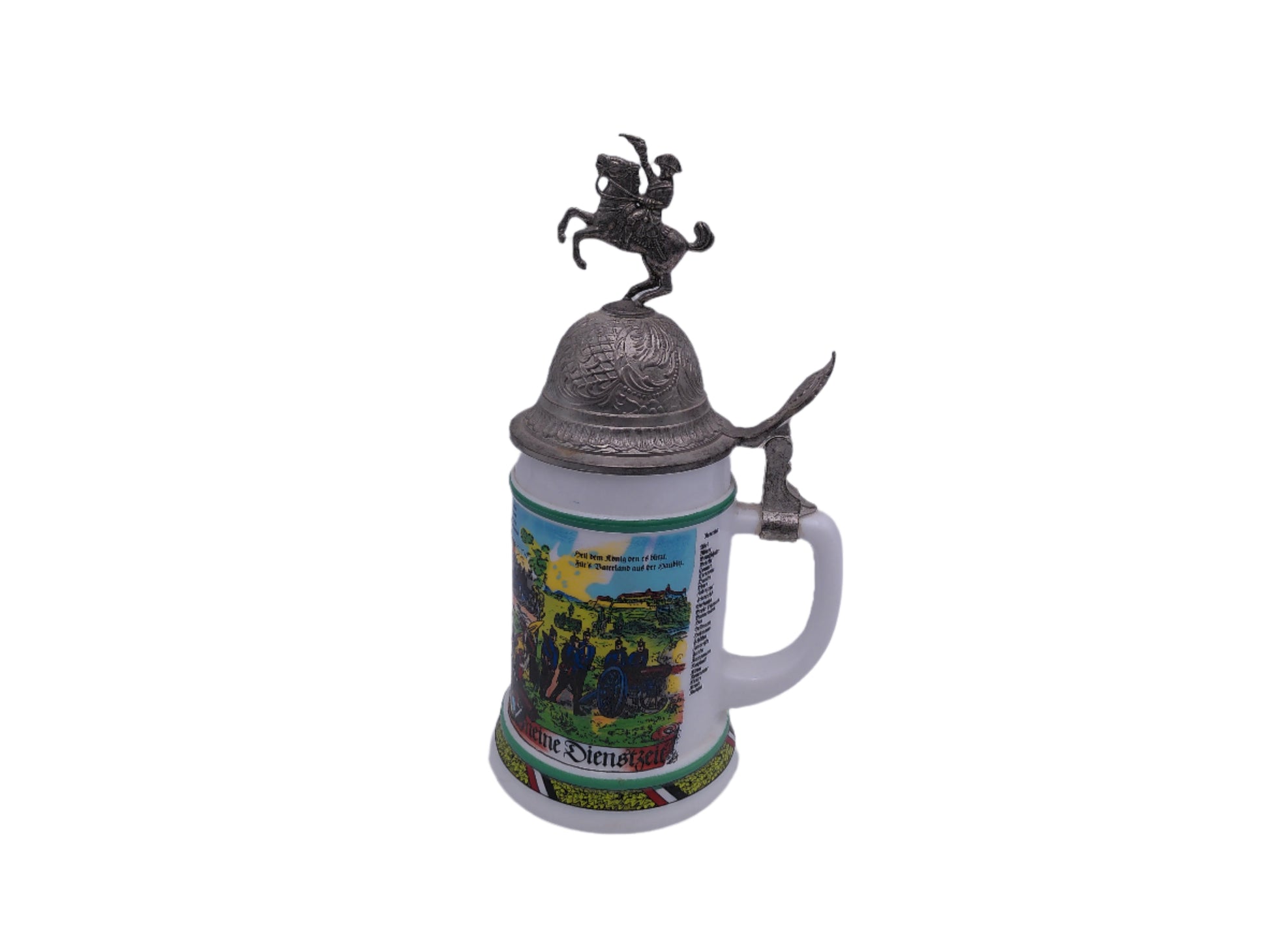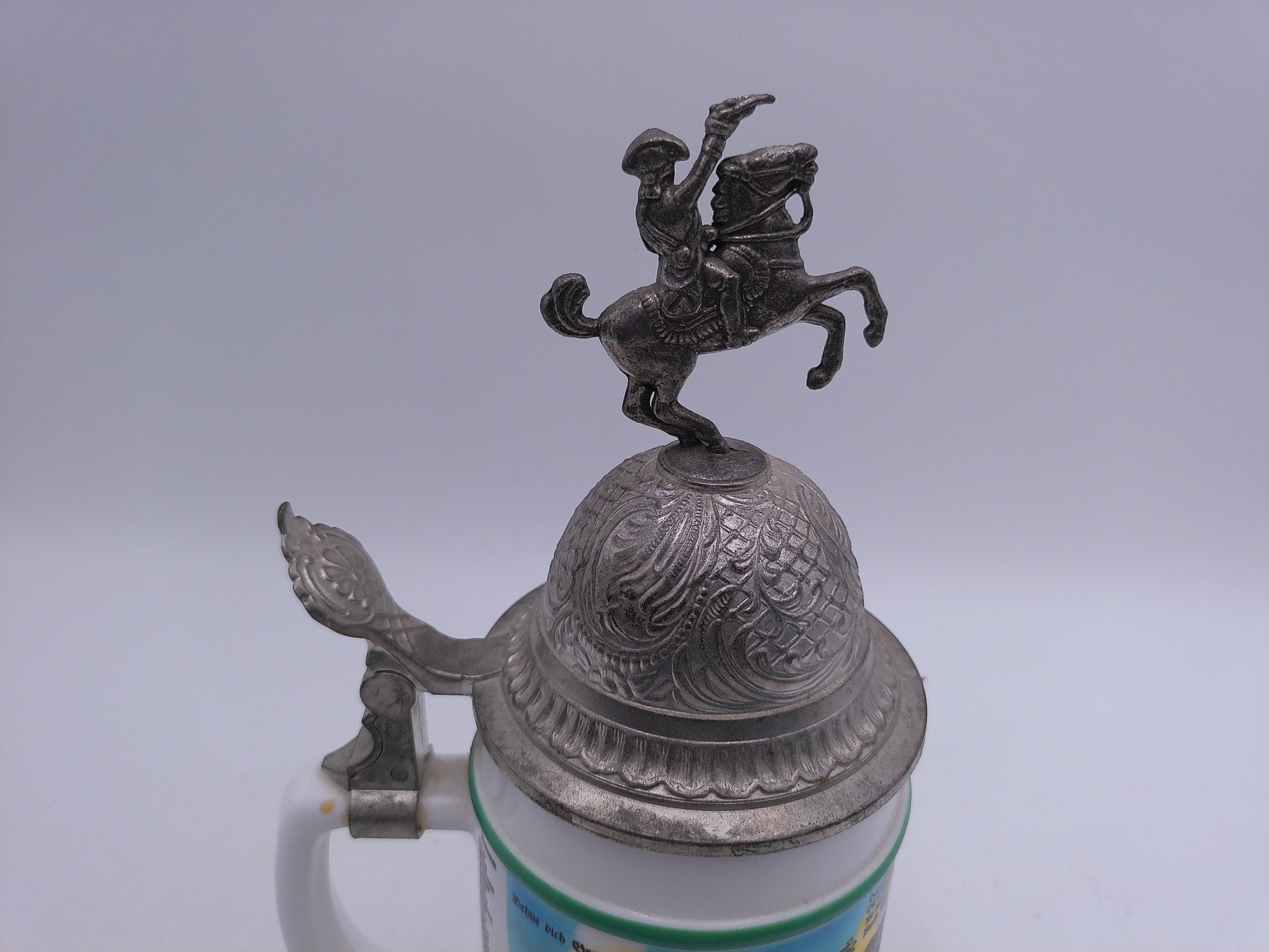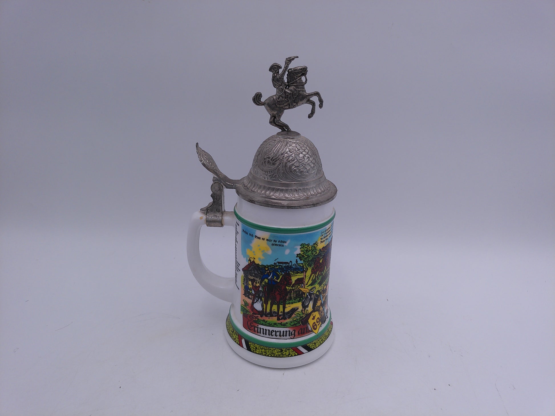 This authentic West German beer stein mug features a detailed lid with a soldier and horse design. The sturdy ceramic construction and one-liter capacity make it perfect for enjoying your favorite brew. Add a touch of history and charm to your drinking experience with this unique mug.