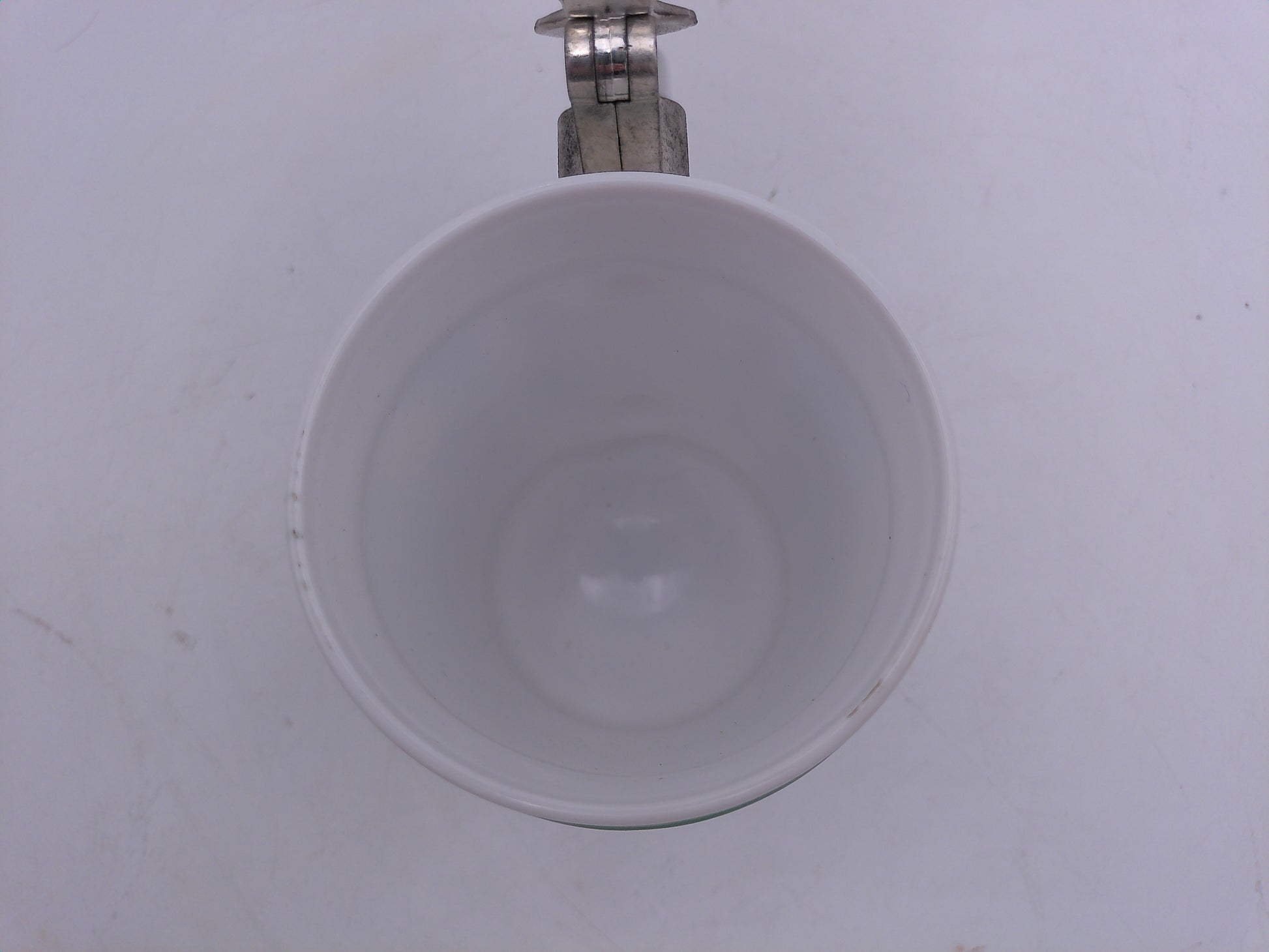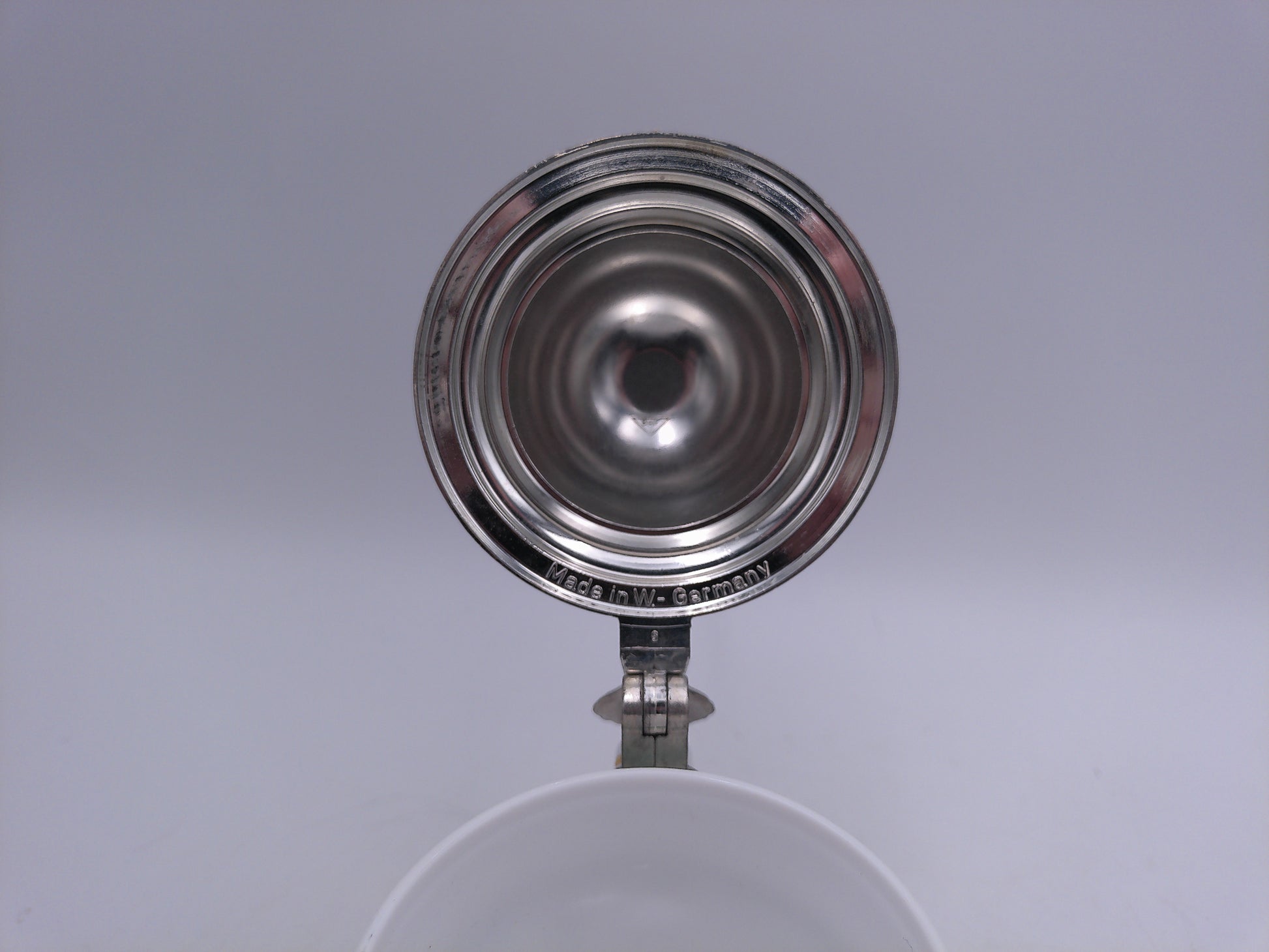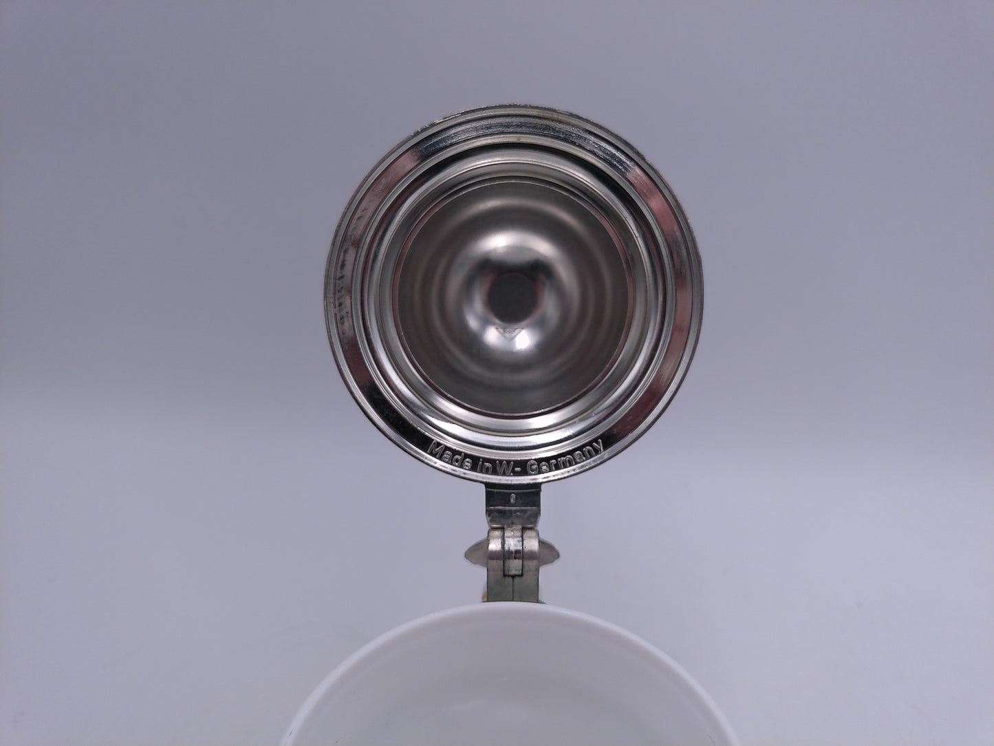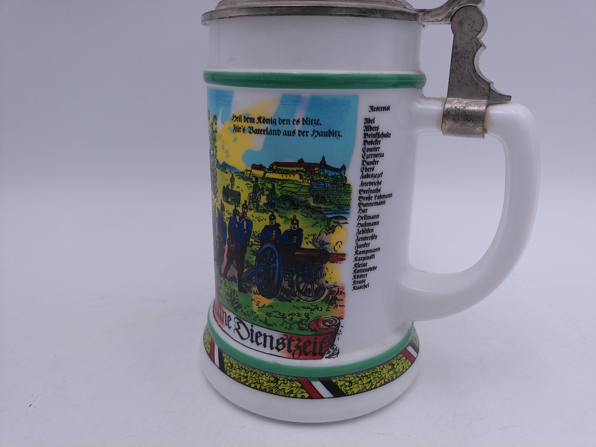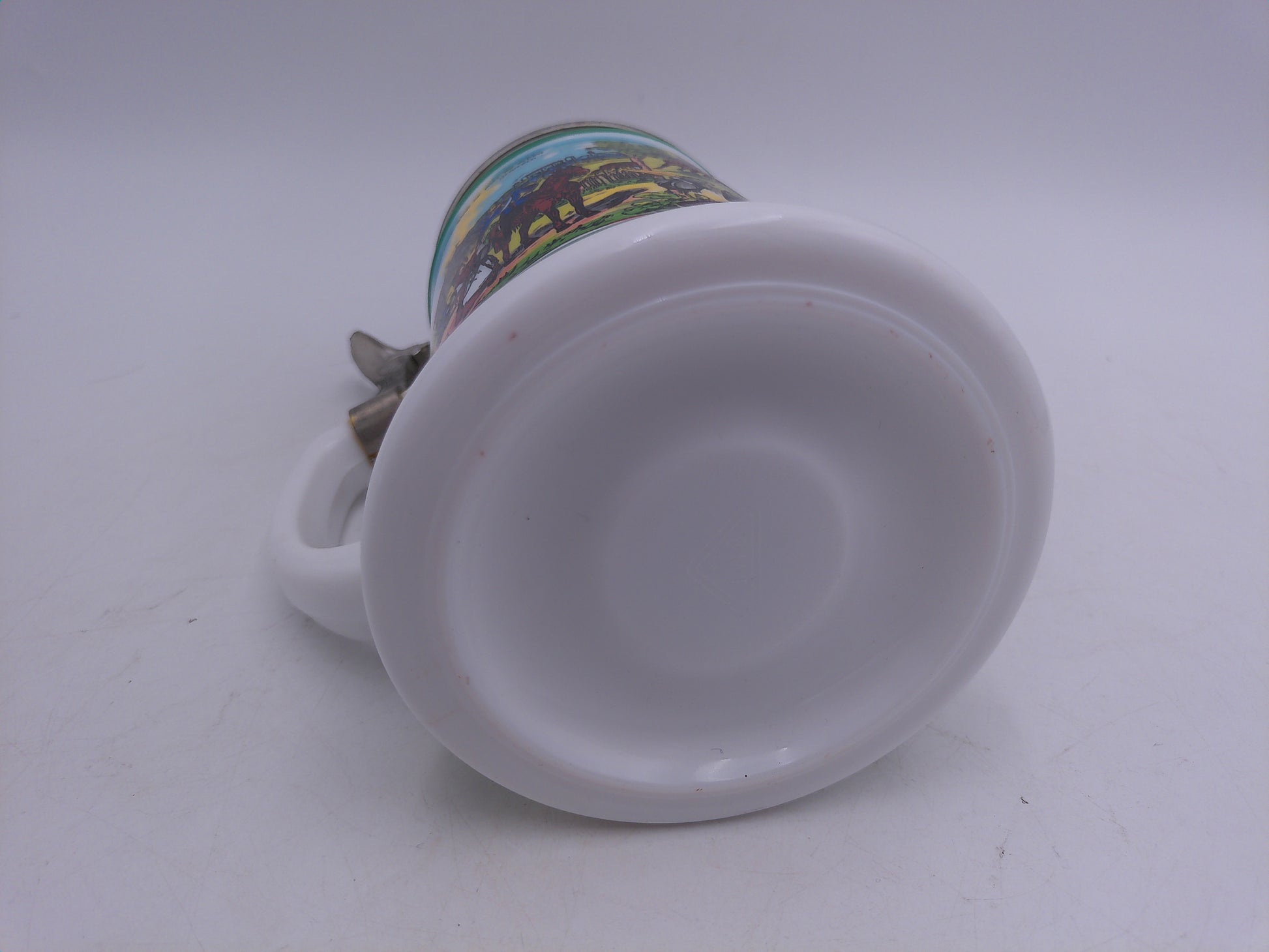 This authentic West German beer stein mug features a detailed lid with a soldier and horse design. The sturdy ceramic construction and one-liter capacity make it perfect for enjoying your favorite brew. Add a touch of history and charm to your drinking experience with this unique mug.