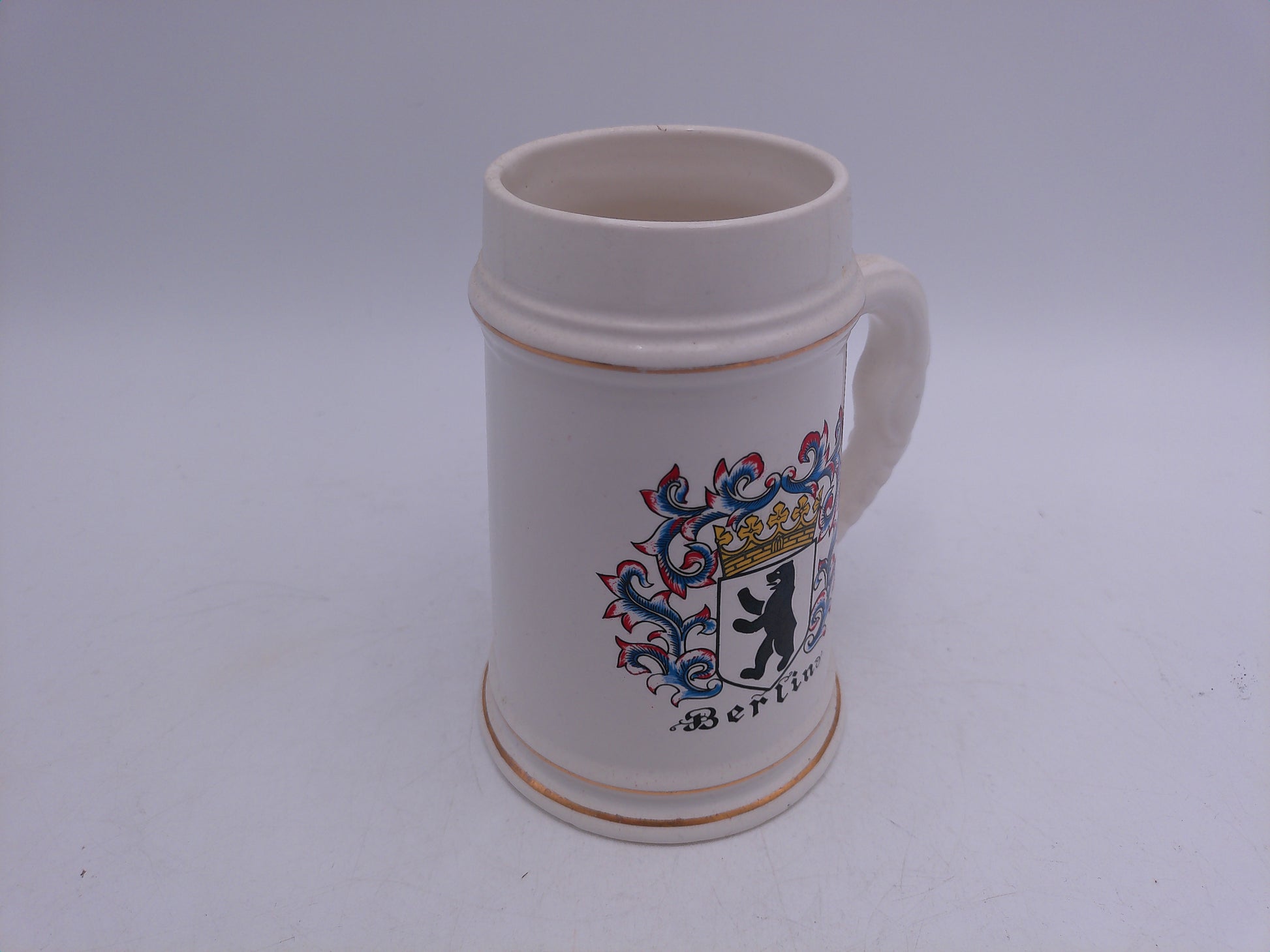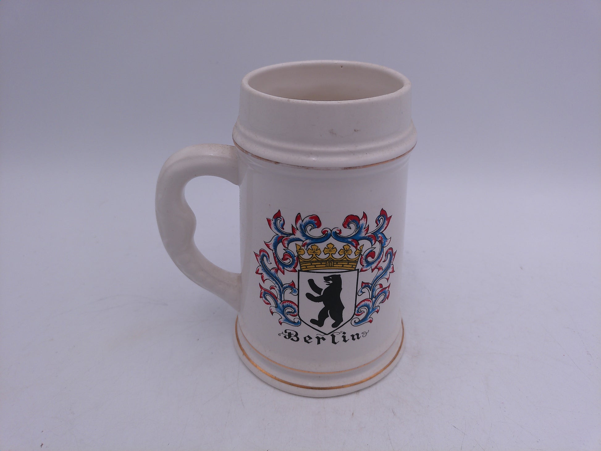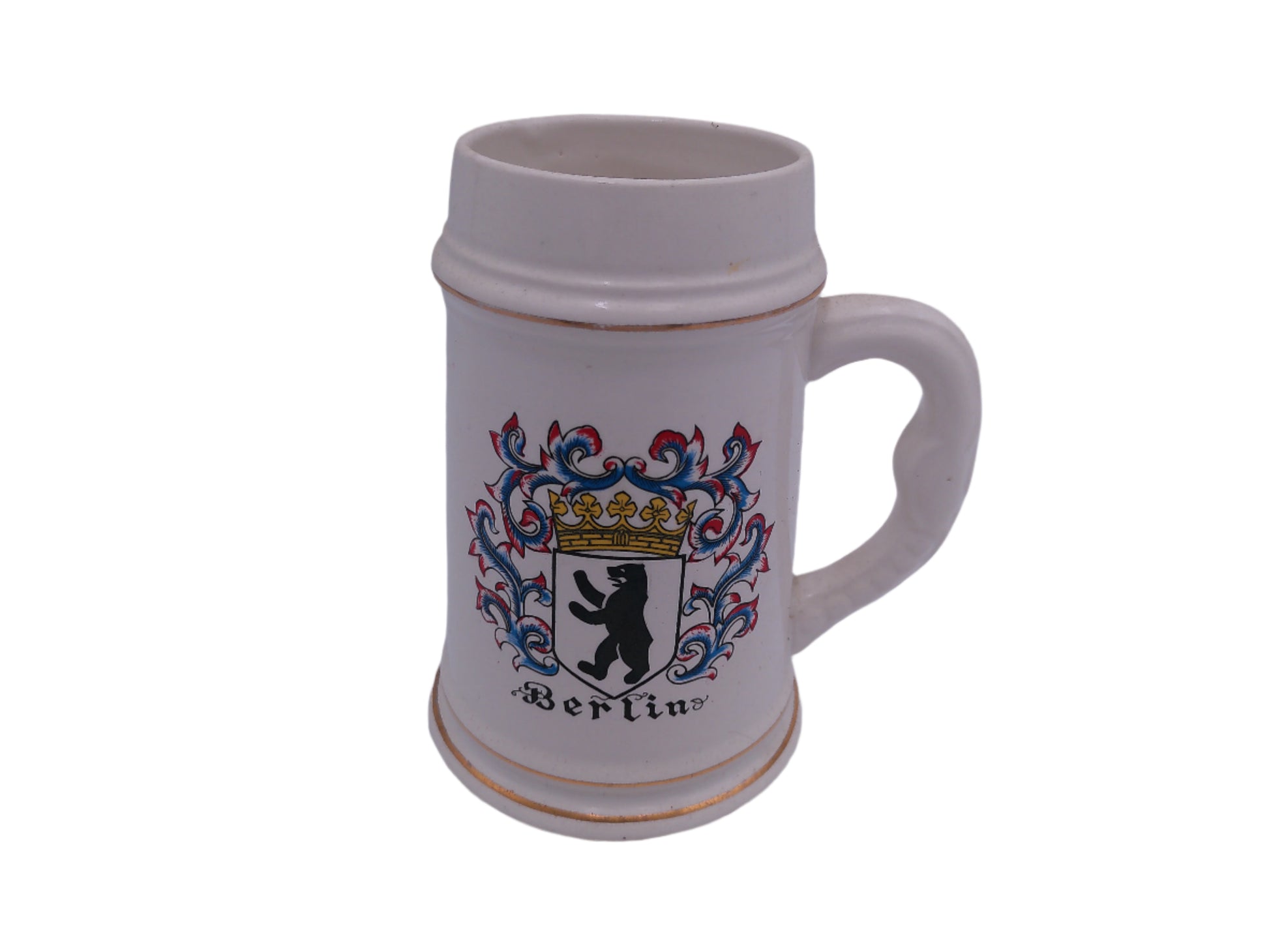 This vintage Beer Stein features a classic Berlin logo and is adorned with top and bottom gold colored rings. Crafted for Beer enthusiasts, it adds an element of old-world charm to any drinking experience. Made to last and elevate your drinking game.