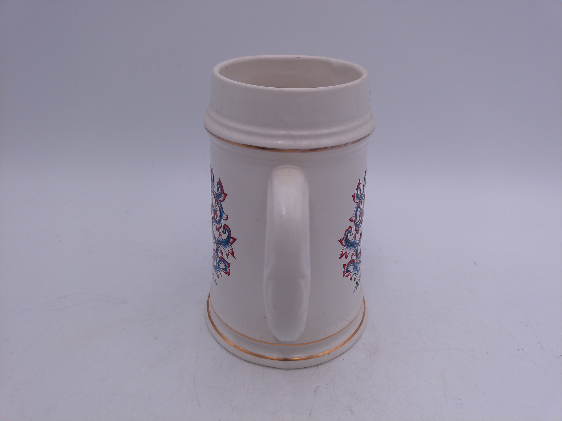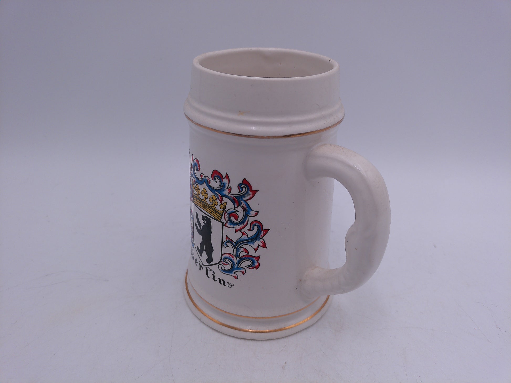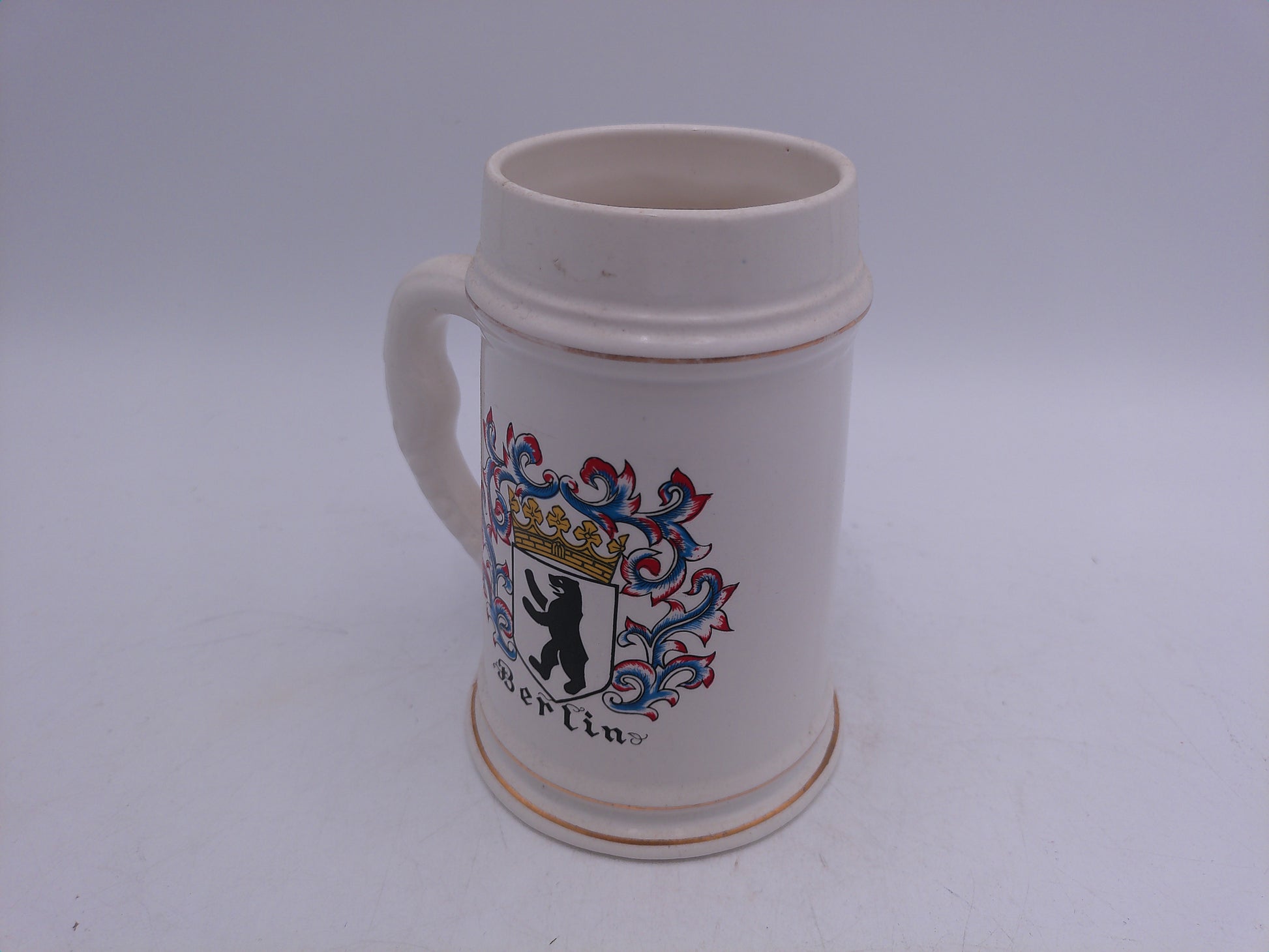 This vintage Beer Stein features a classic Berlin logo and is adorned with top and bottom gold colored rings. Crafted for Beer enthusiasts, it adds an element of old-world charm to any drinking experience. Made to last and elevate your drinking game.