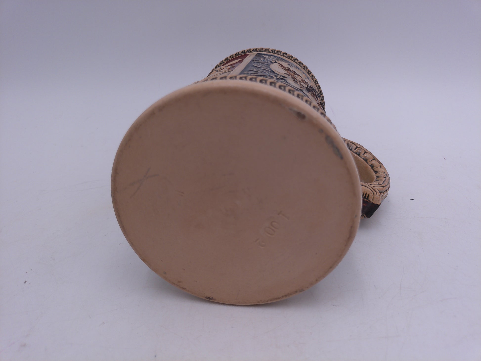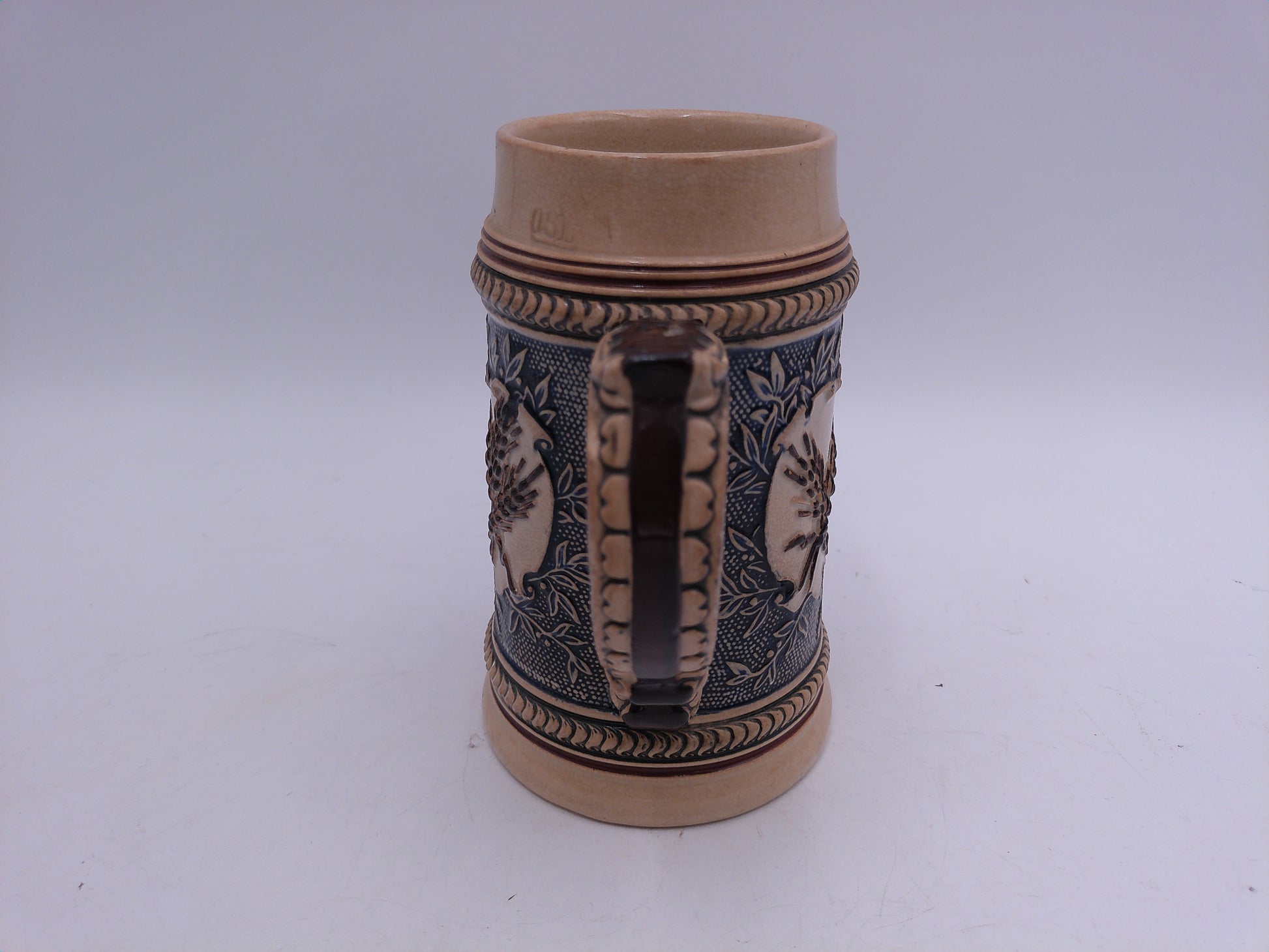 This vintage brown and tan beer stein features a decorative handle for a touch of charm. Made to impress with a classic design, this stein is perfect for enjoying your favorite brew and adding a touch of sophistication to your barware collection. Cheers to timeless taste with this Prosit beer stein.