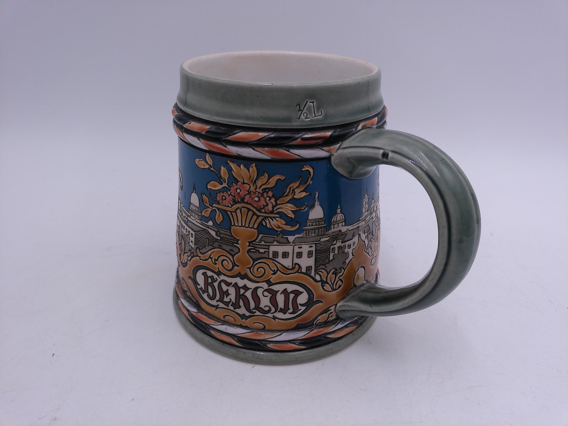 This expertly crafted Beer Stein from Mettlach holds .5 liters of your favorite beer and features a beautifully detailed "Shield Of Berlin" design. Made in Germany, this lidded stein is a must-have for any beer enthusiast or collector.