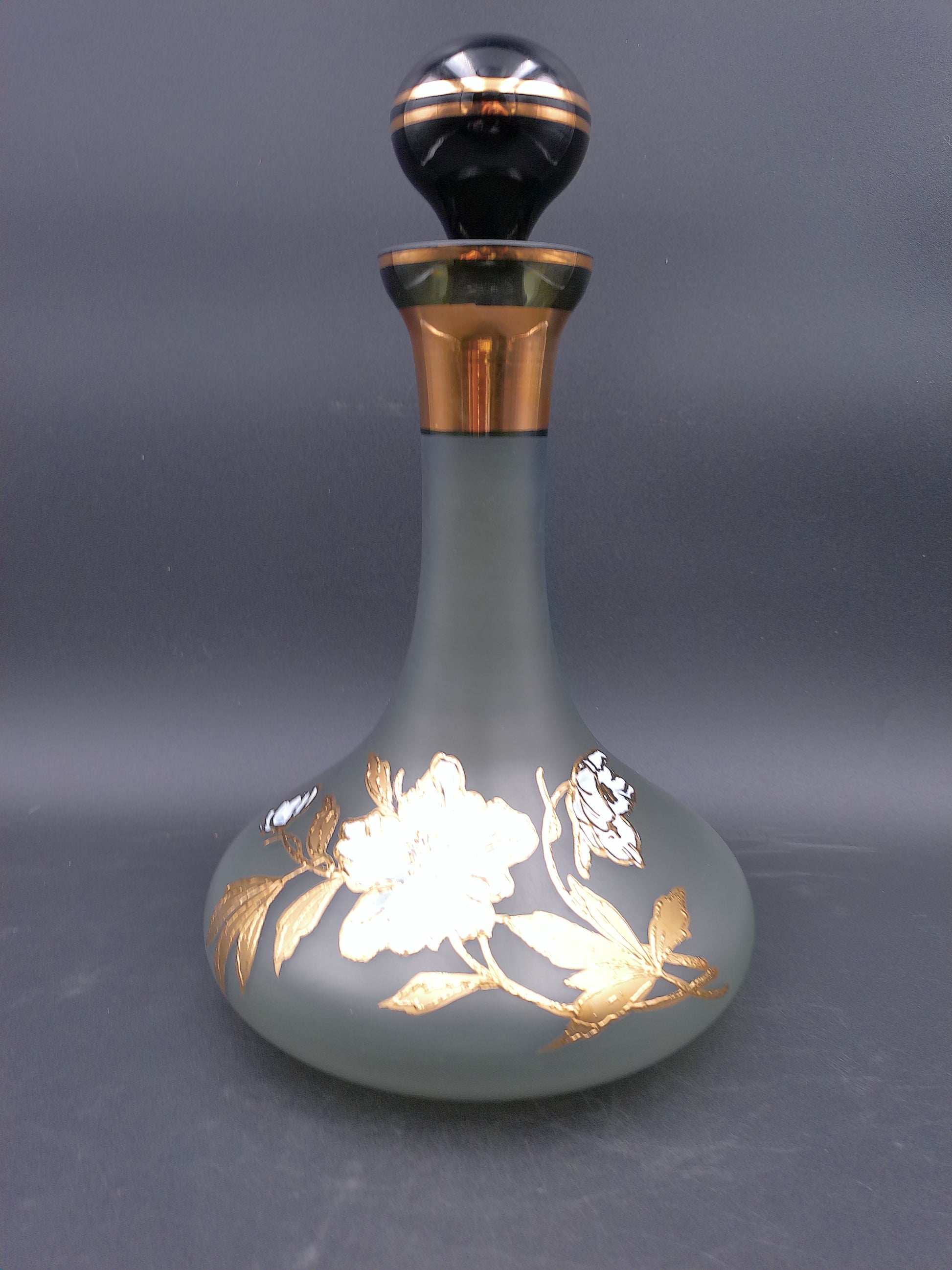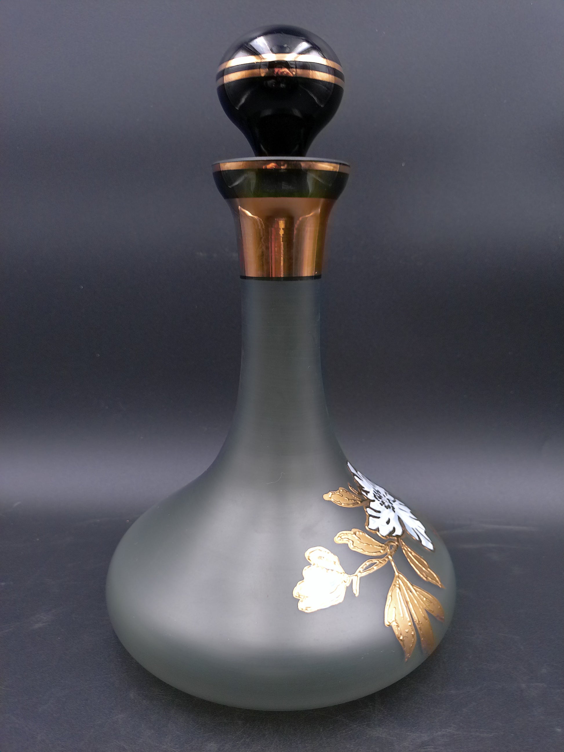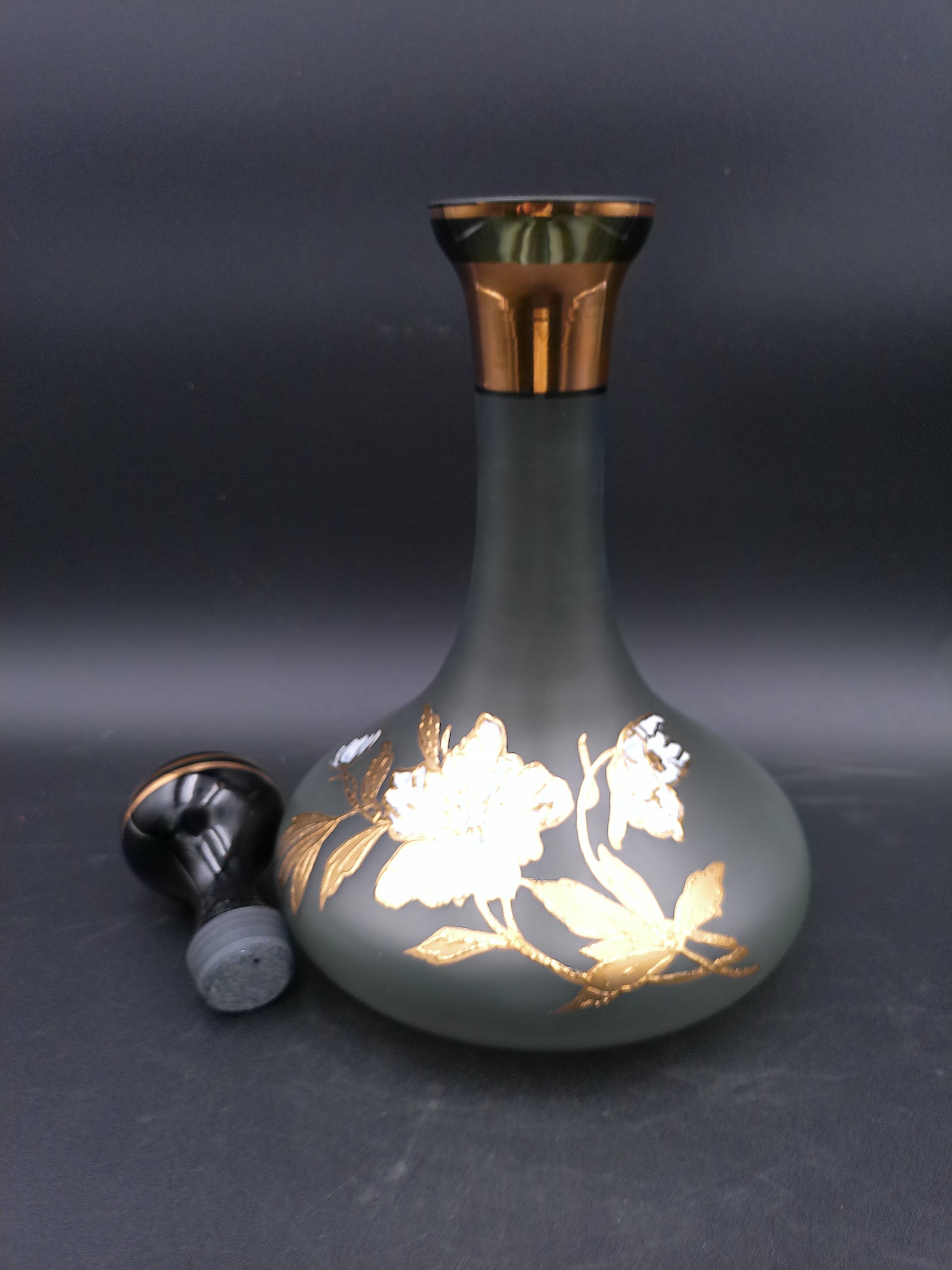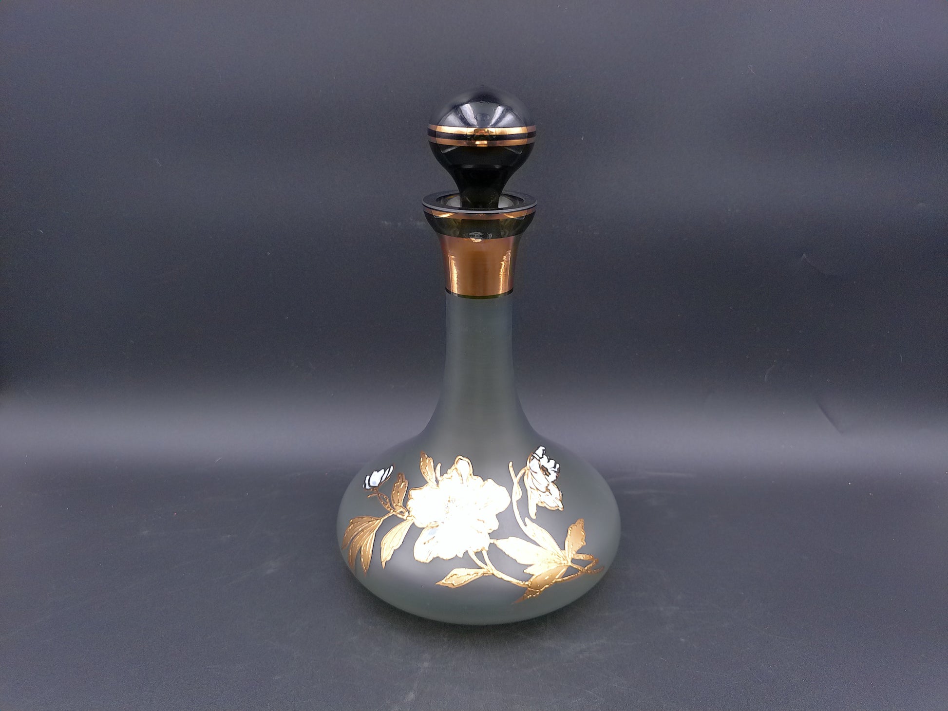 Decanter Bottle Smokey Color Gold Flower Design Lid BJ Czech Republic