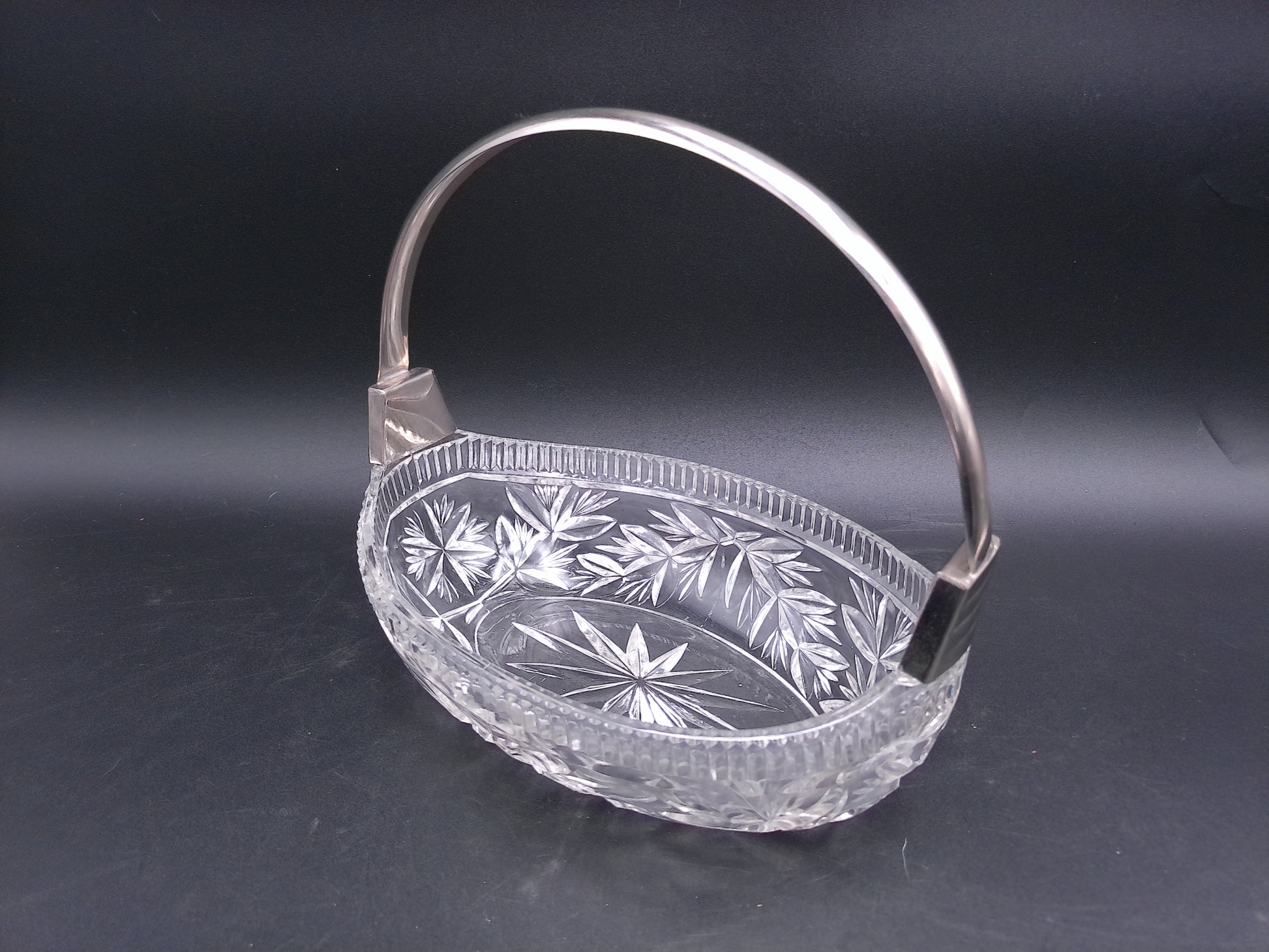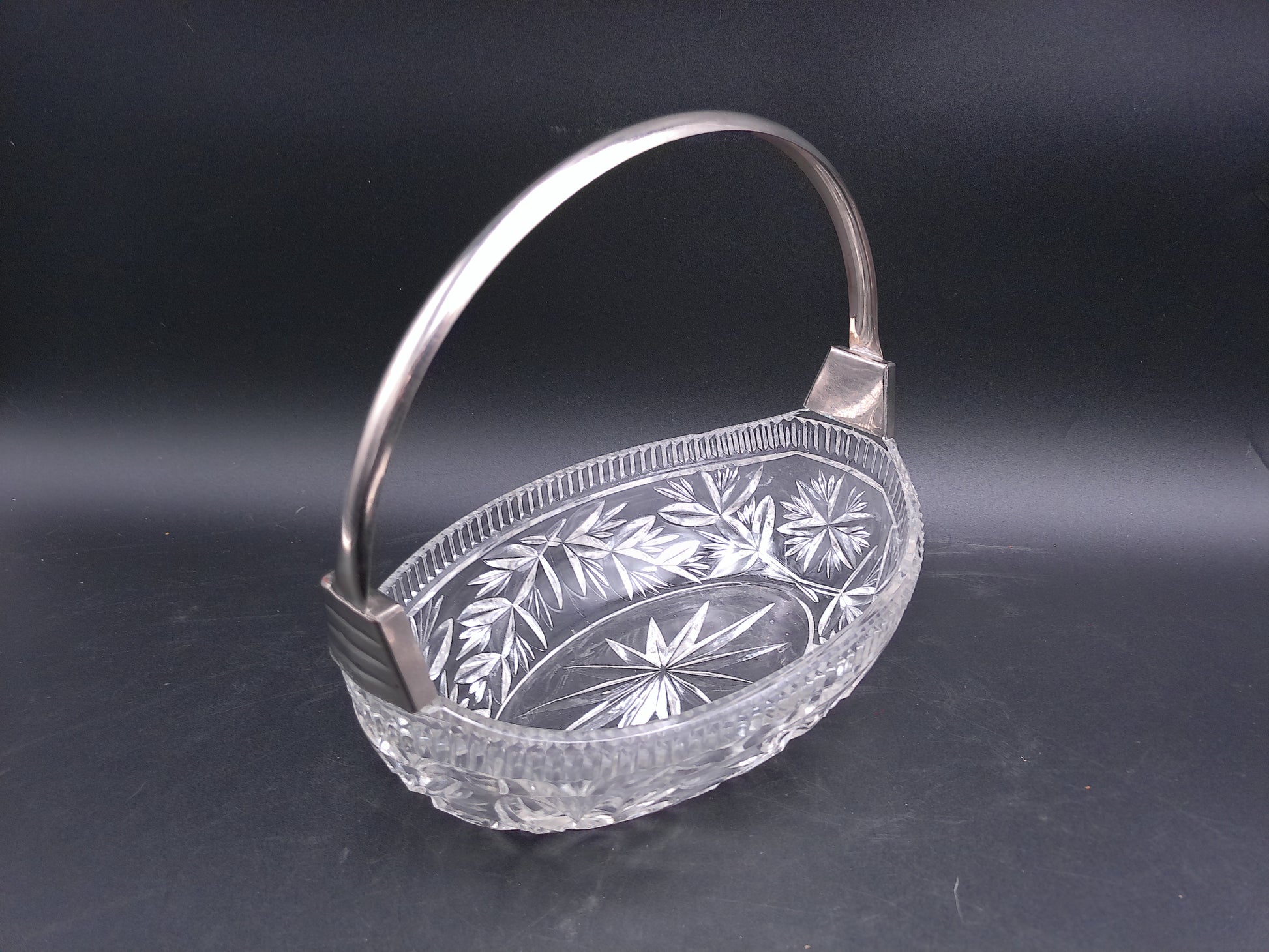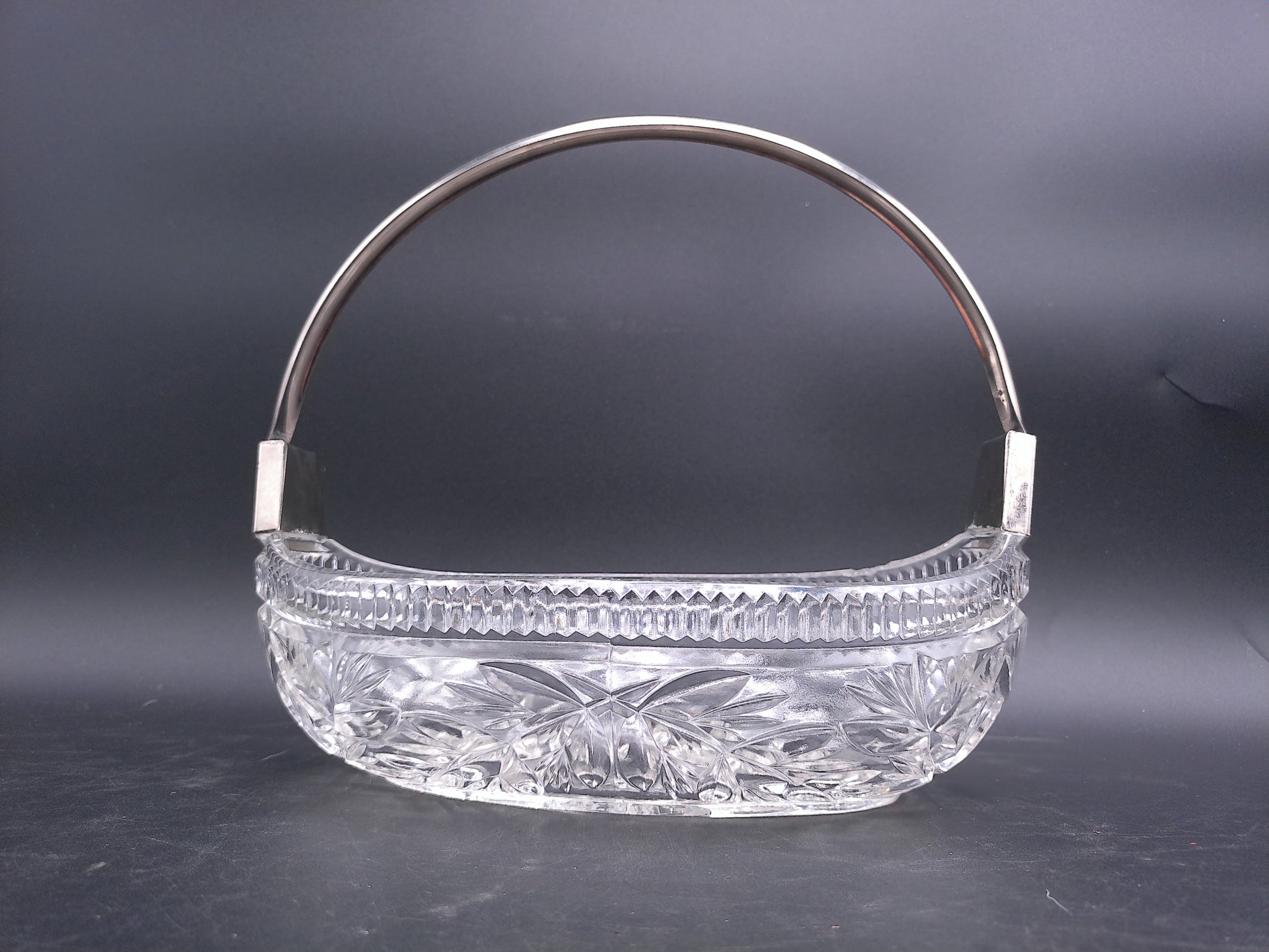Heavy Crystal Glass Basket Bowl with Silver Coloured Metal Handle