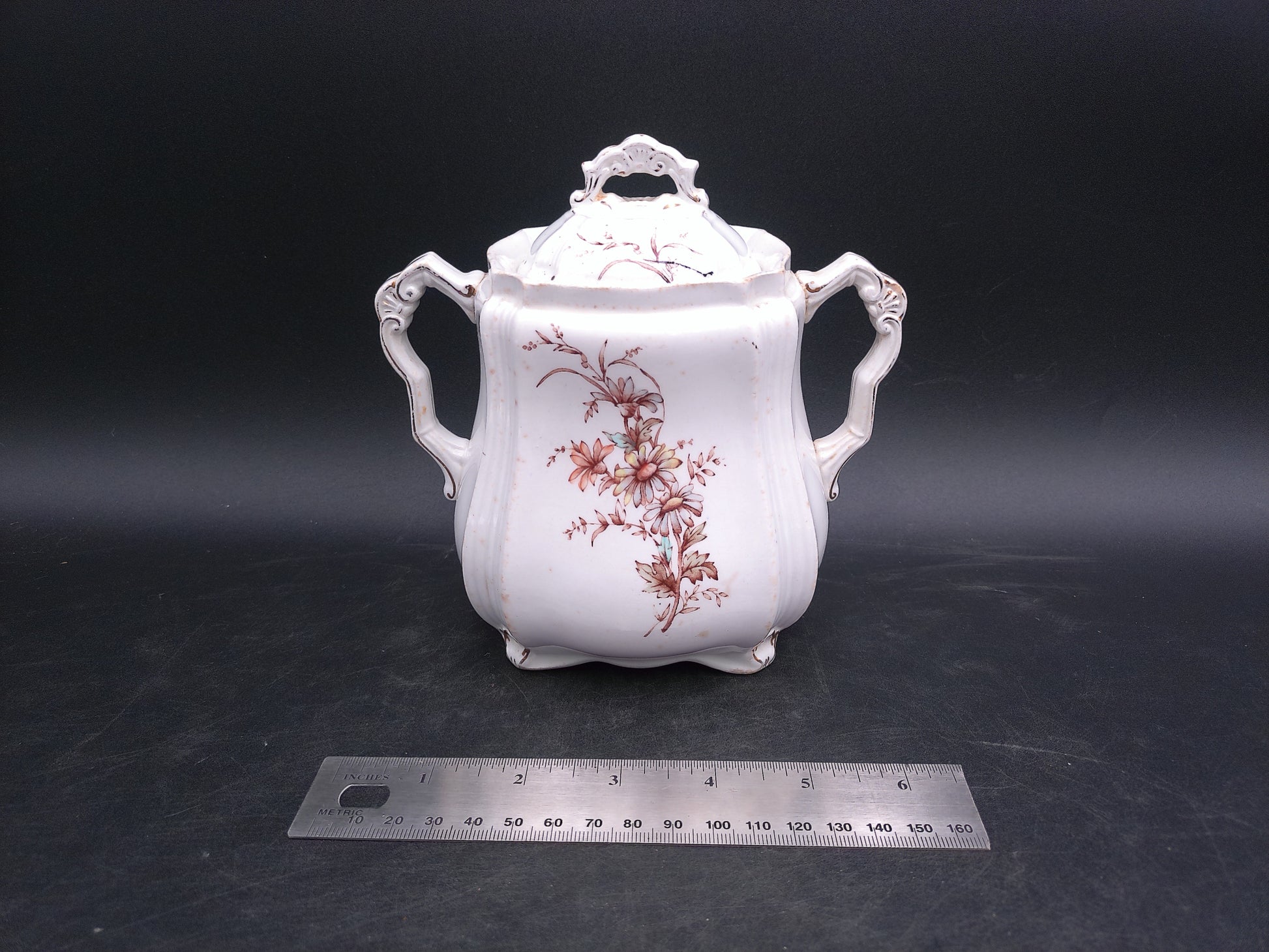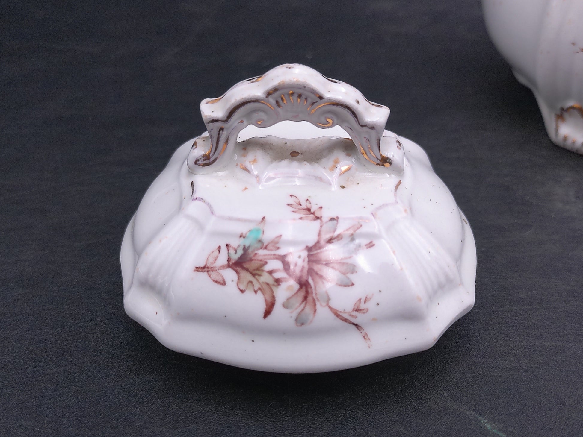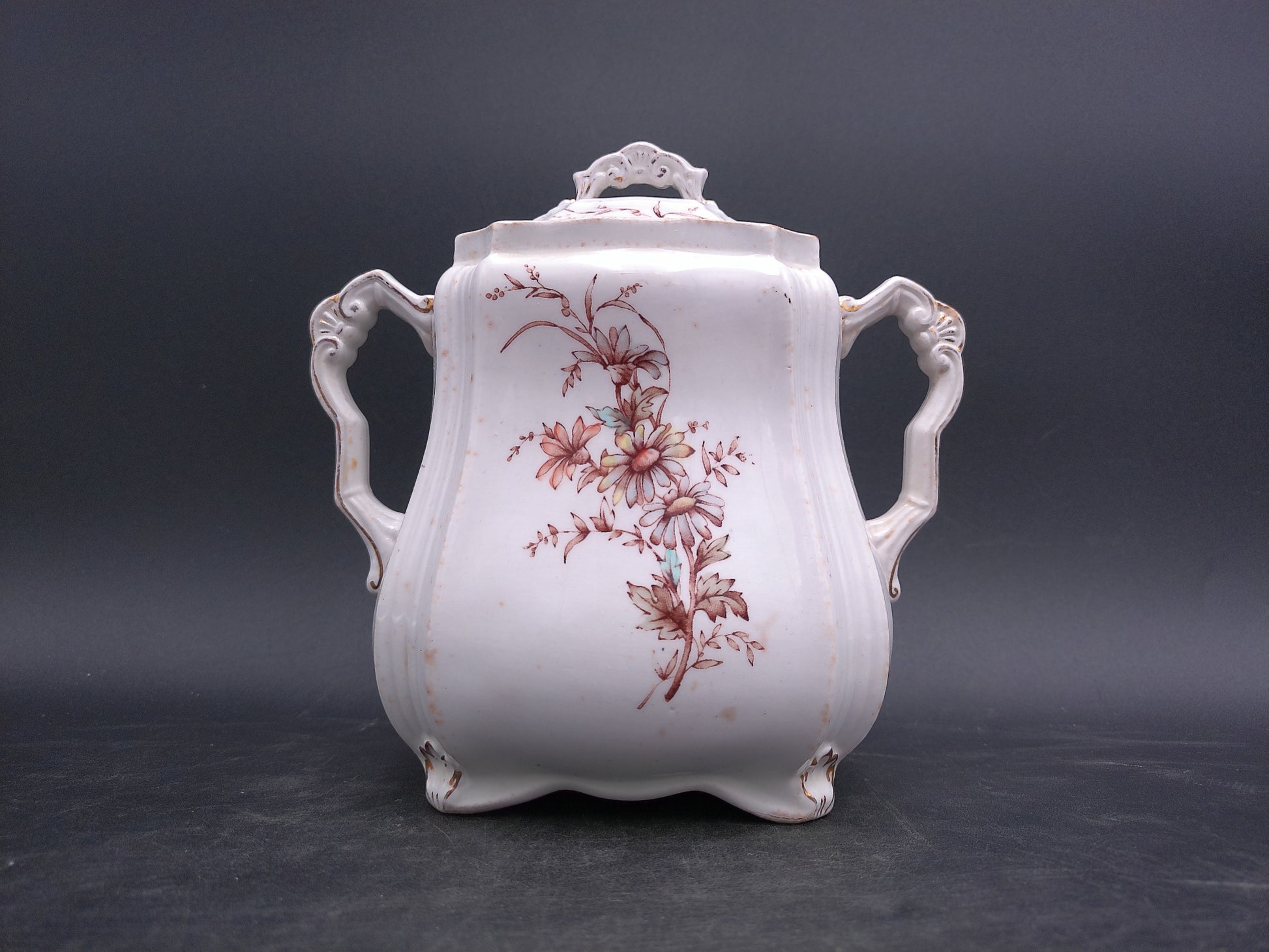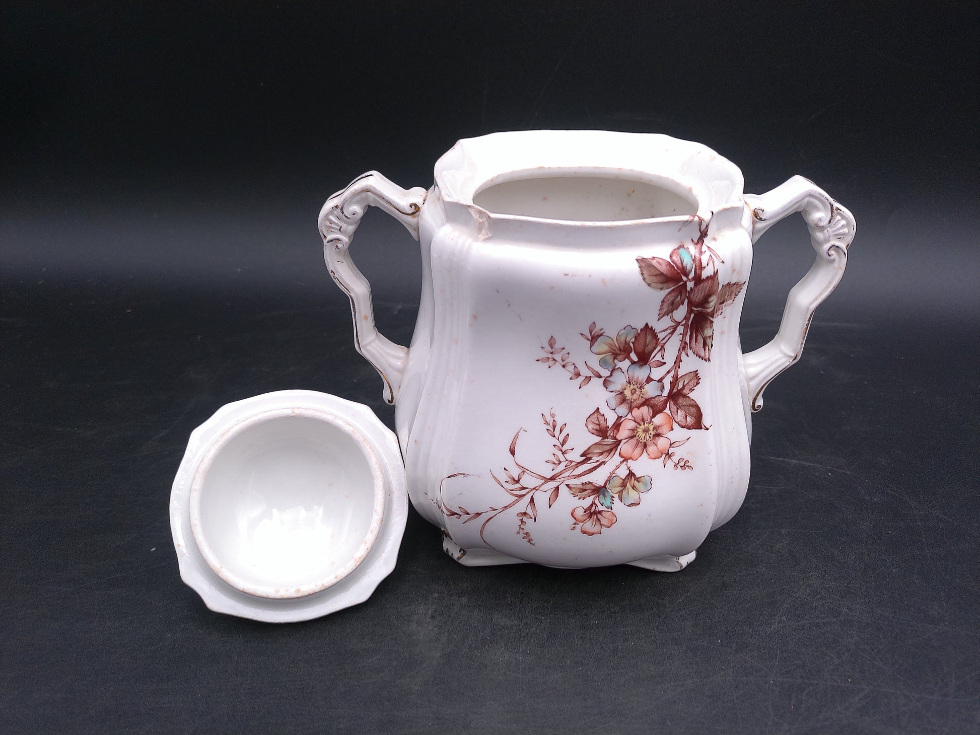 Elevate your collection with the Ridgways Royal Sem Porcelain Buckingham England Pot, featuring an elegant floral design and a refined gold edge. This exquisite piece combines timeless craftsmanship with delicate artistry, making it perfect for display or special occasions. Its classic style adds a touch of sophistication to any setting, reflecting the heritage of English porcelain excellence.
