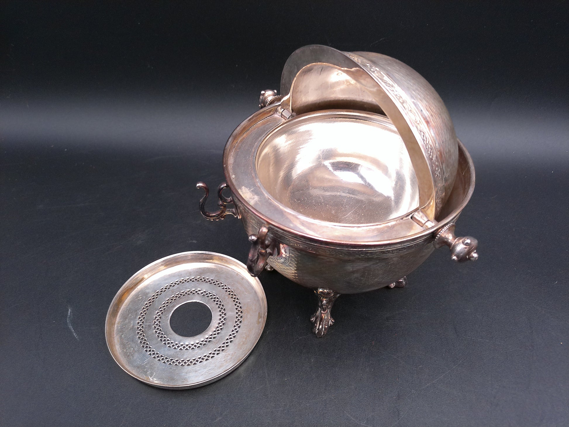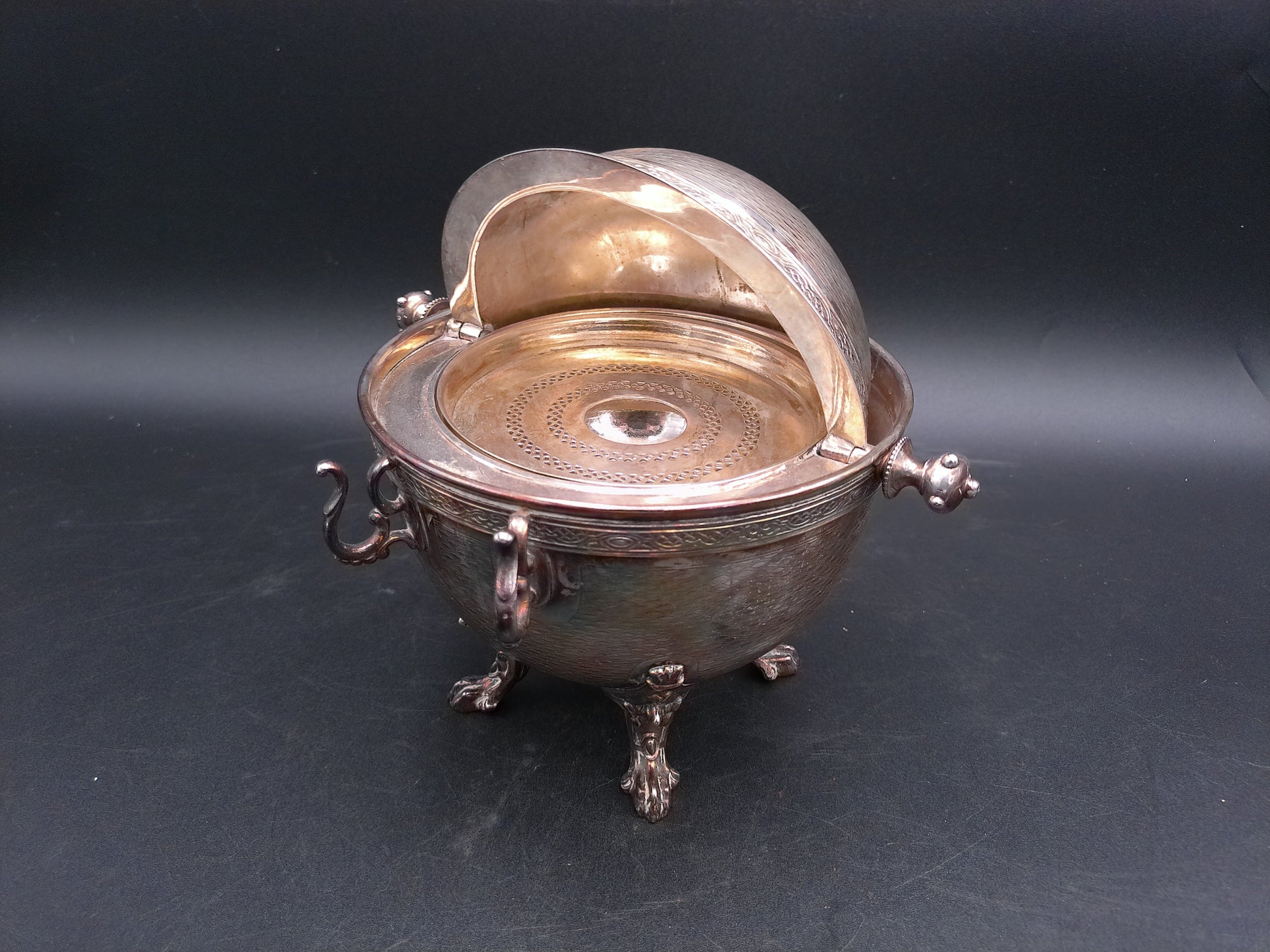 Expertly crafted in England, this Silver Plate Dome Roll Top Dish is the perfect addition to any elegant dining table. Its sleek design and beautiful patina make it a functional and aesthetically pleasing way to serve butter or caviar. Elevate your dining experience with this timeless piece.