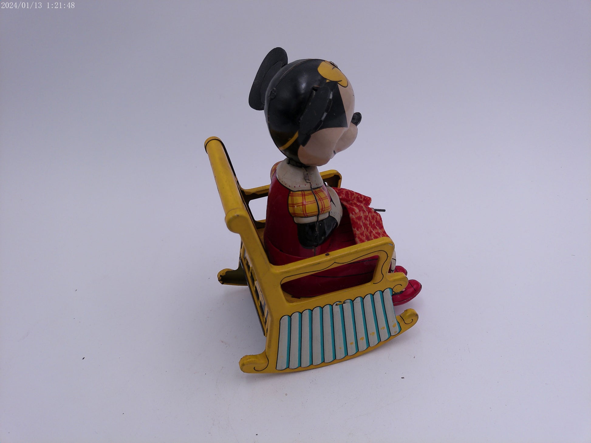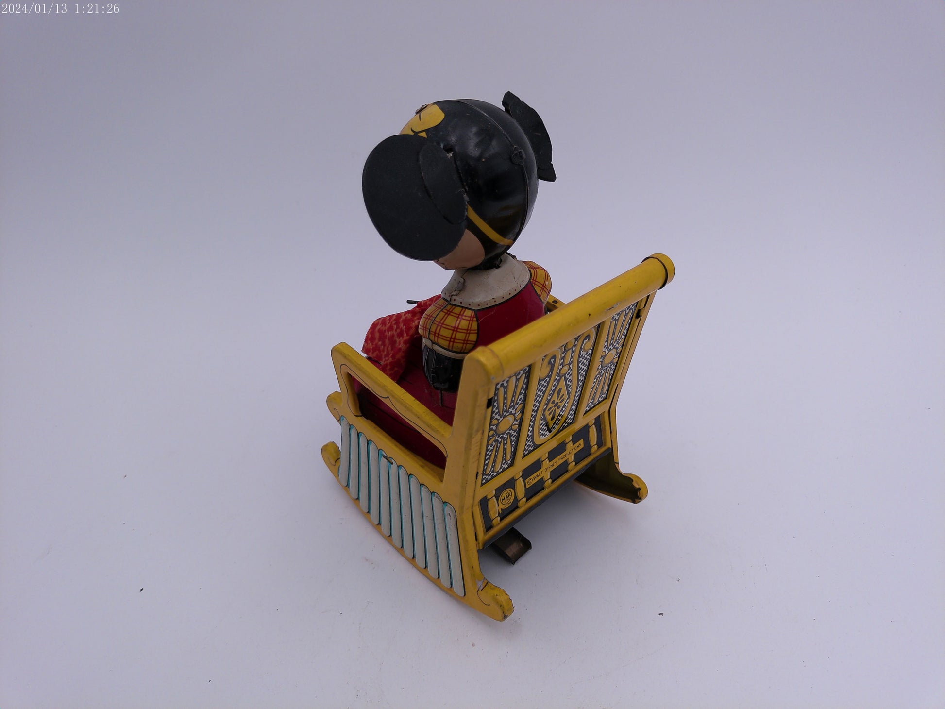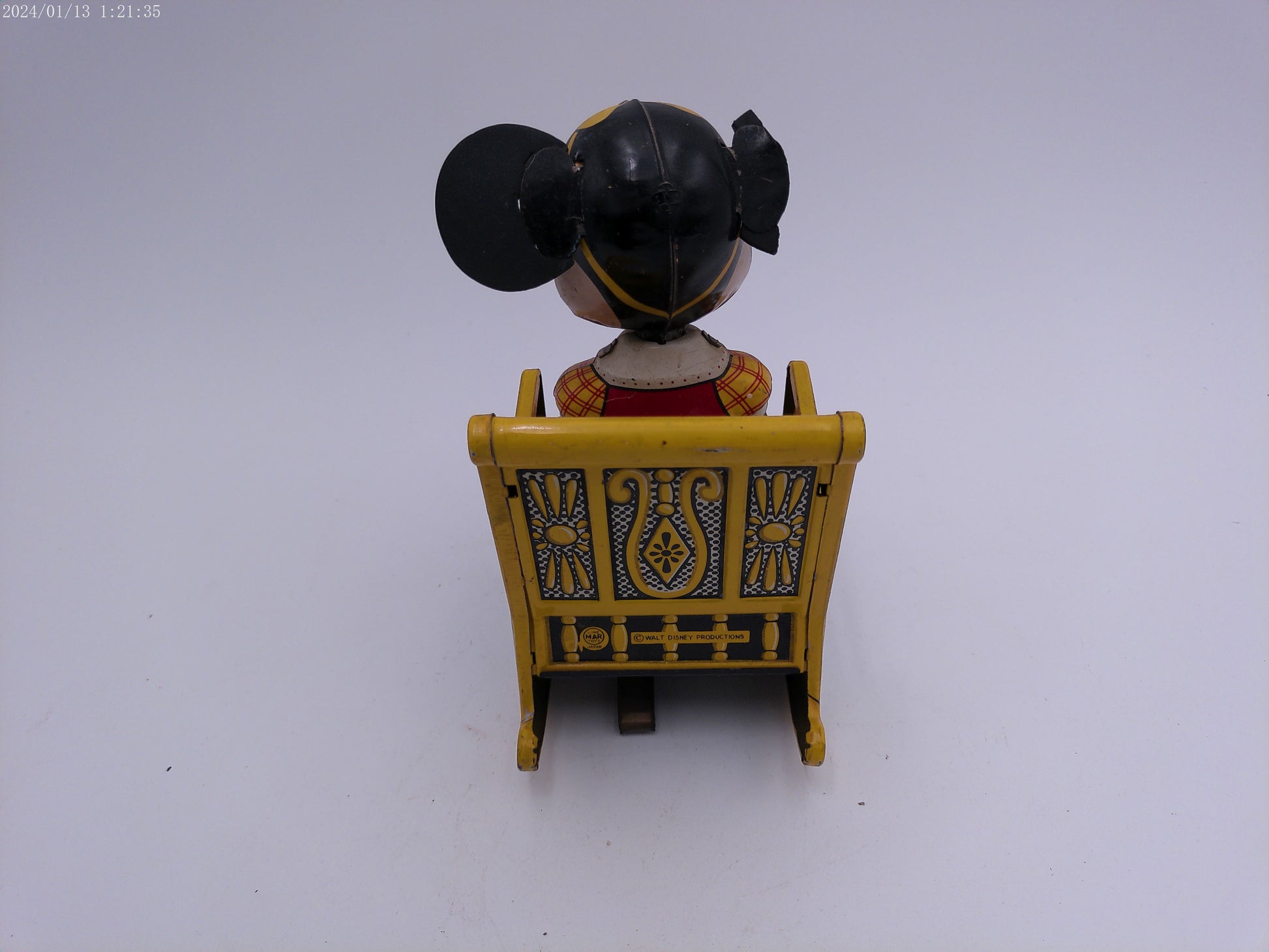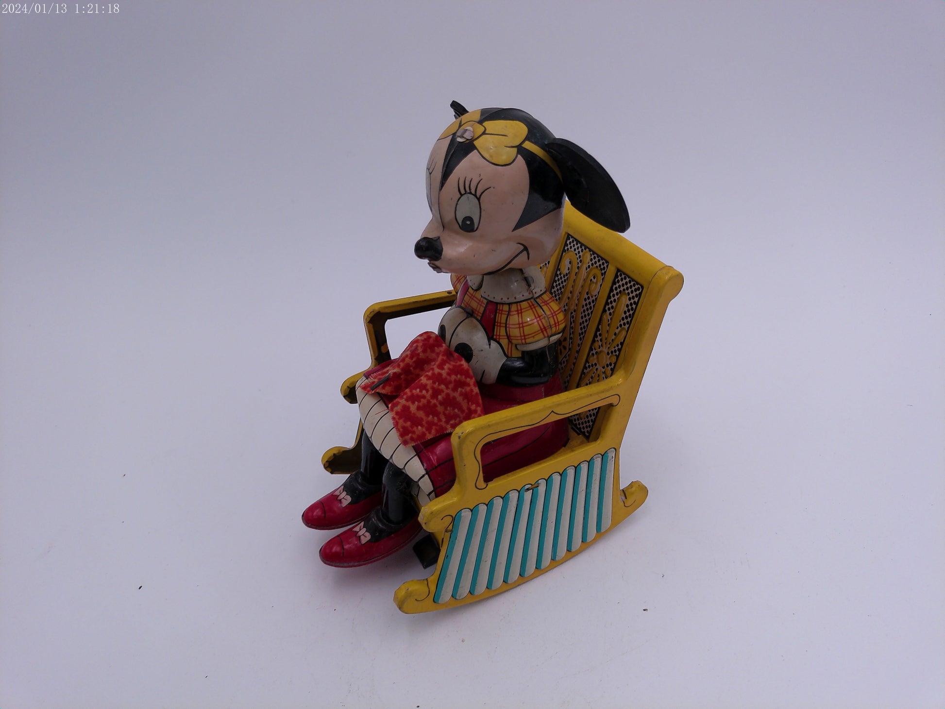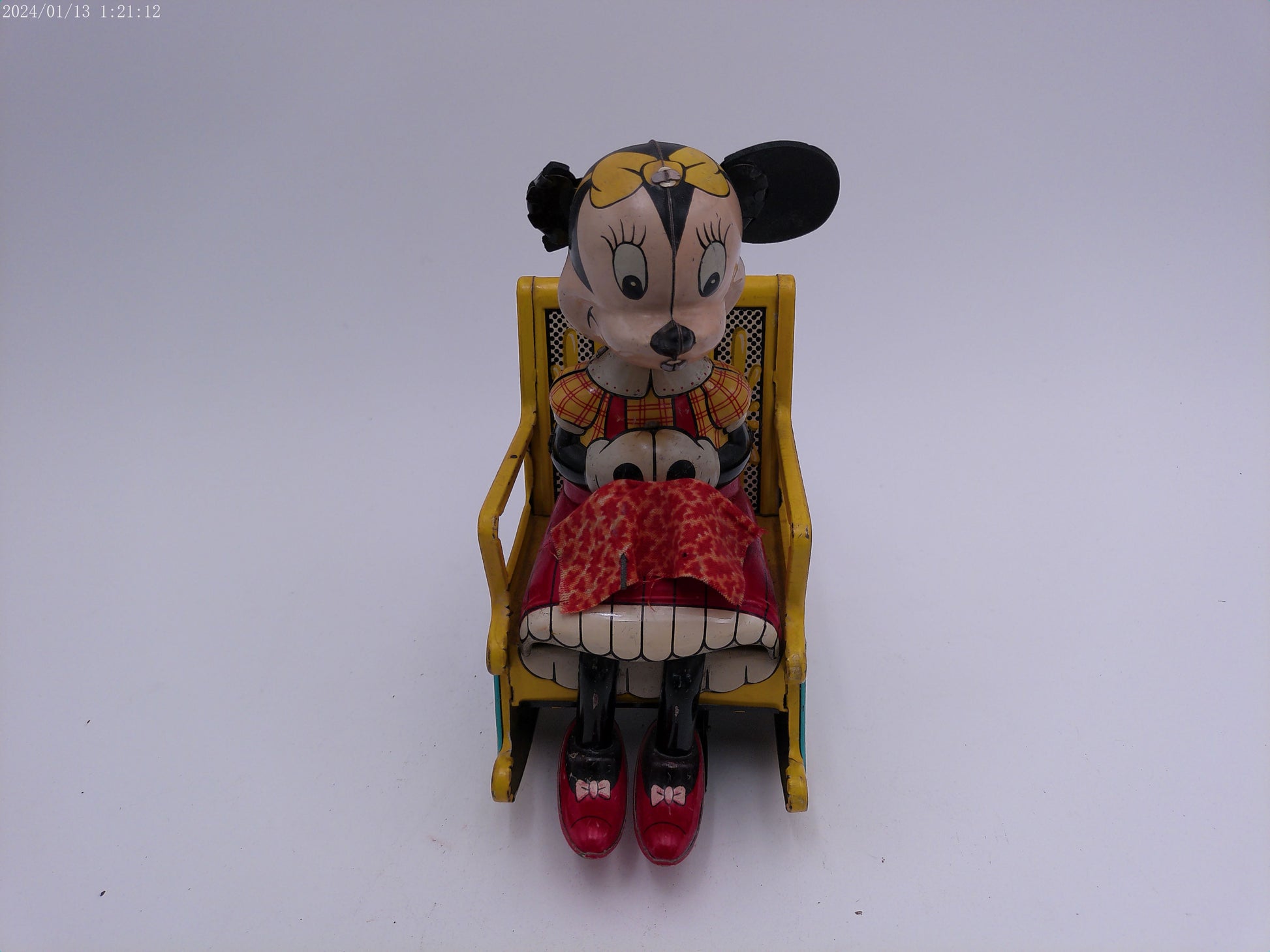 This is a rare tin mechanical toy made by Line Mar, Rocking and Knitting Minnie Mouse.