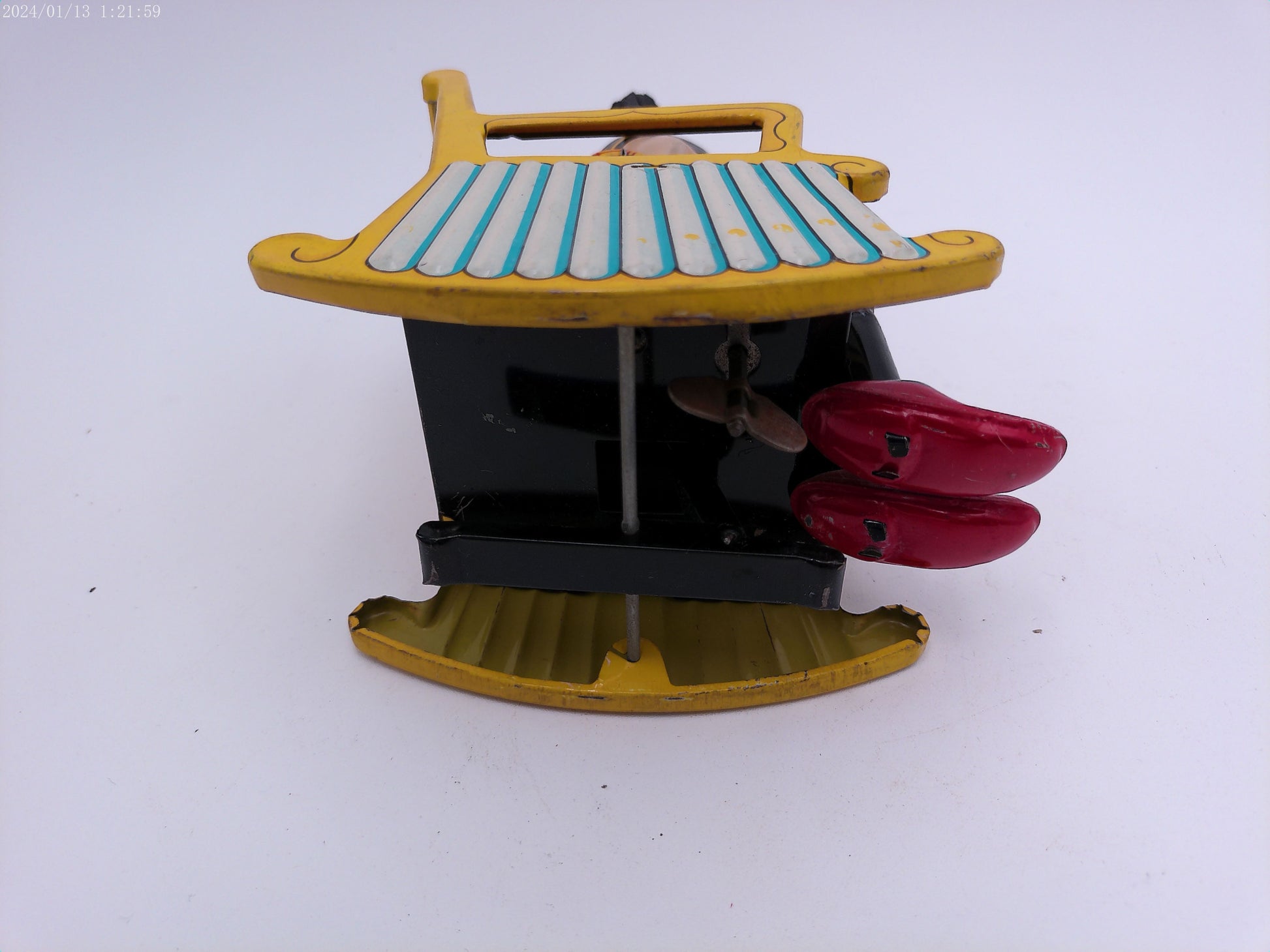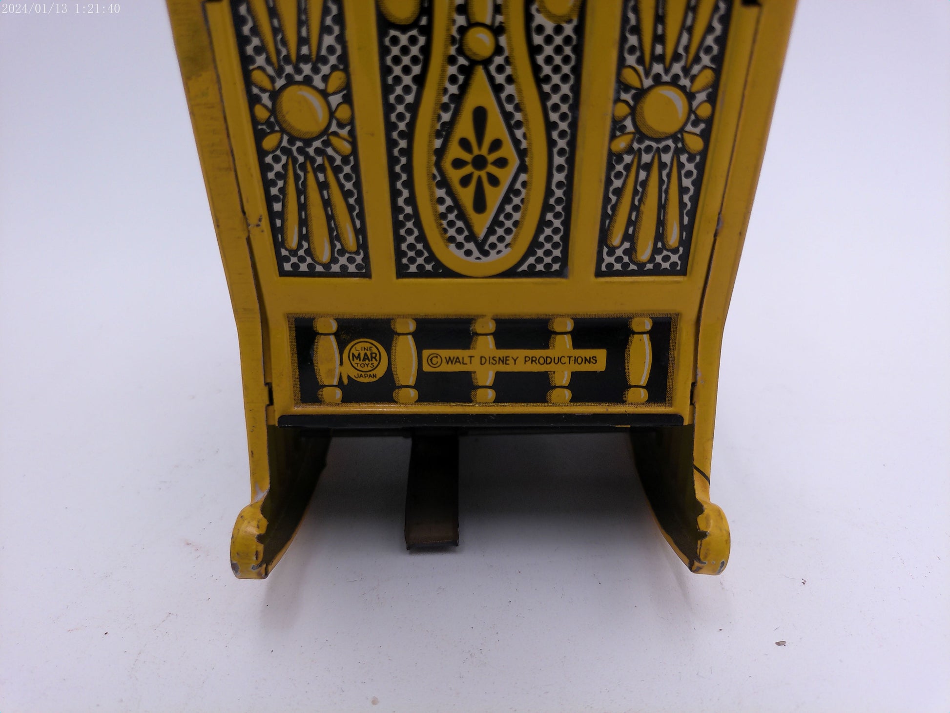 This mechanical tin litho toy was made in the 1950’s. It is all original maintaining its bright colors even though it is around 70 years old. The wind up mechanism works well and she rocks back and forth as her knitting needles move up and down. The toy measures about 7”x4.25”x3.25”. The medium is a lithograph on tin. It is a collectible Disneyana toy. On the back of the rocking chair it says Disney Productions and has the Line Mar Toys , Japan symbol written on it. This toy was mine when I was a little girl. I loved playing with it. It is in very good condition considering it’s vintage age.