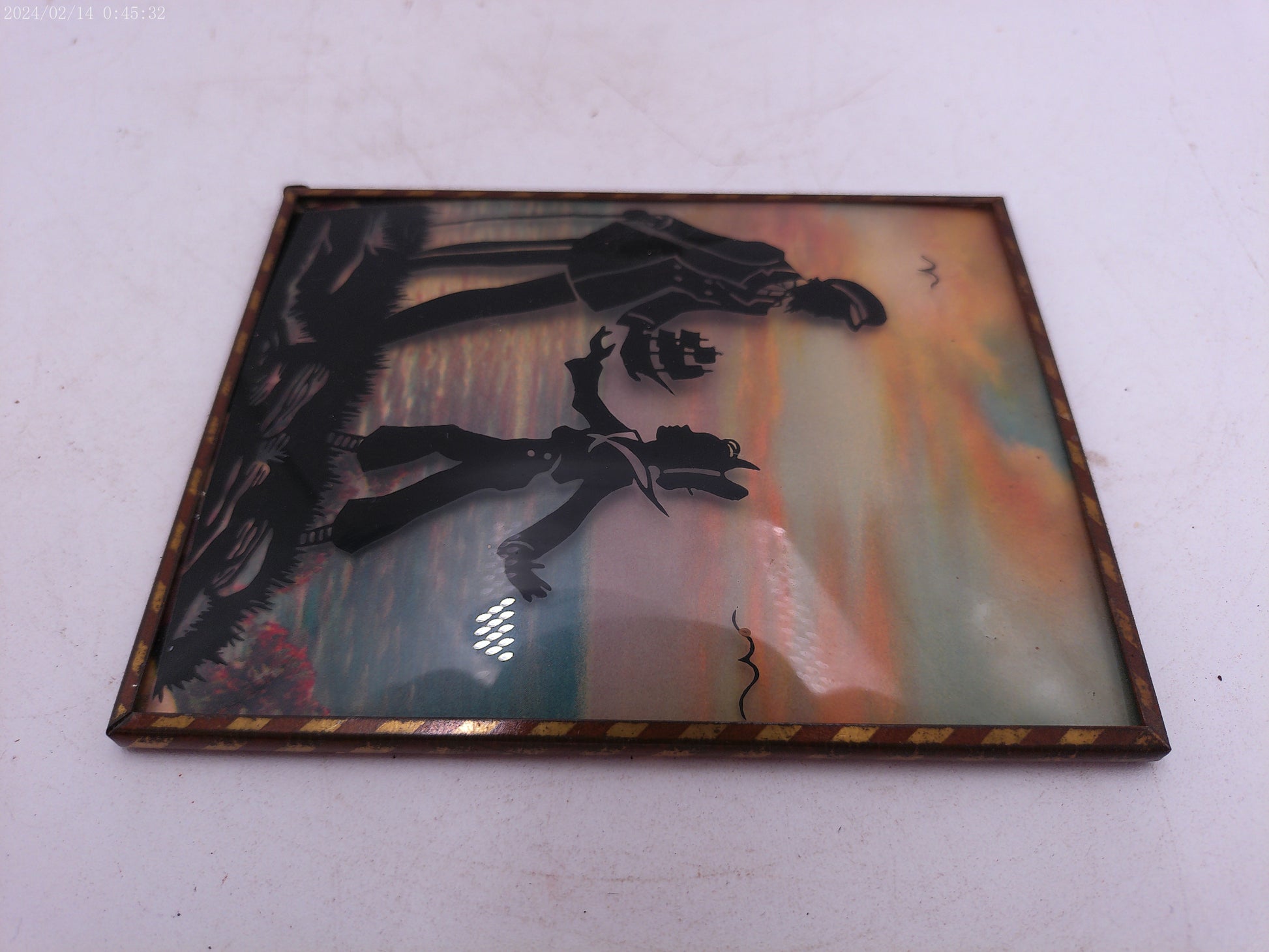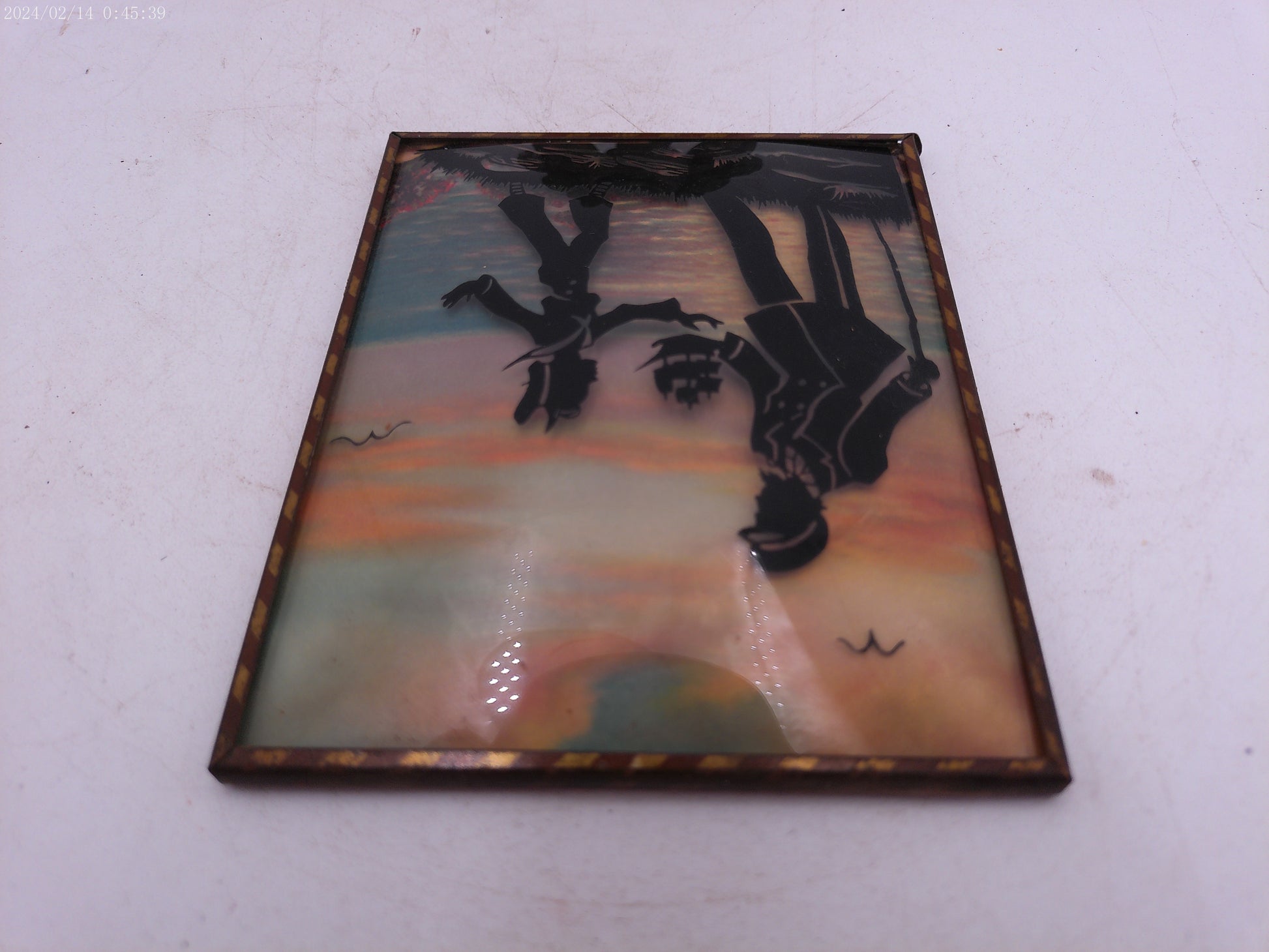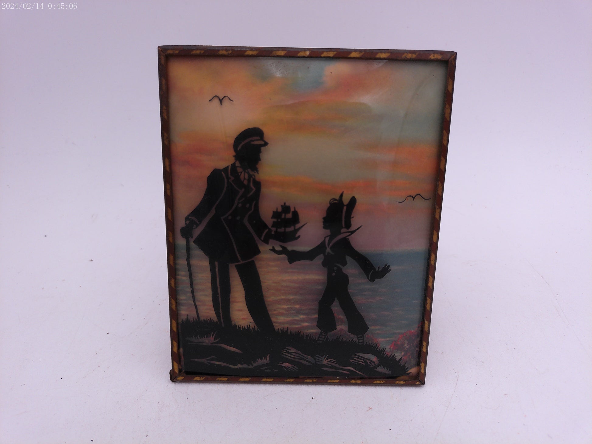 Glass Convex Silhouette Framed Picture Father and son with Toy Ship B53