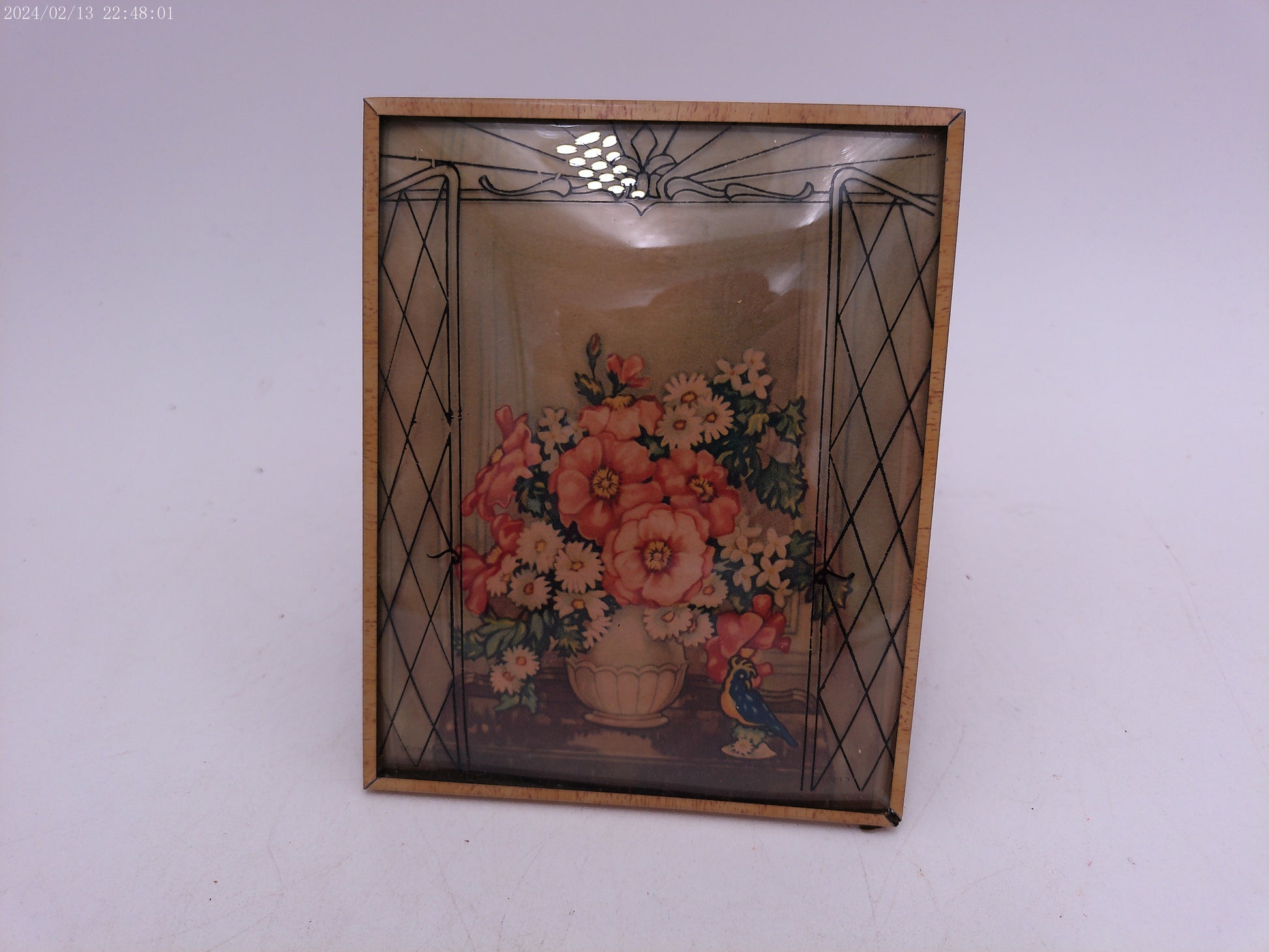 Glass Convex Silhouette Framed Picture Flowers Behind metal Fence B47