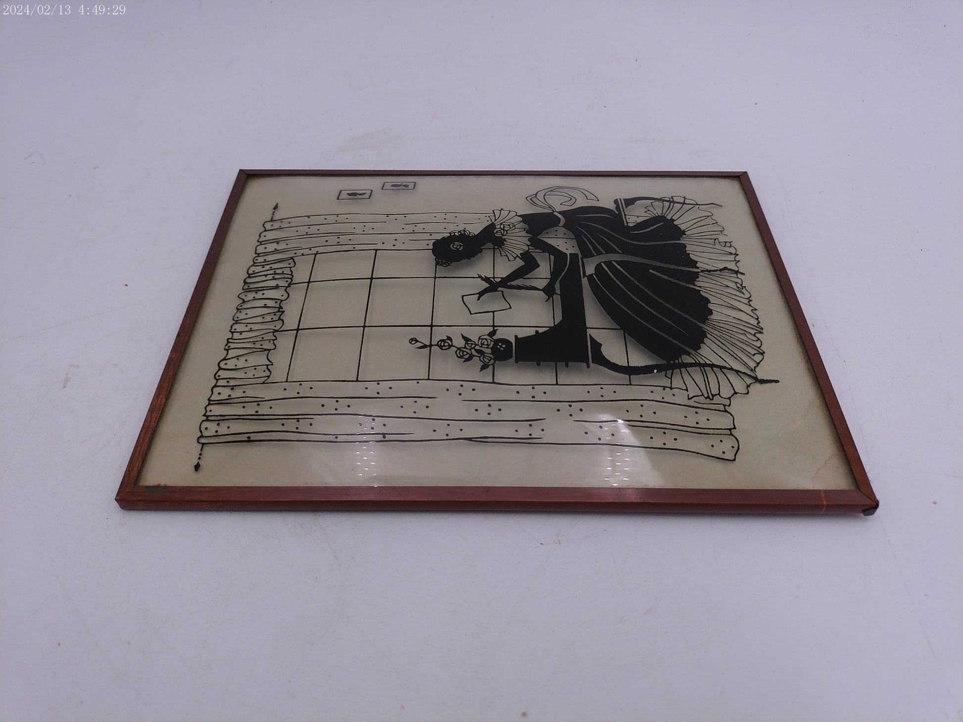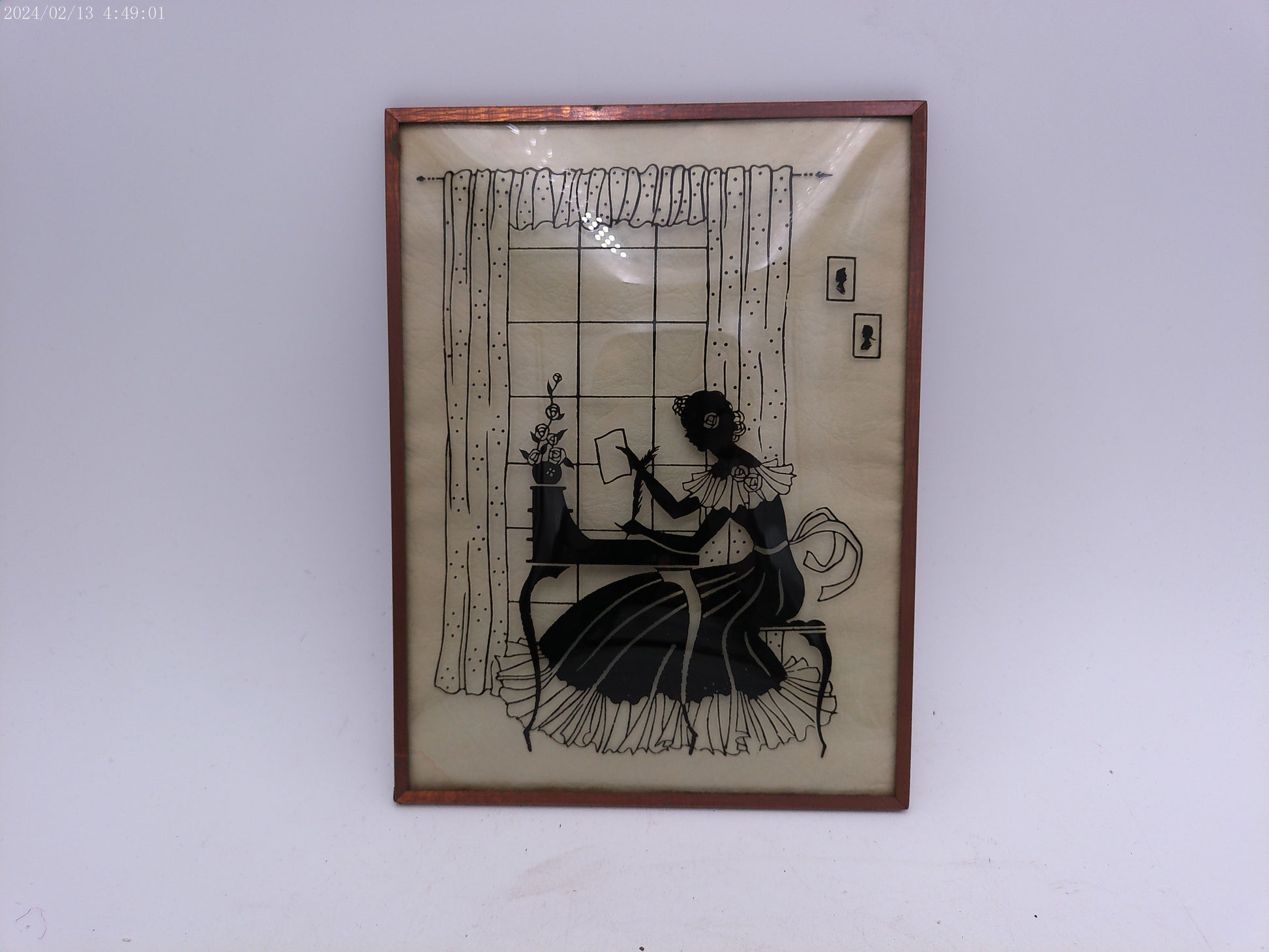 This Glass Convex Silhouette Framed Picture features a beautifully detailed depiction of a lady at her desk, encased in a metal frame. Add a touch of elegance to your home with this unique and timeless piece.