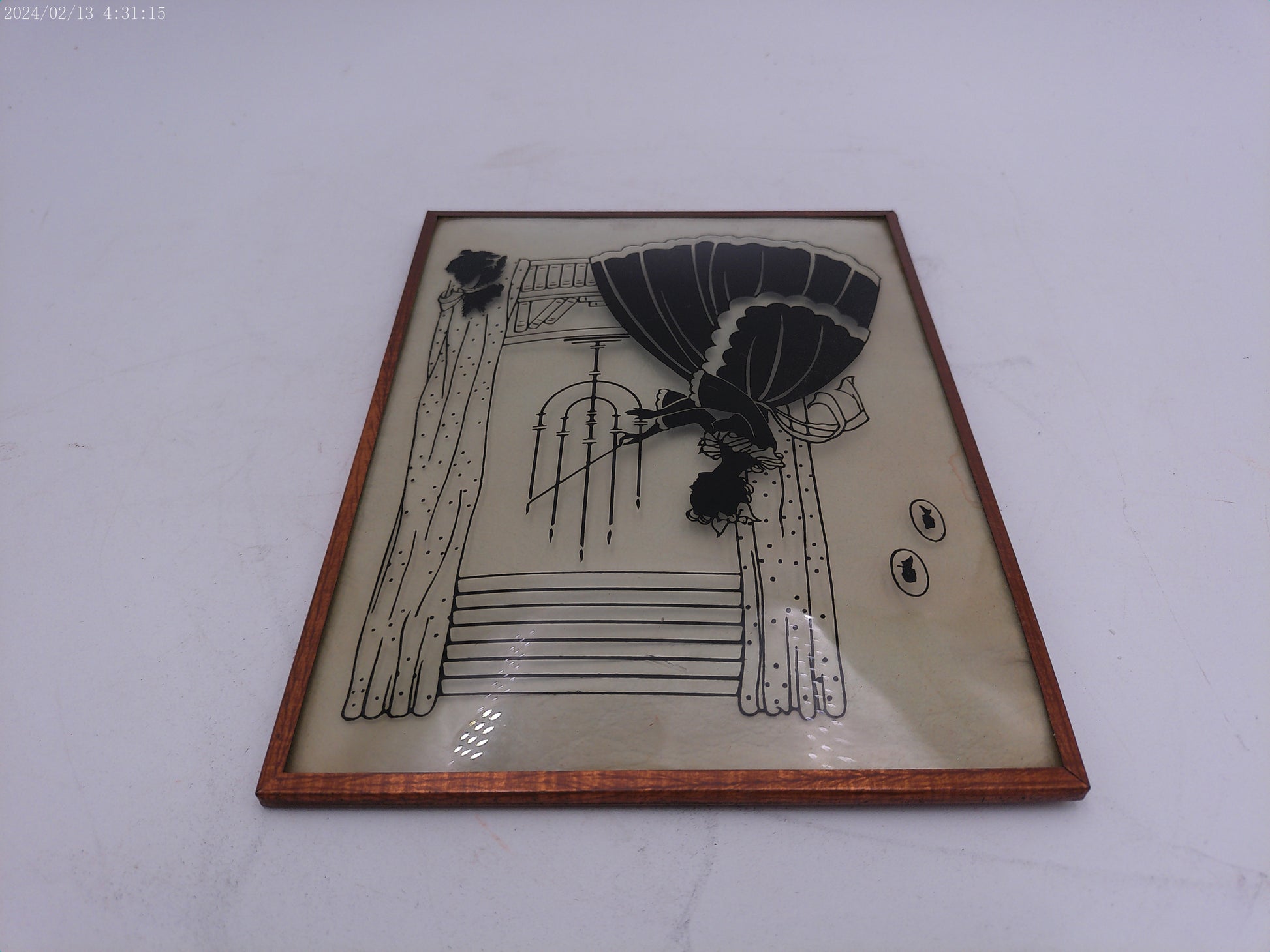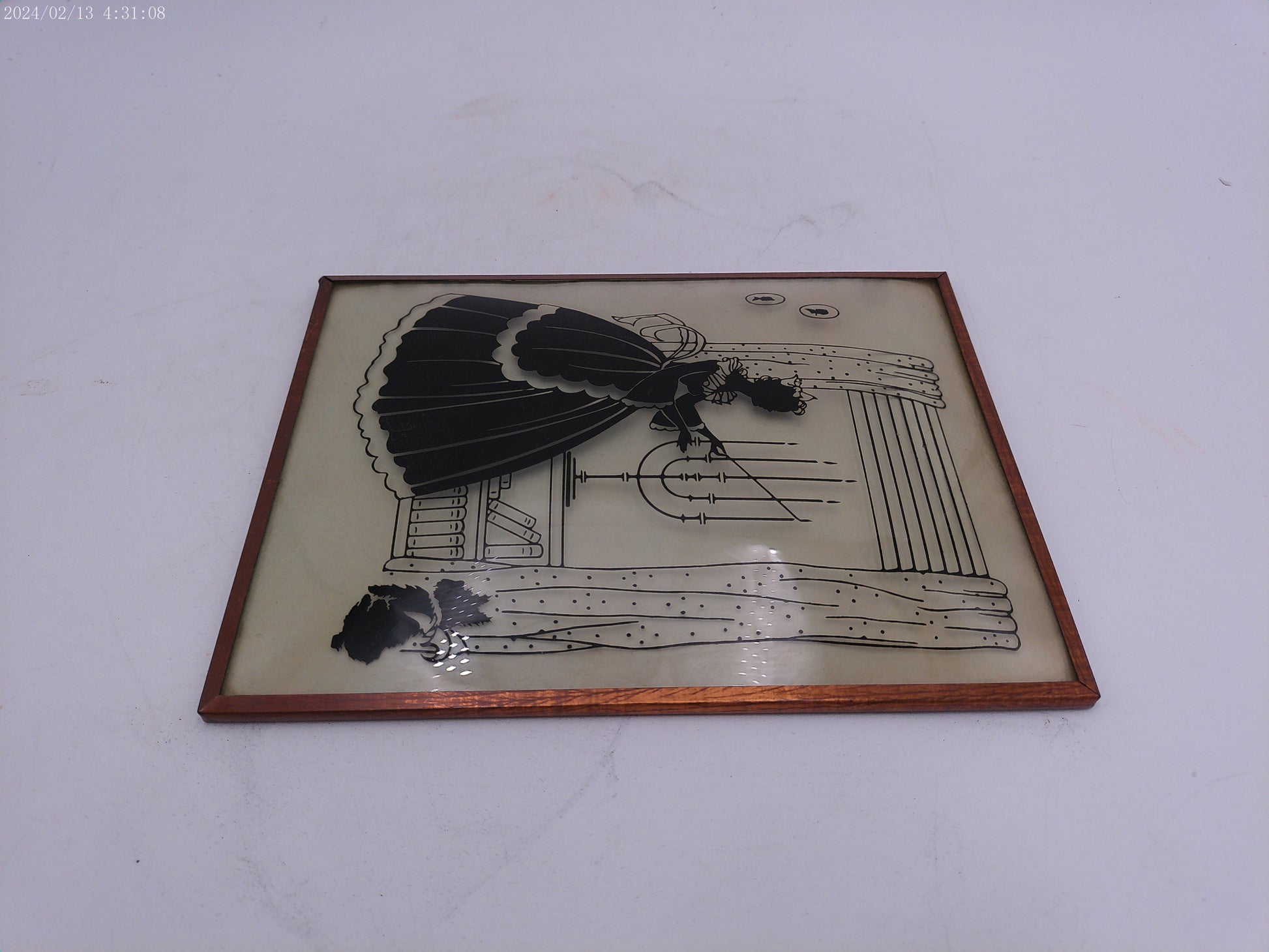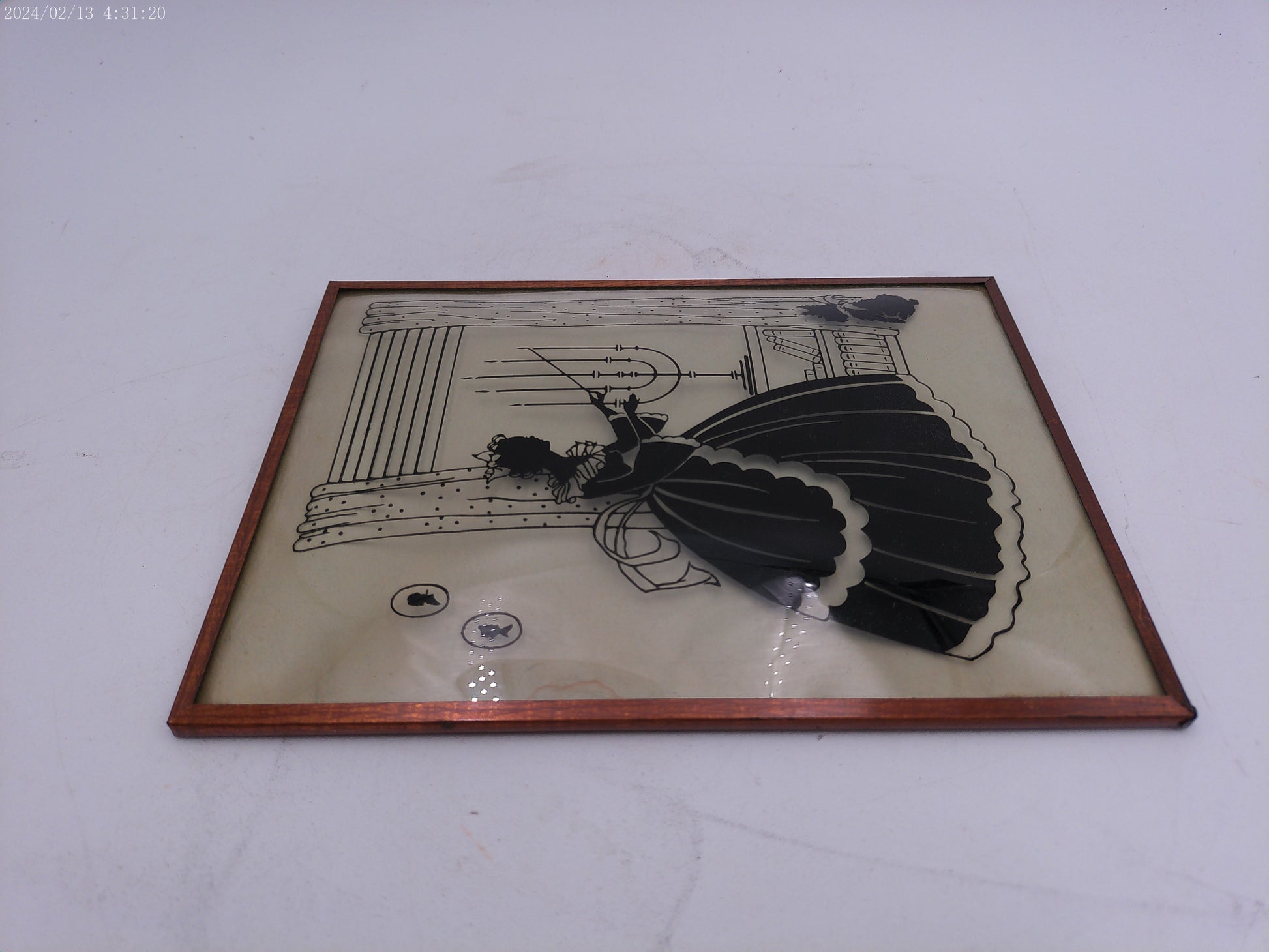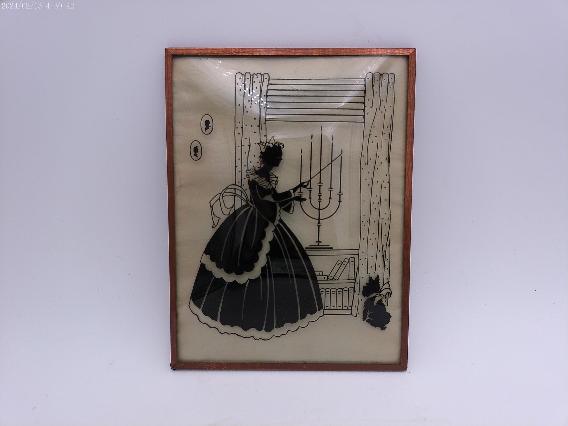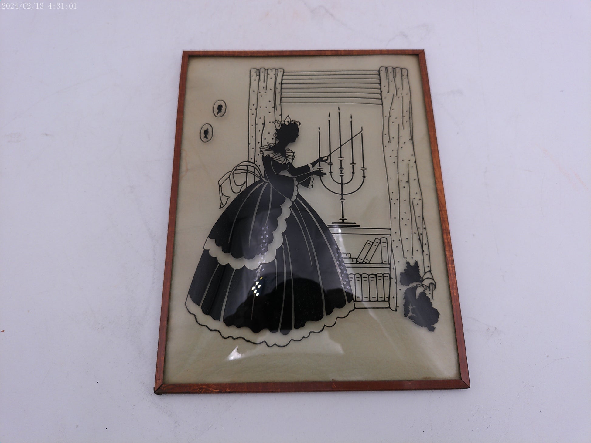 Glass Convex Silhouette Framed Picture Lady lighting Candle Vintage B14