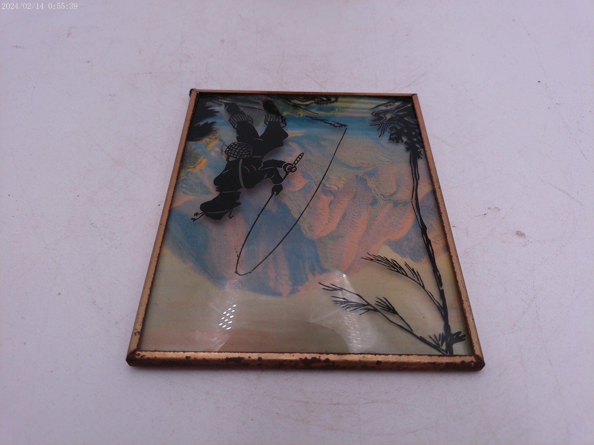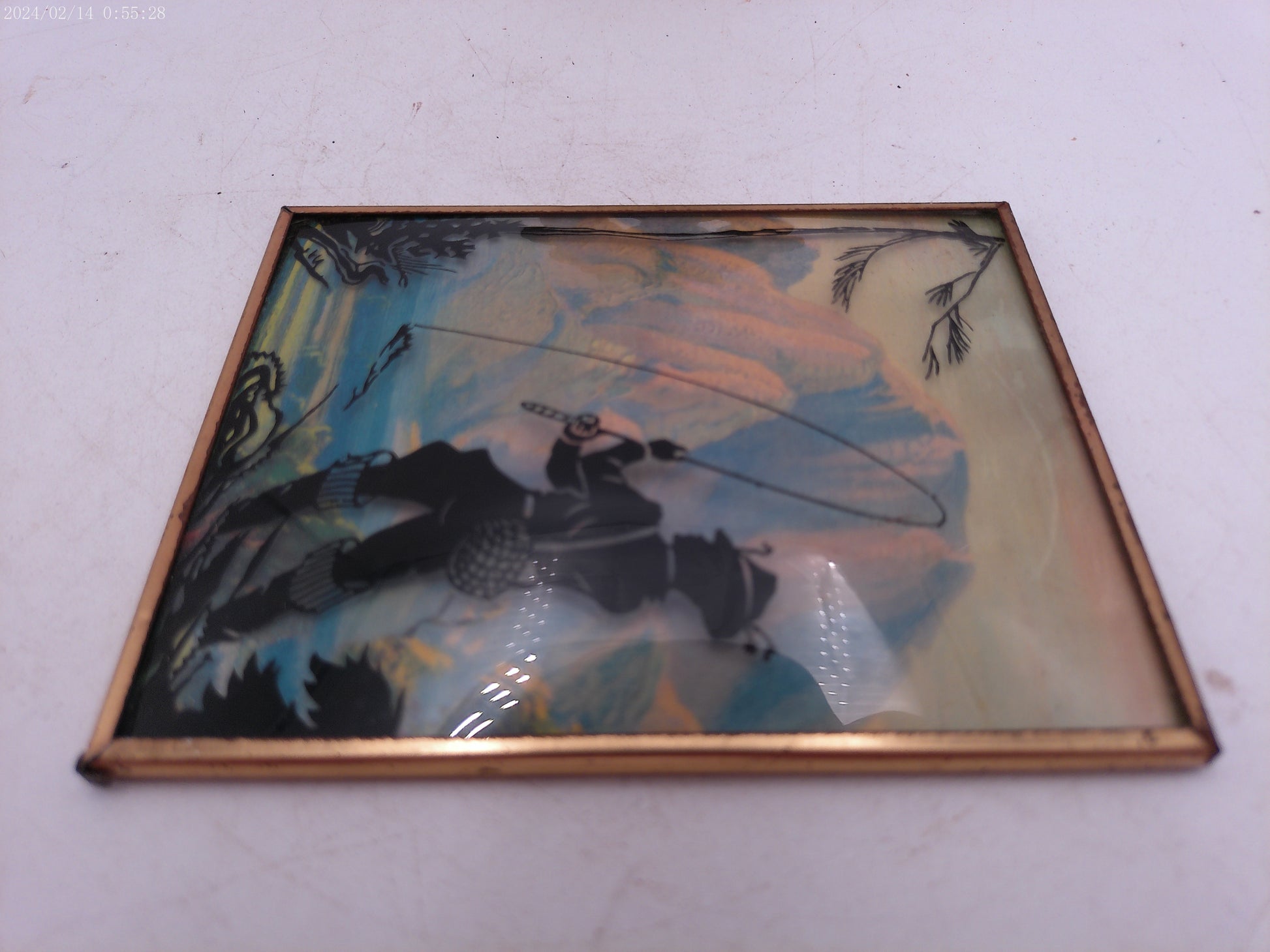 Glass Convex Silhouette Framed Picture Man Fishing B511