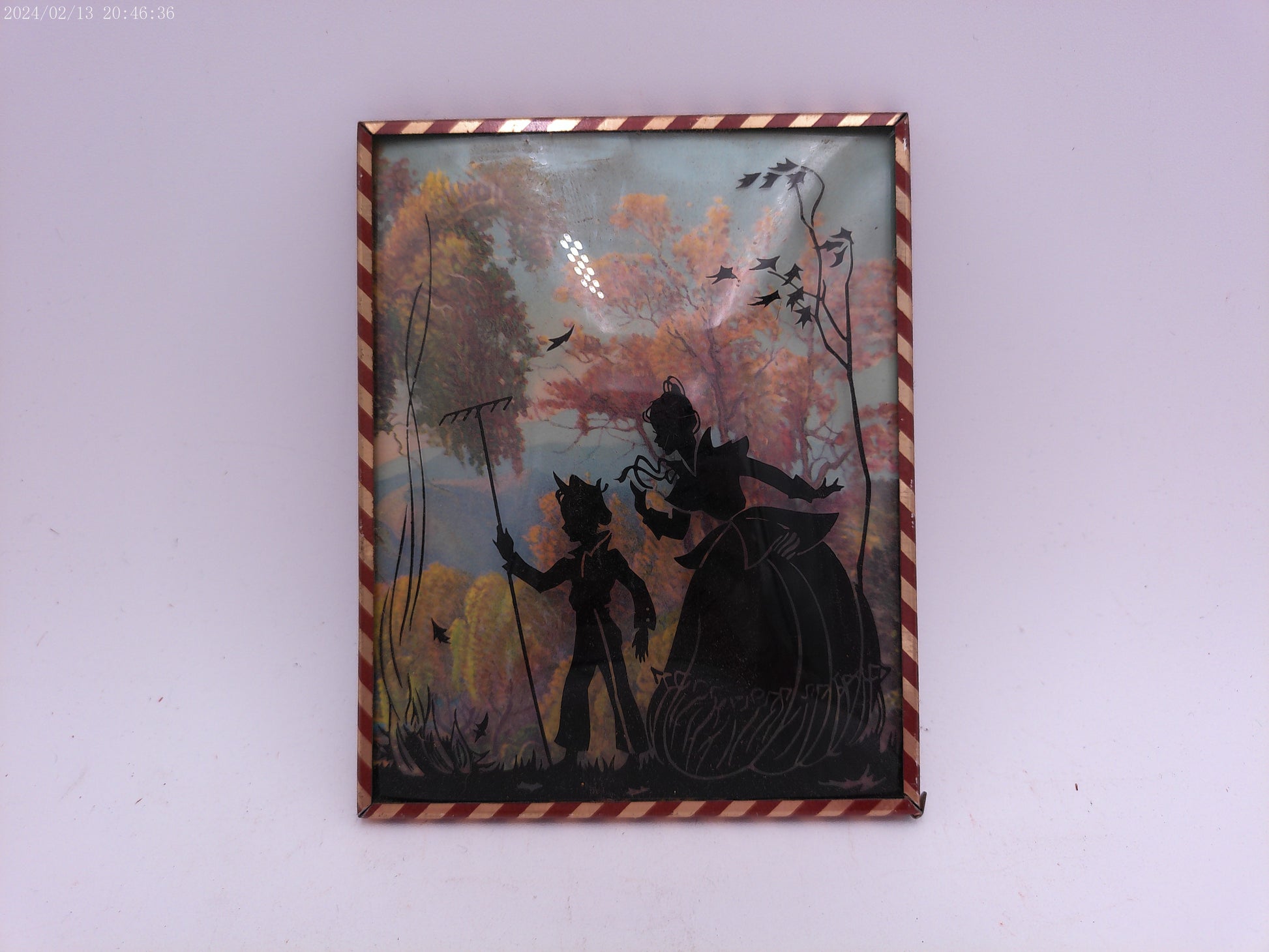 Glass Convex Silhouette Framed Picture Mother Child with Rake B28