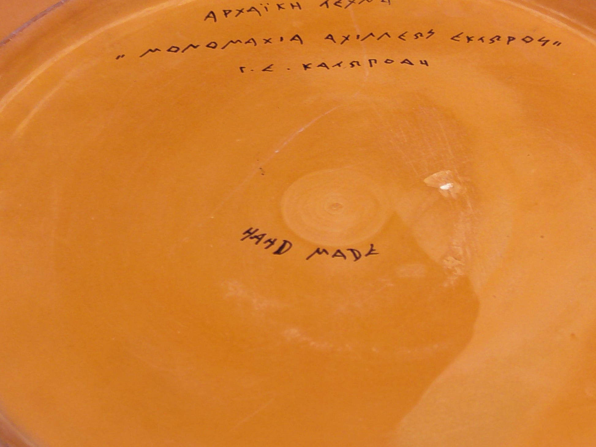 This hand-made pottery plate from Greece depicts Greek warriors with shield and sword. Painted by skilled artisans, this unique piece adds a touch of history and culture to any home decor. Made with care, this plate is a must-have for any collector or lover of Greek art.