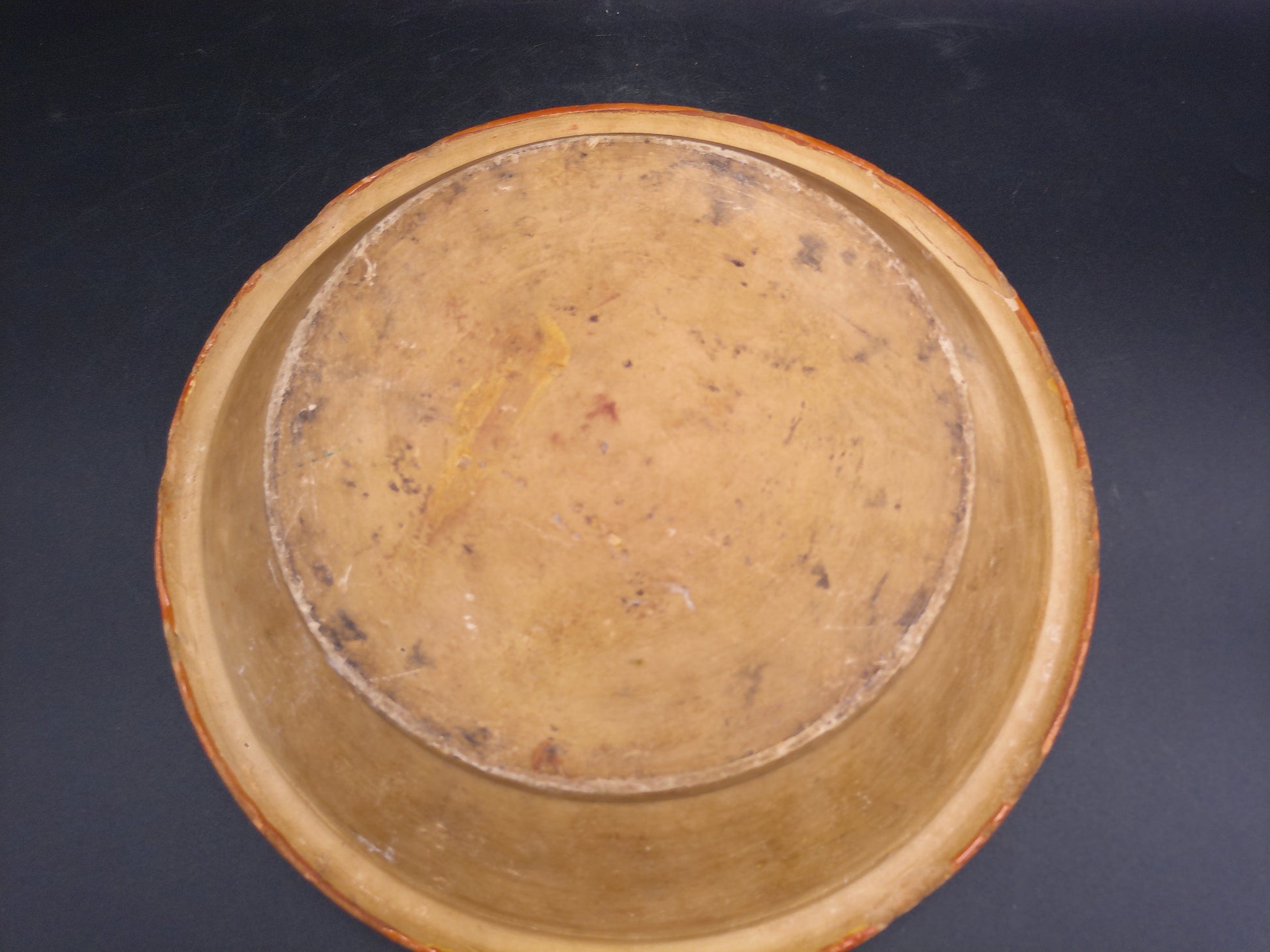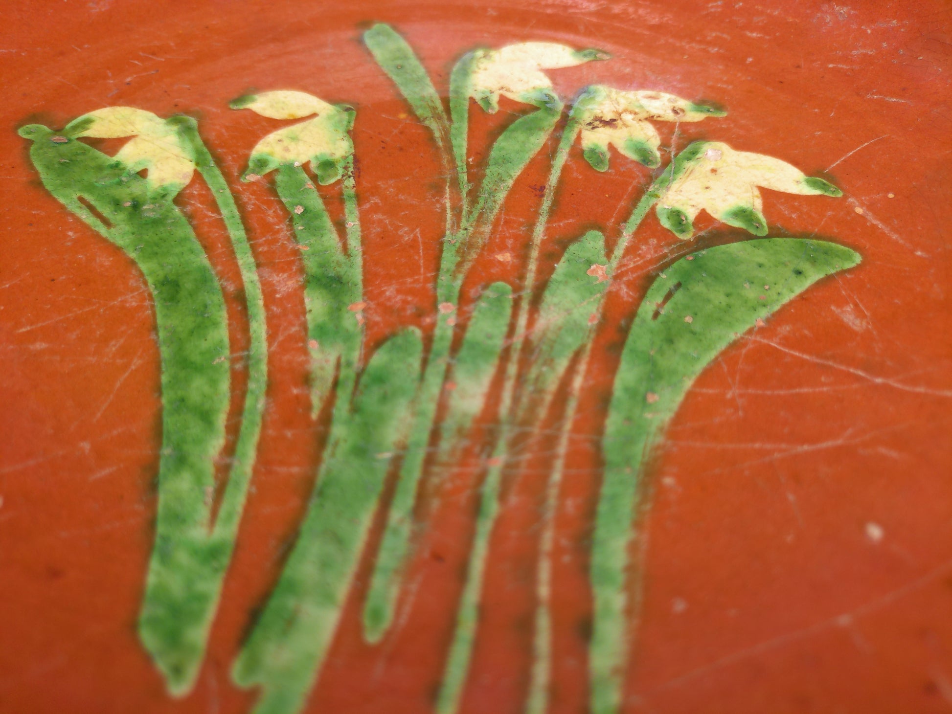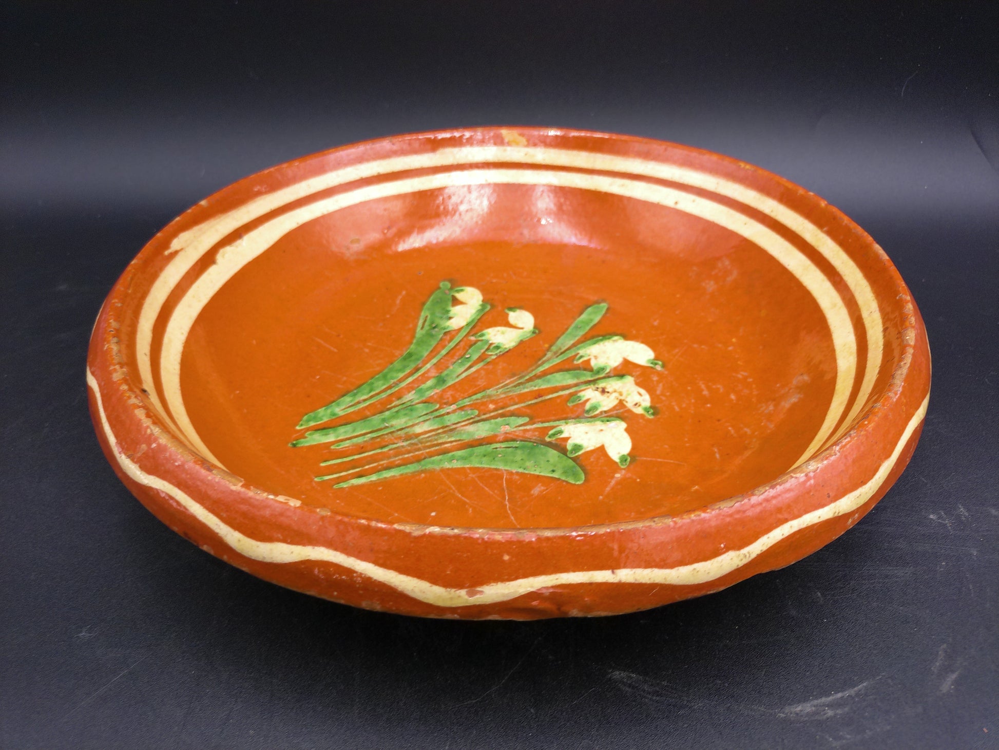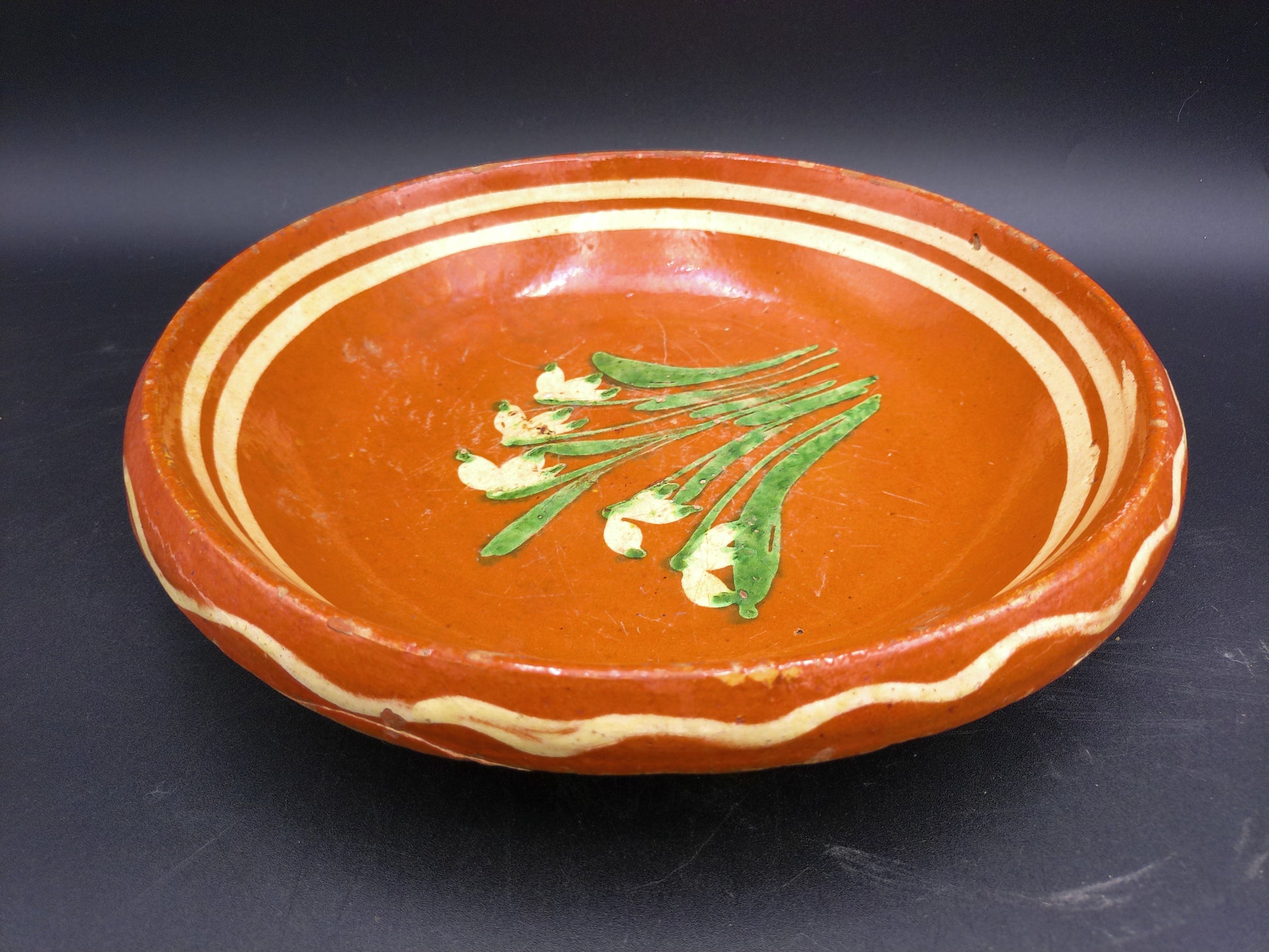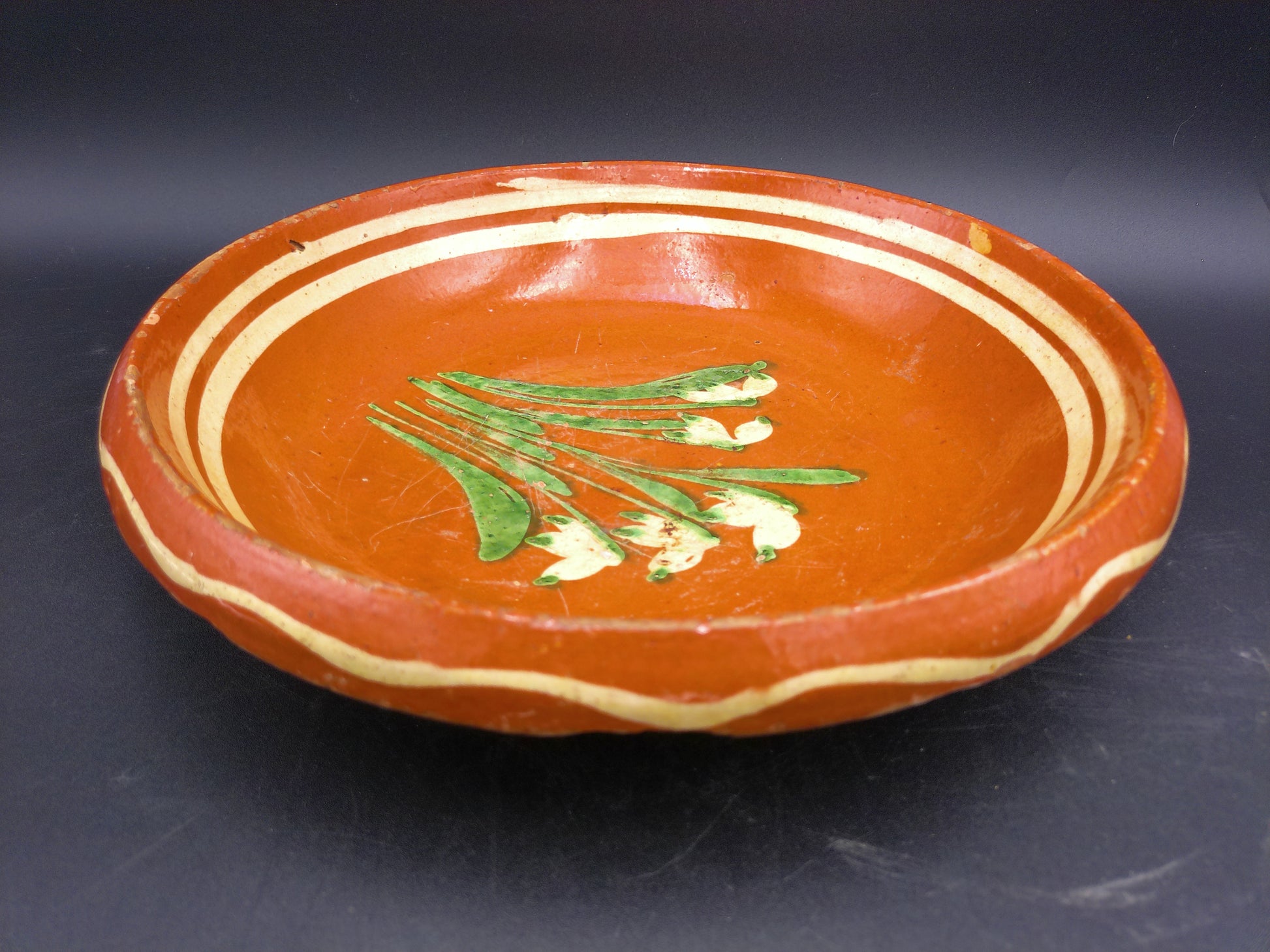 Hand Painted Antique Shallow Serving Bowl Green and White Flowers