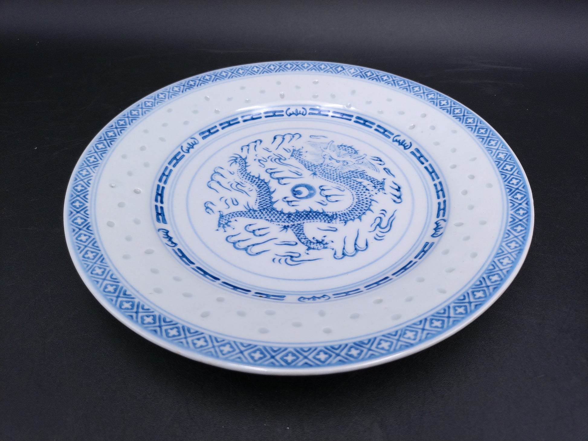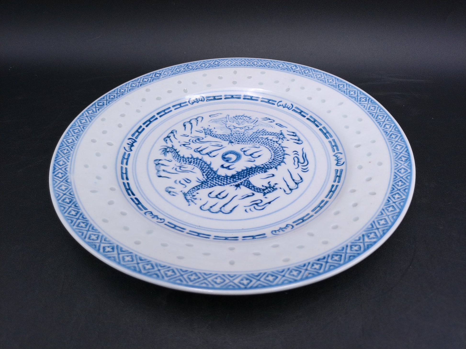 Expertly crafted in the Kangxi style, this set of 3 blue and white porcelain dishes features a fierce dragon motif and delicate floral design. With its timeless elegance, these dishes are a perfect addition to any collection. Hand-painted, each piece is unique and adds a touch of sophistication to any dining experience.