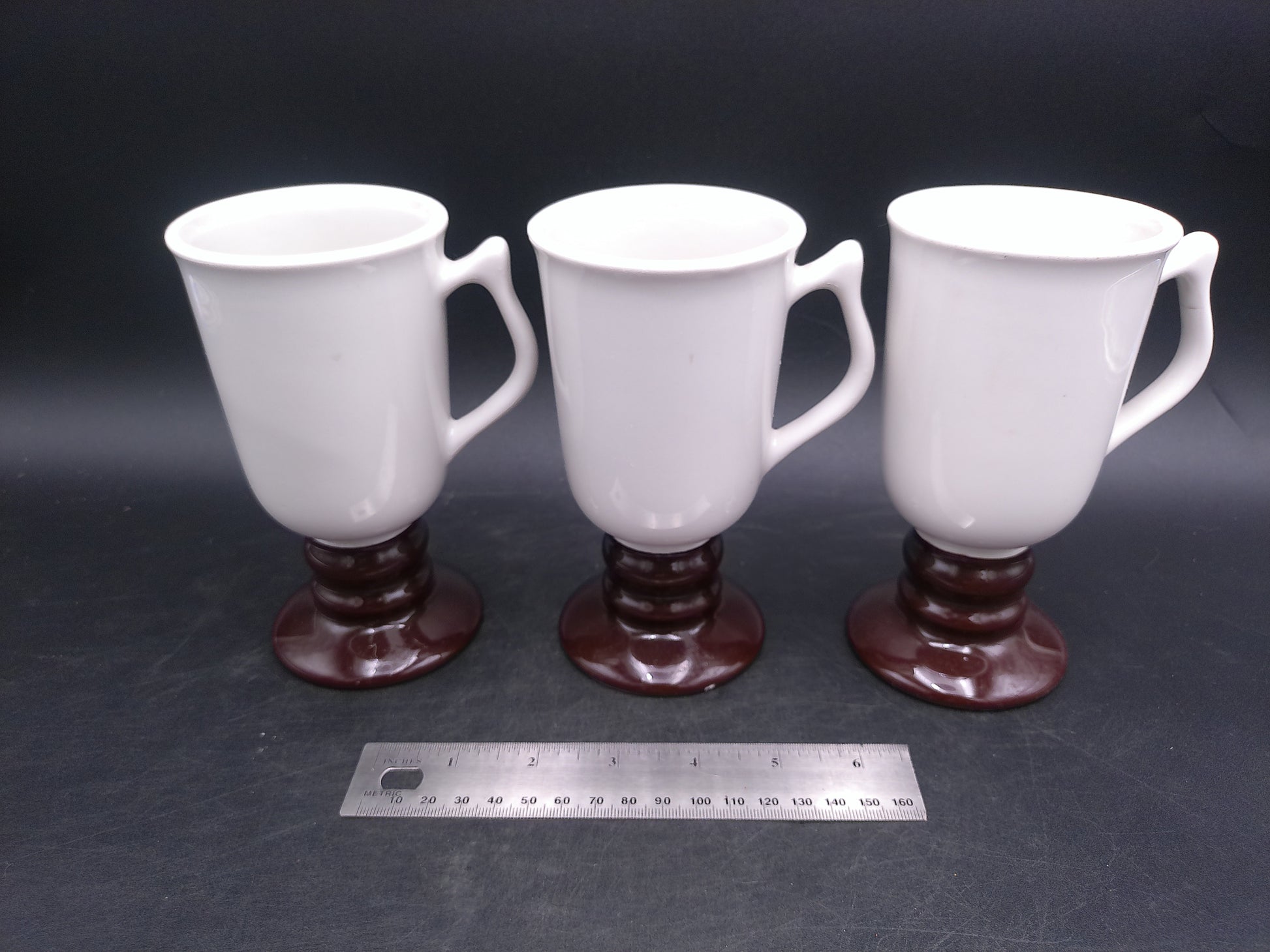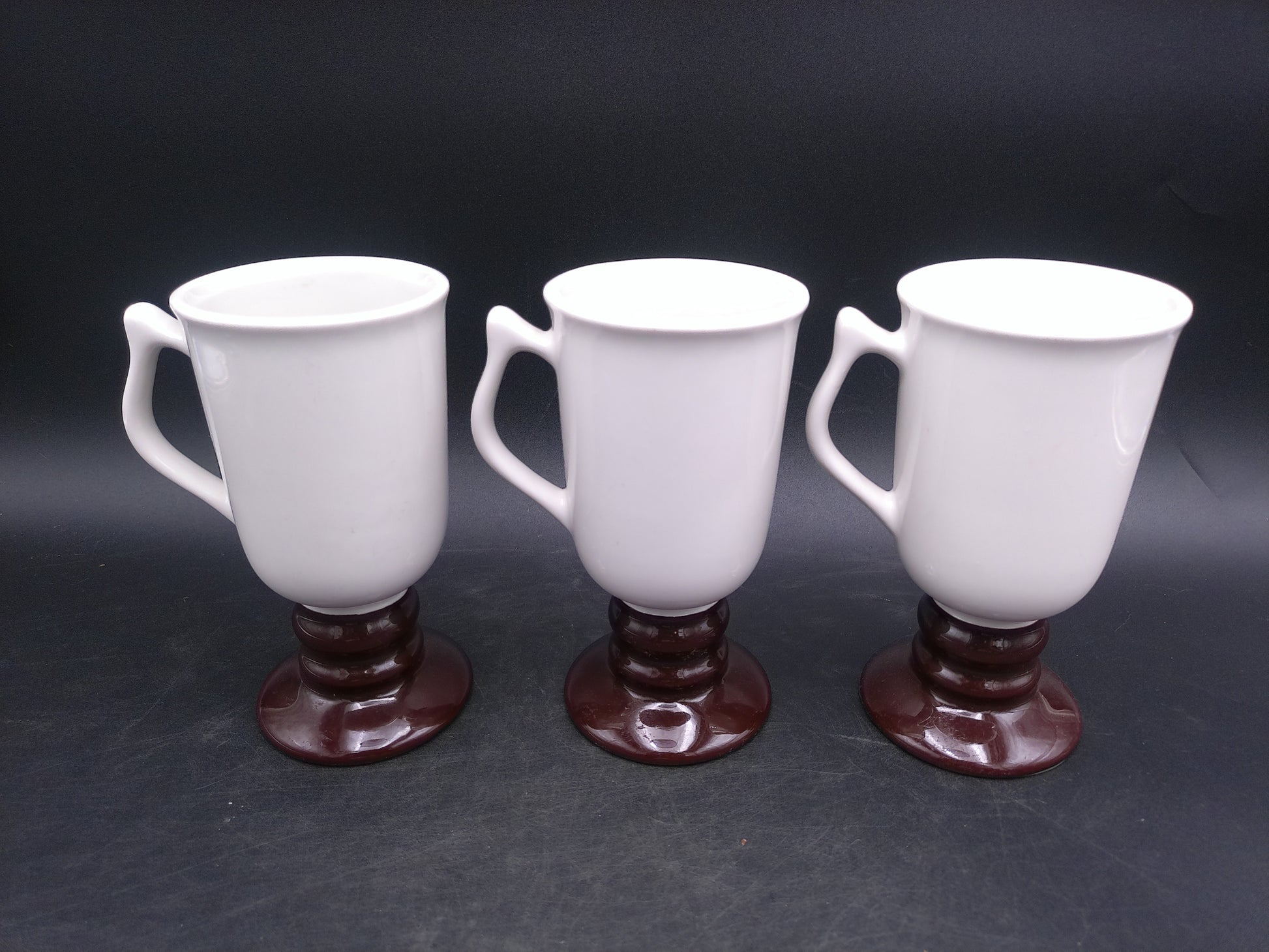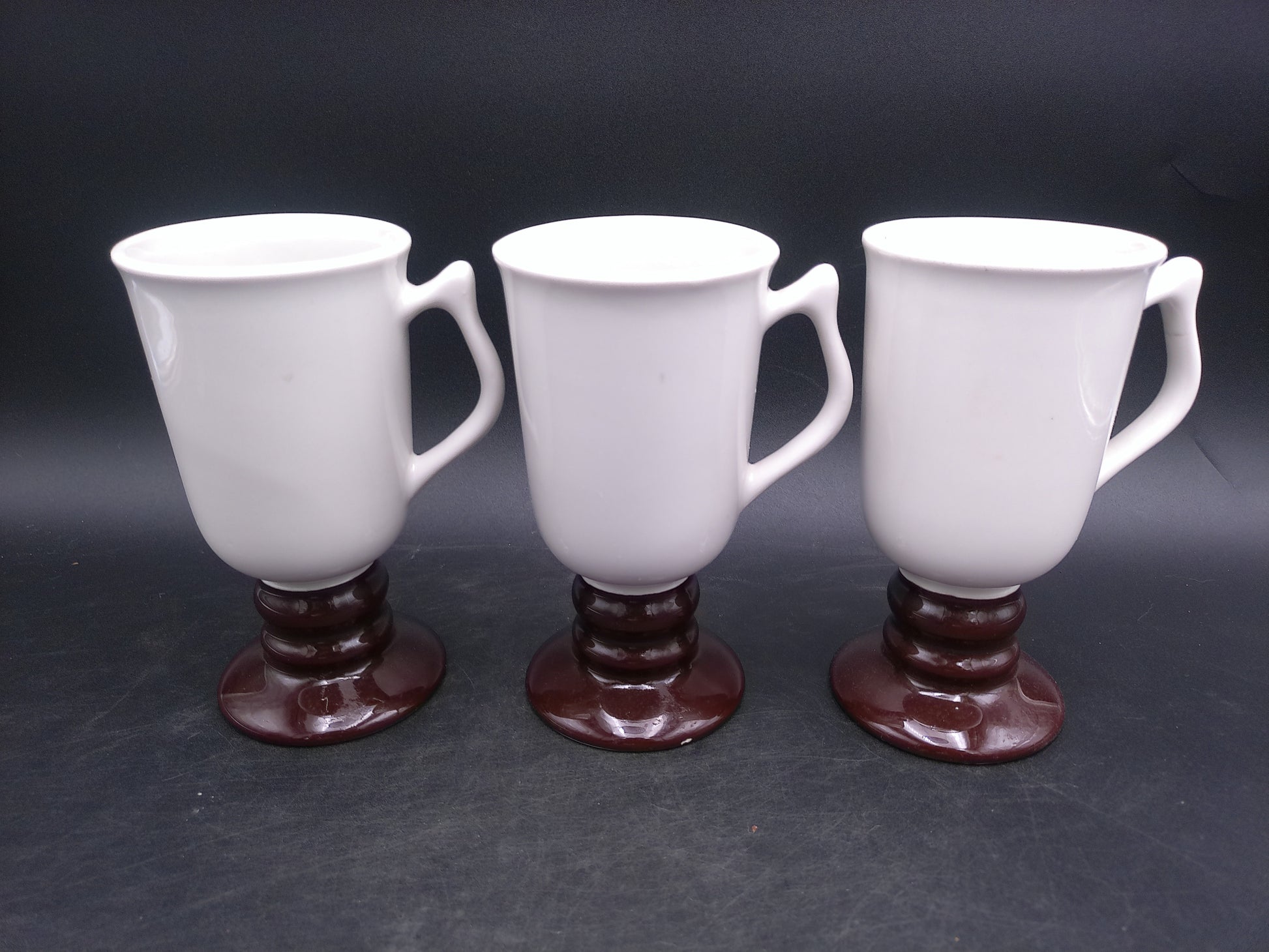 Elevate your coffee experience with this set of three Hall Pottery Irish Coffee Mugs. Each 6-inch mug features a classic white footed design paired with a warm brown pedestal, blending timeless style with sturdy craftsmanship. Perfect for serving Irish coffee or your favorite hot beverages, these mugs add a touch of elegance to any gathering. Durable and charming, they make a thoughtful gift or a stylish addition to your own collection. Enjoy every sip in mugs designed to impress and last.