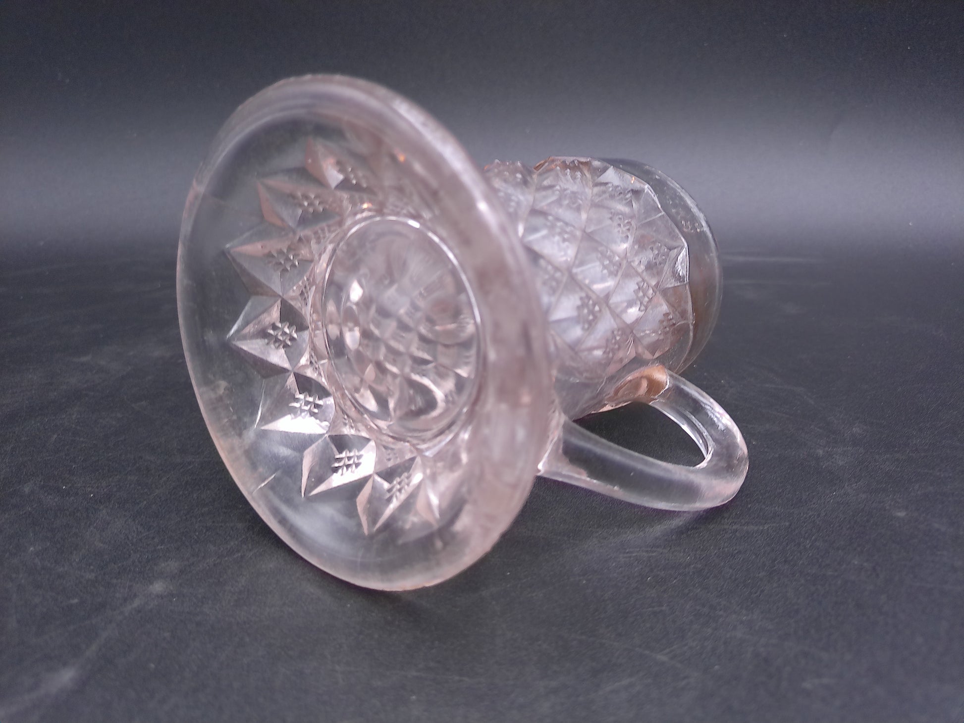 This Sylvan 1900s Early American Pressed Glass Creamer by Fostoria Glass Company features a beautiful gold colored rim. Made in the early 1900s, it adds a touch of elegance to any table setting. Crafted with precision and attention to detail, this creamer is a must-have for any collector.