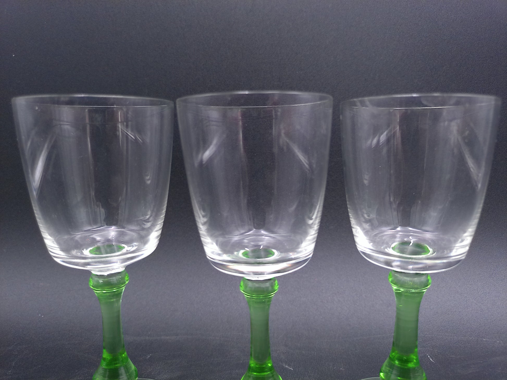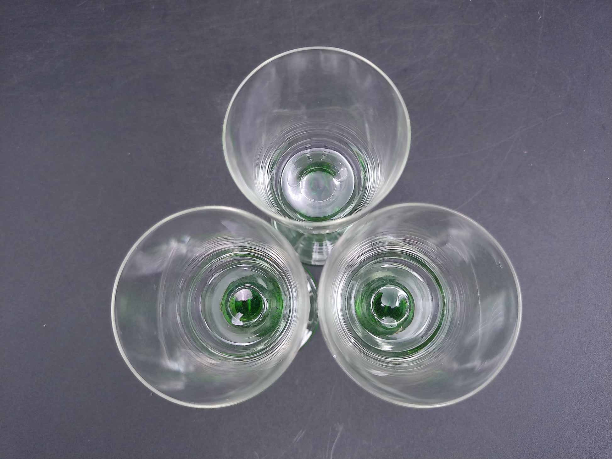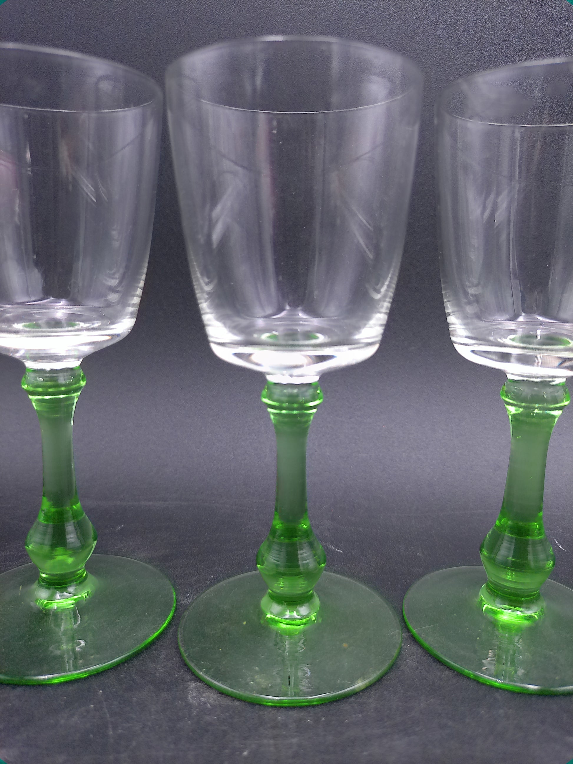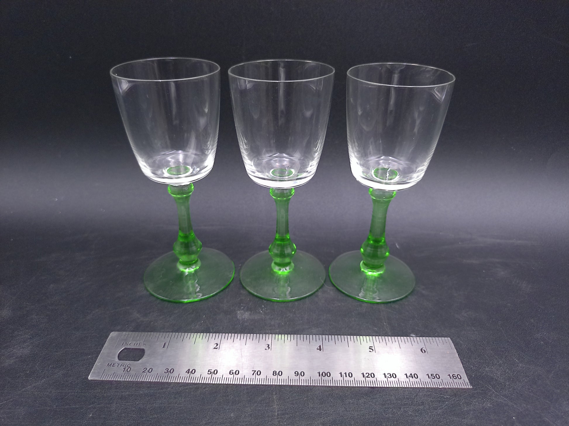 Set of 3 Vintage Glass Sherry Wine Liqueur Glasses with Green Stems