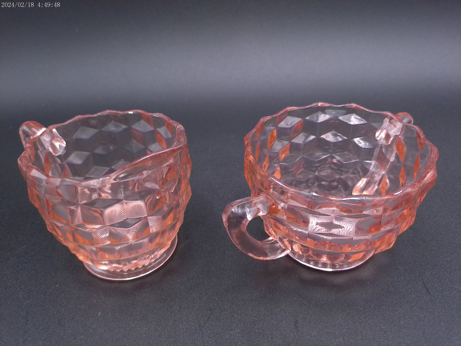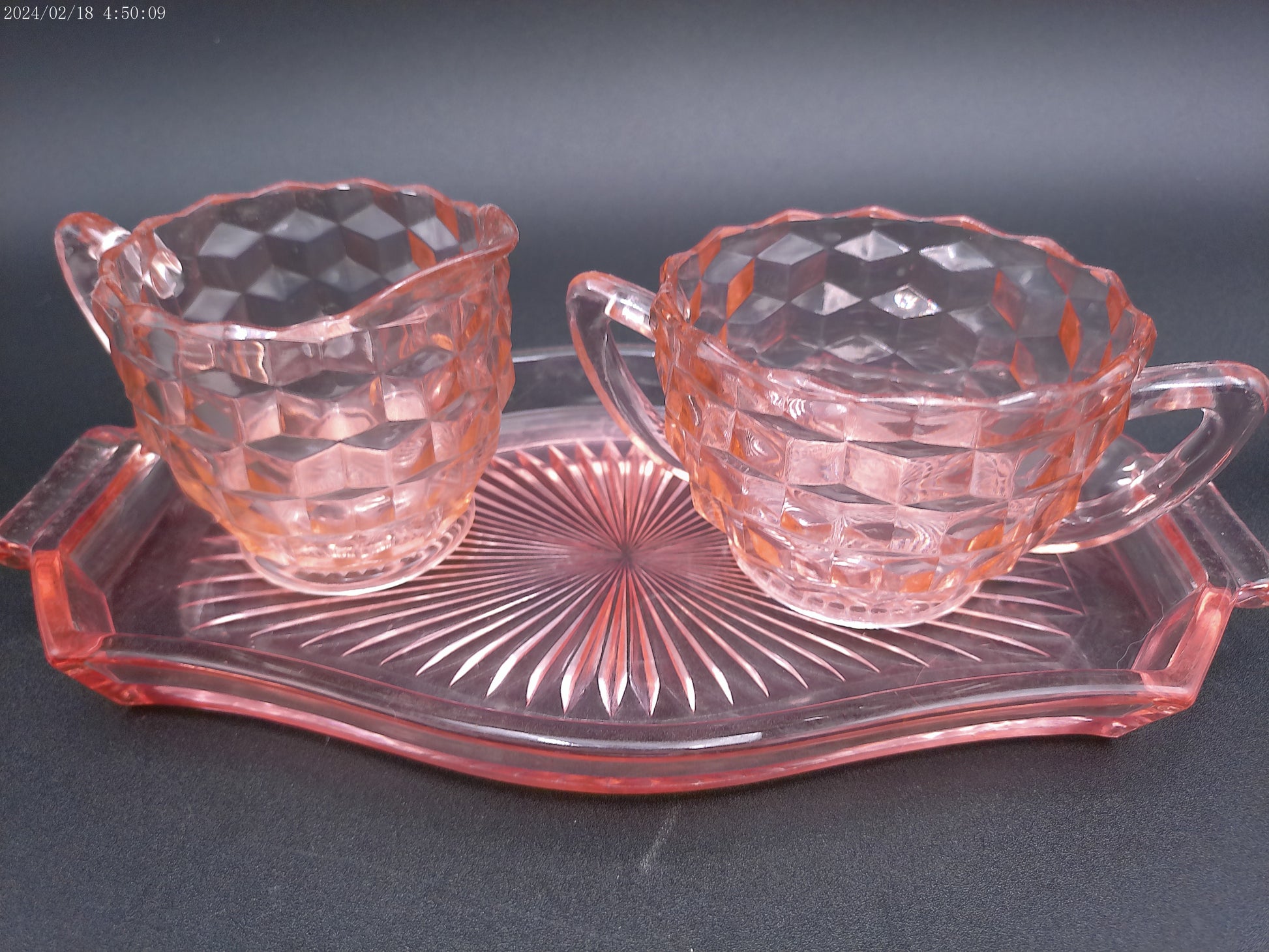 Jeannette pink 3pc glass set Windsor tray with cube creamer and sugar bowl