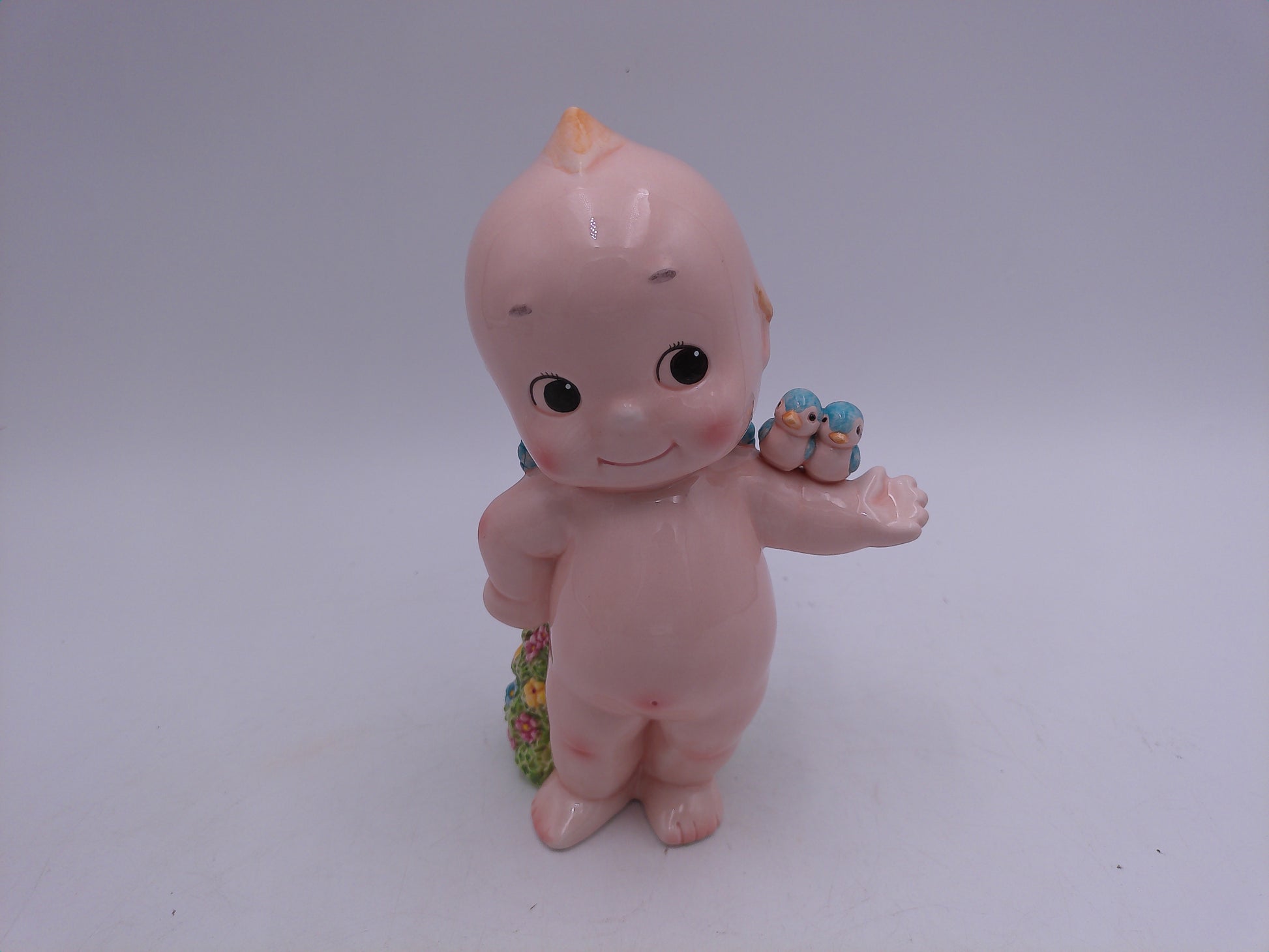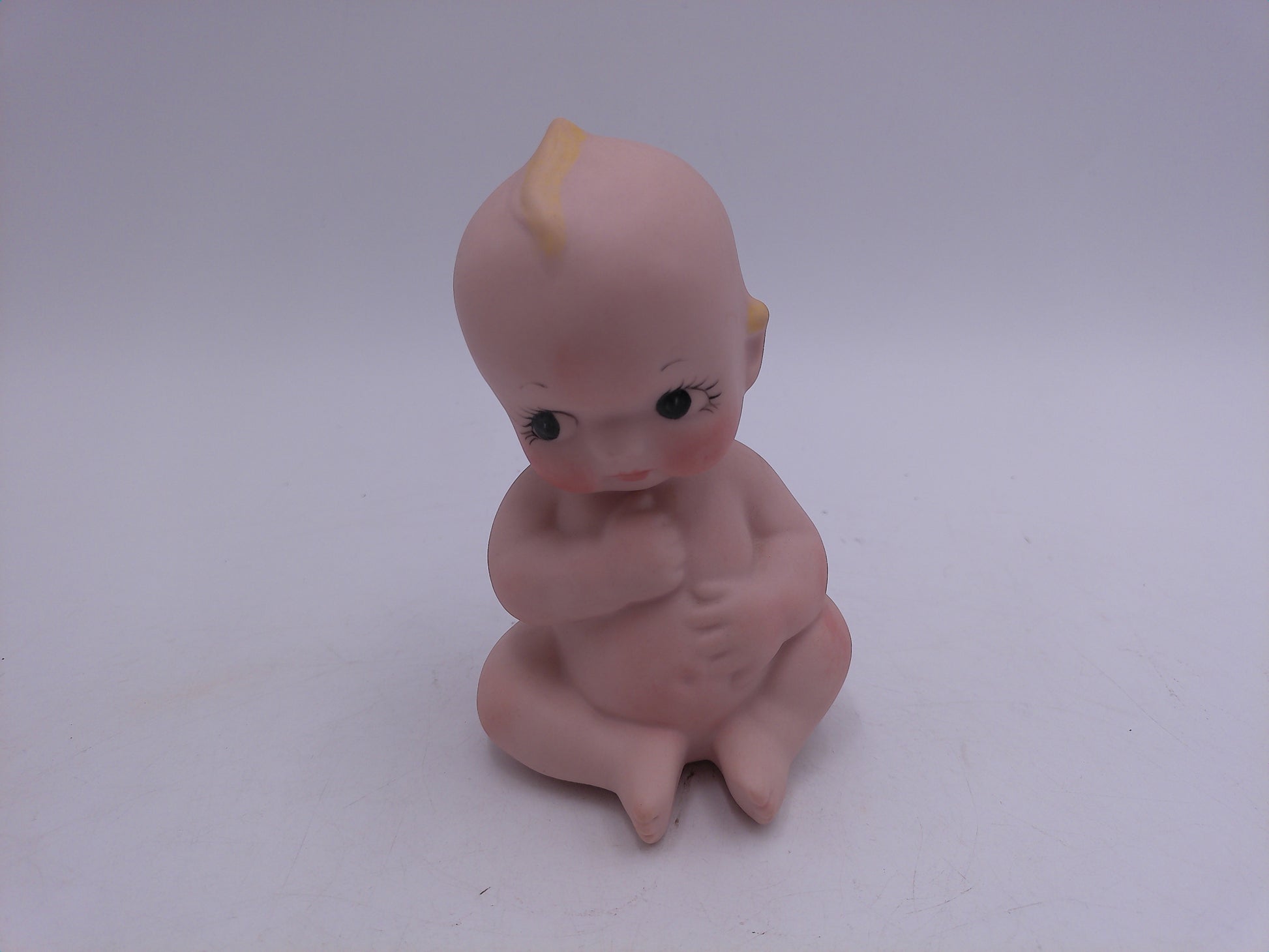 Get a lot of 4 adorable Kewpie figurines, including one that doubles as a bank! Made from quality bisque porcelain, these sitting figurines feature a cute Kewpie holding a heart. Perfect for collectors or as a charming addition to your home decor.