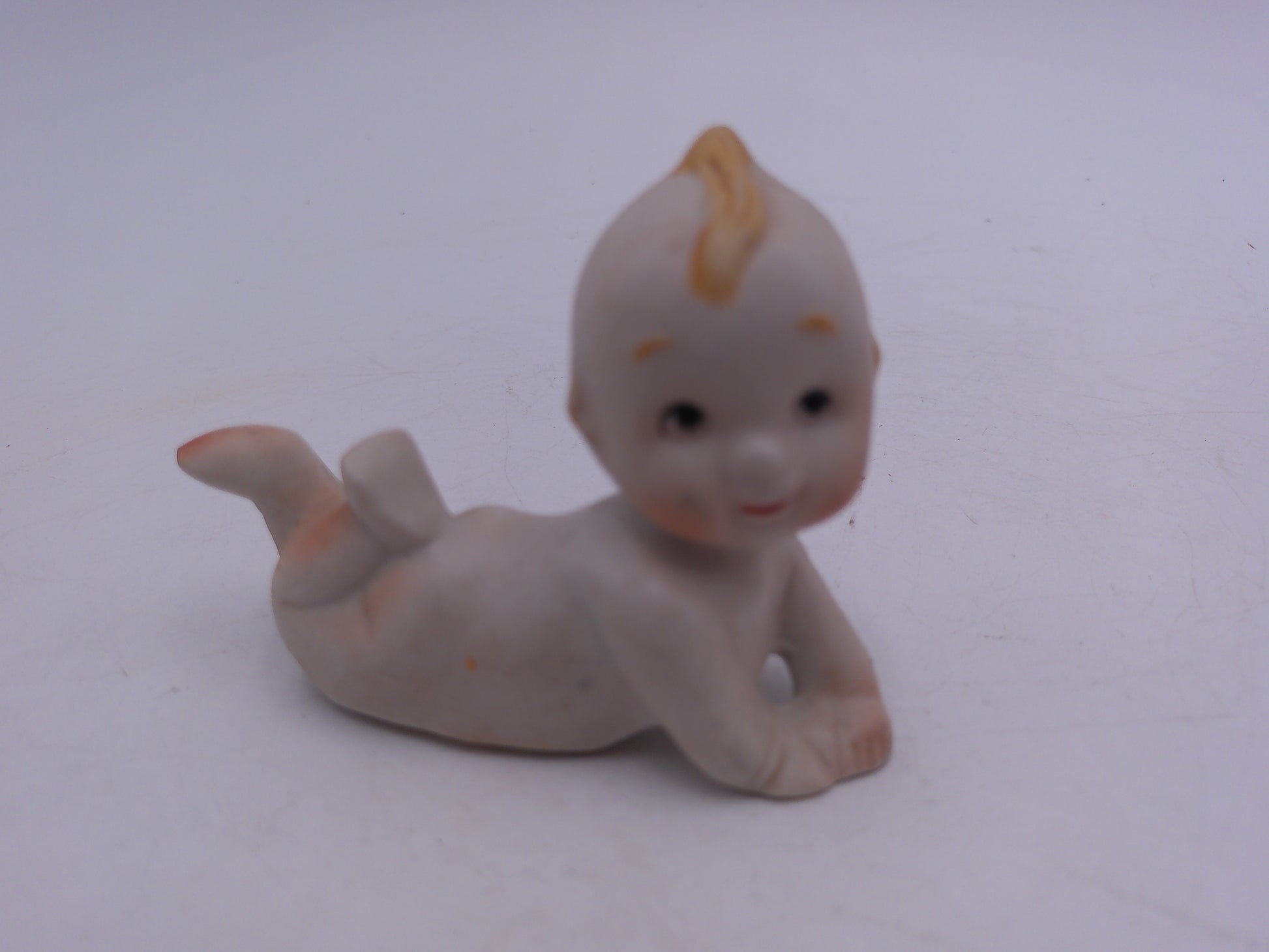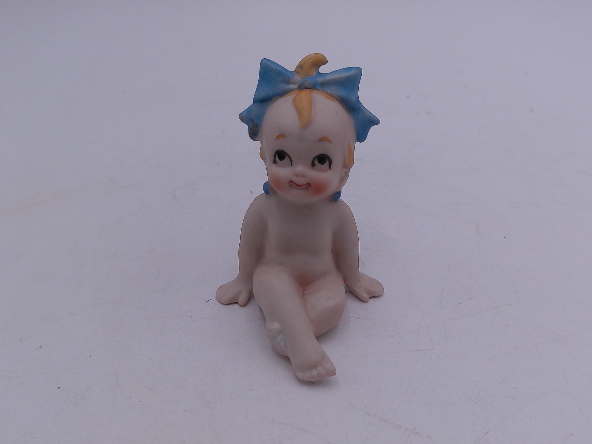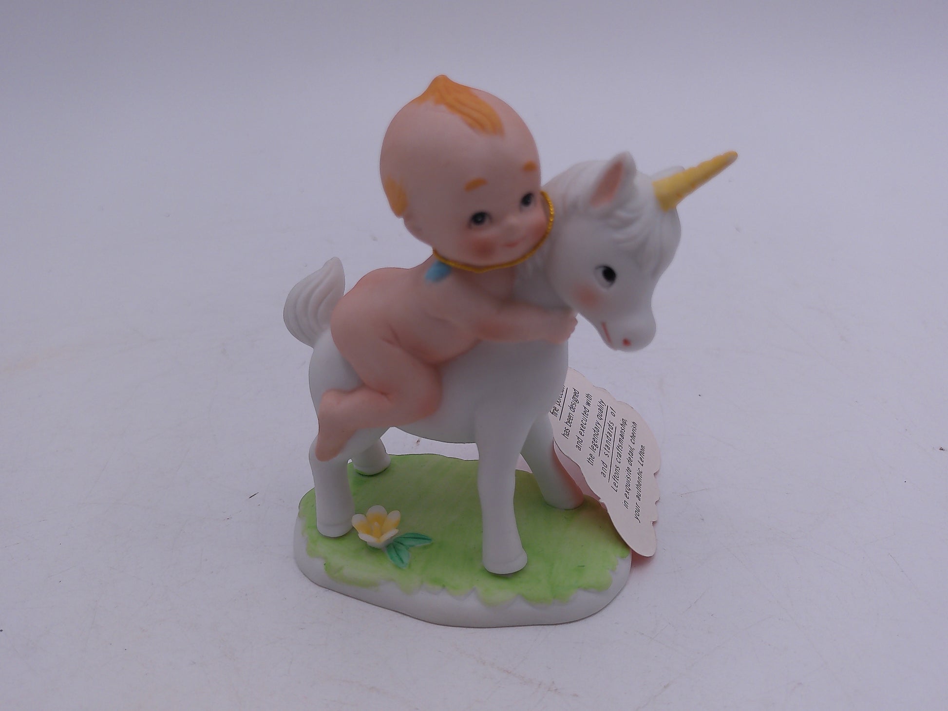 1985 LEFTON Bisque Blue Wing Kewpie with Unicorn, Girl Baby with Blue Bow Porcelain Bisque Figurine