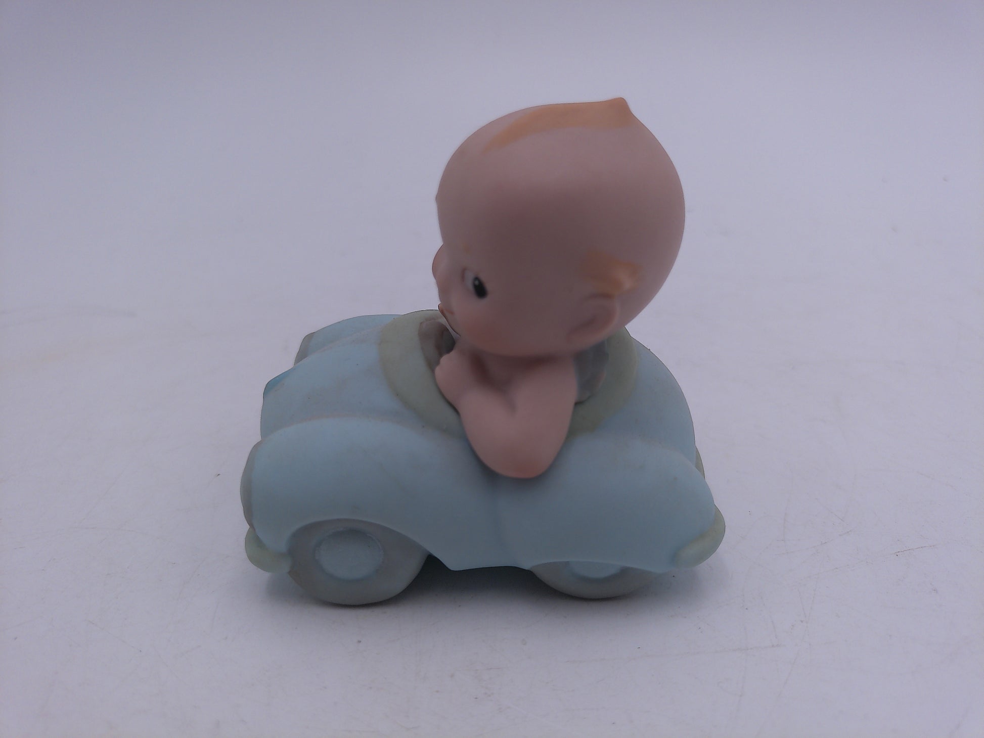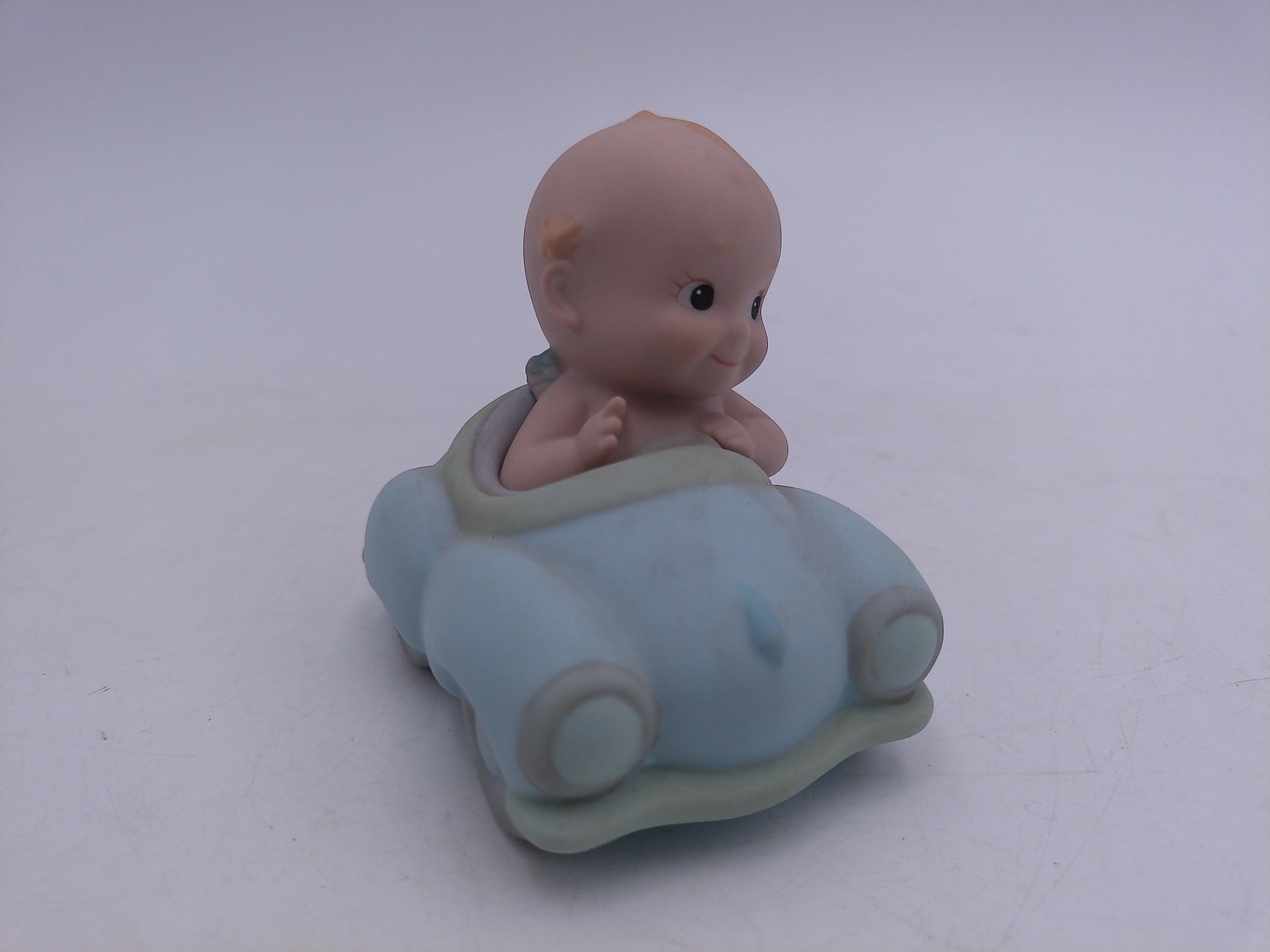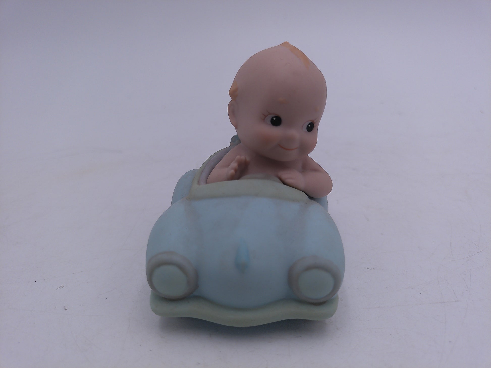 Kewpie Bisque Figurine, Boy With Blue Wings, In Blue Car Vintage
