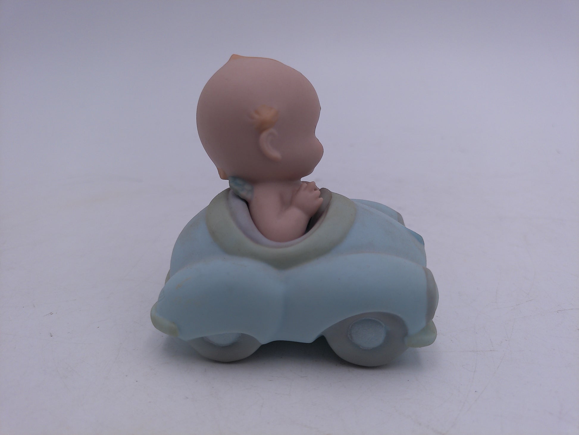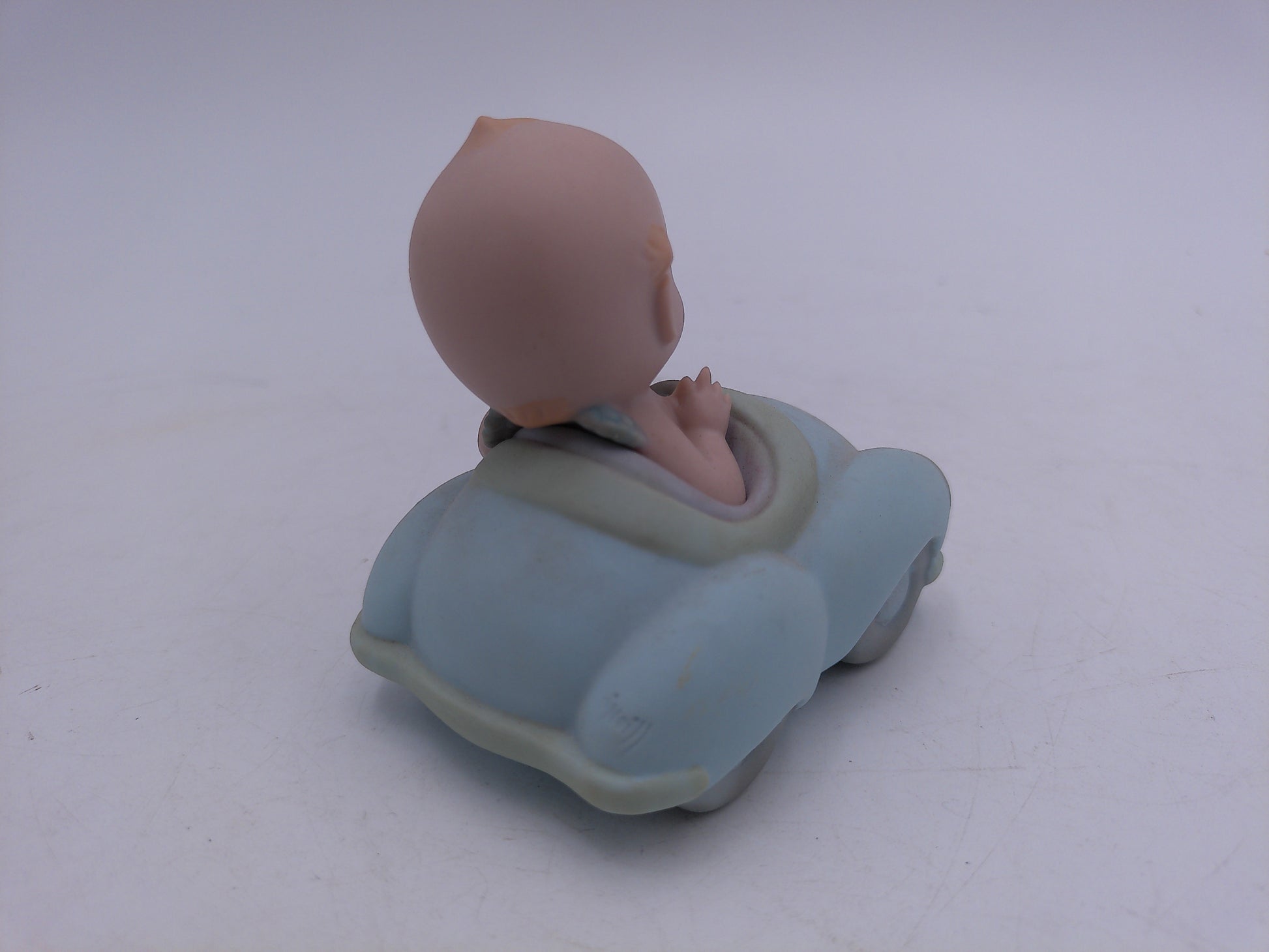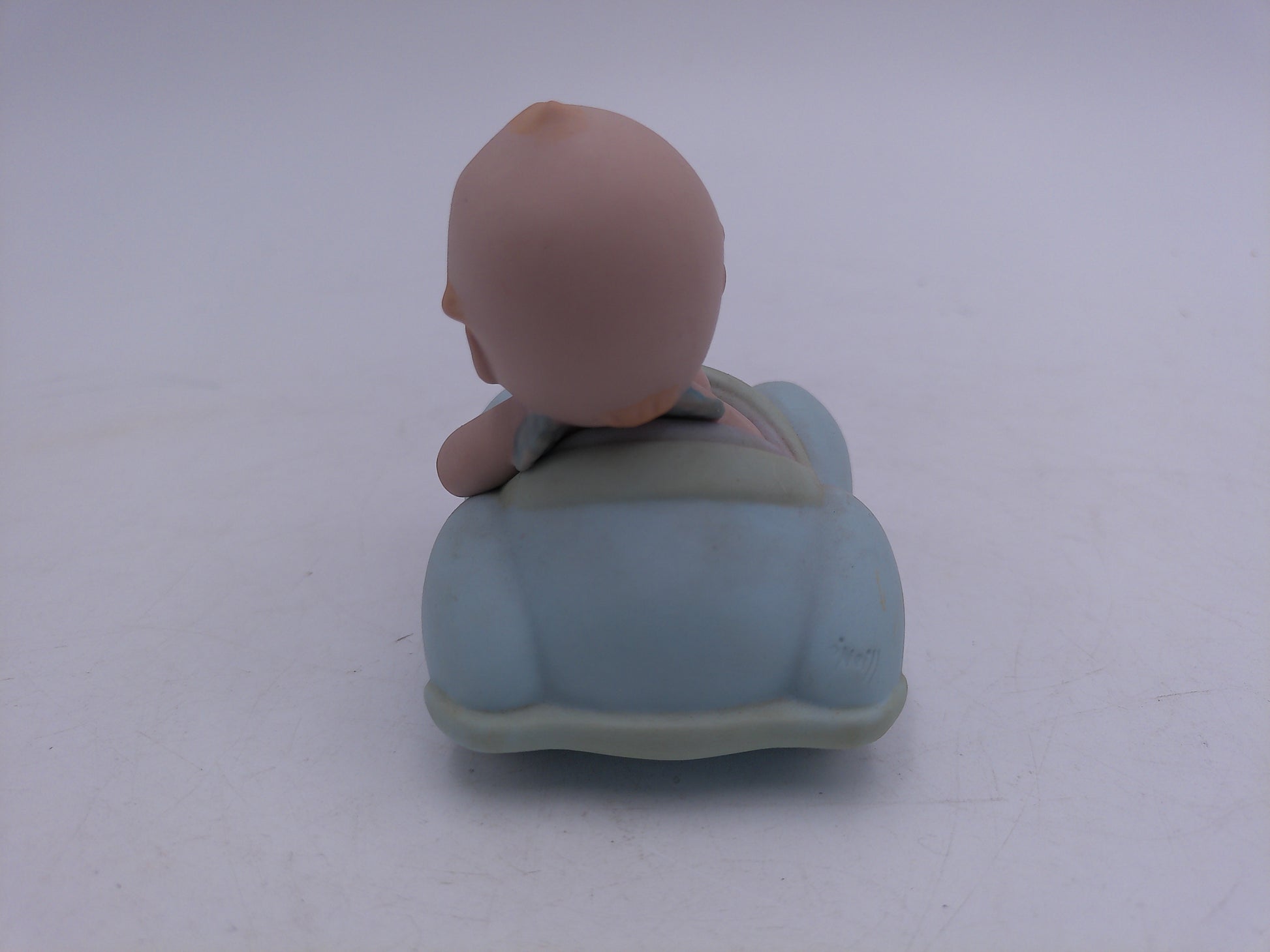 Kewpie Bisque Figurine, Boy With Blue Wings, In Blue Car Vintage