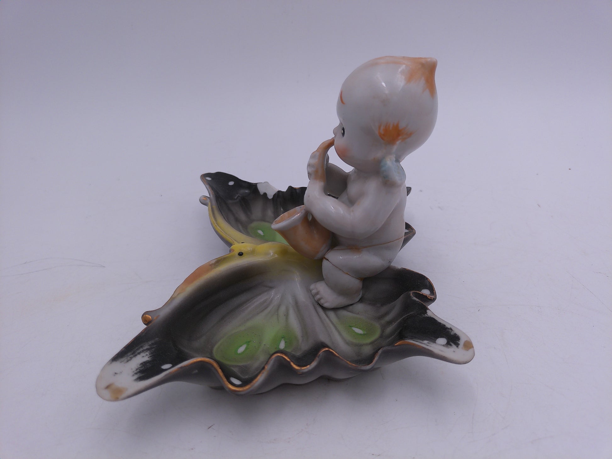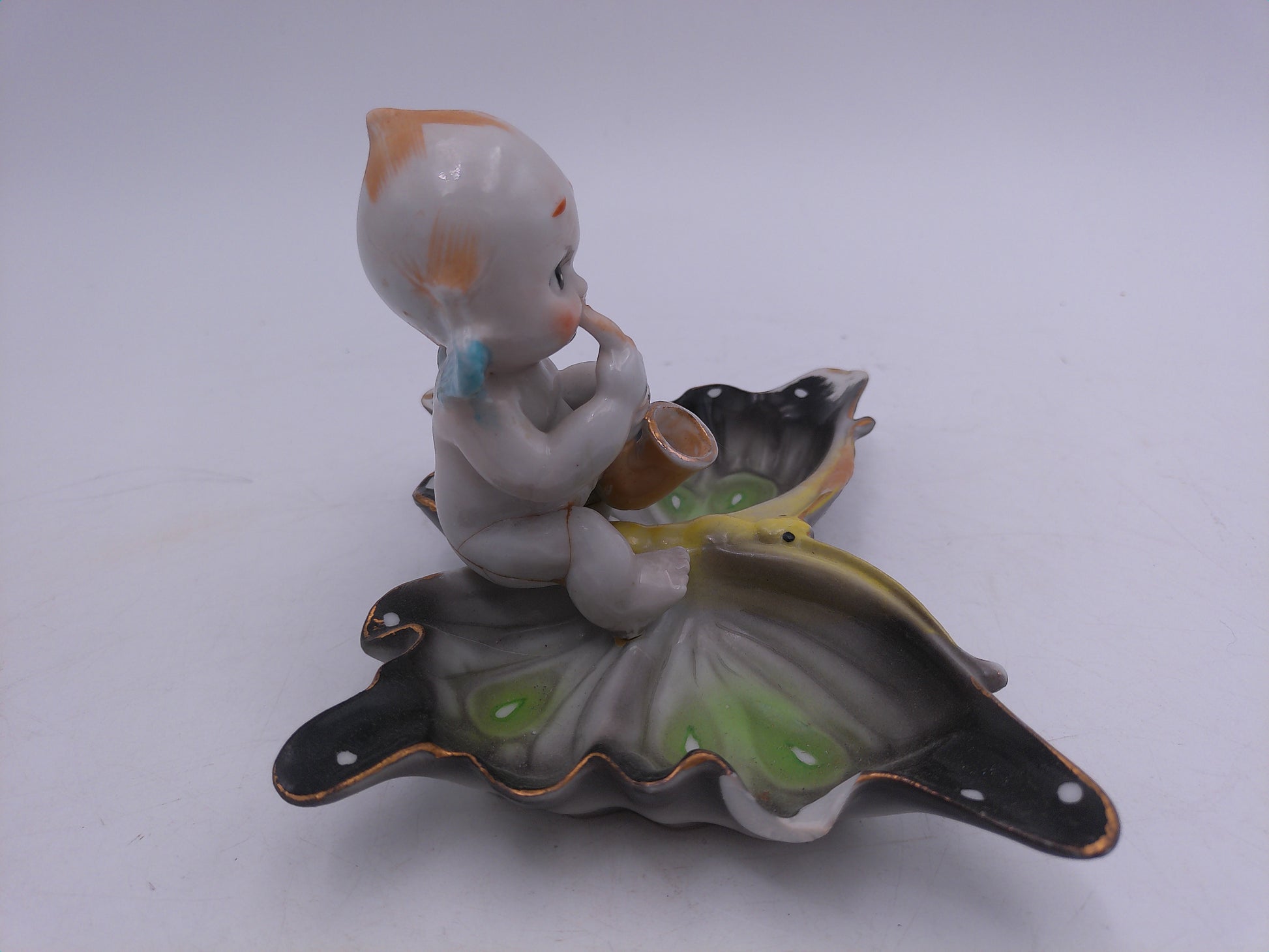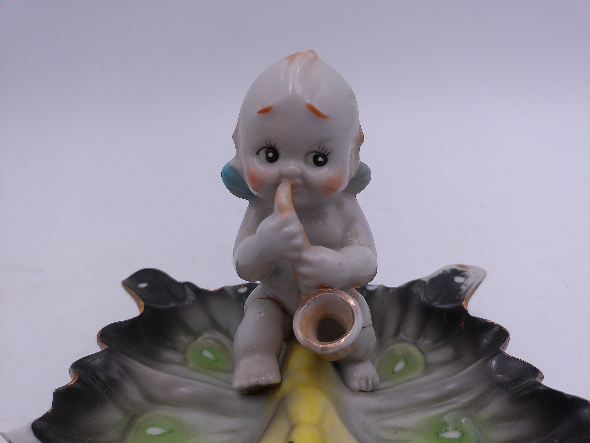 This vintage Kewpie figure features a playful Kewpie riding on a butterfly while playing the saxophone. Crafted with attention to detail, this whimsical piece adds a touch of nostalgia and charm to any collection. Perfect for lovers of vintage and music alike.