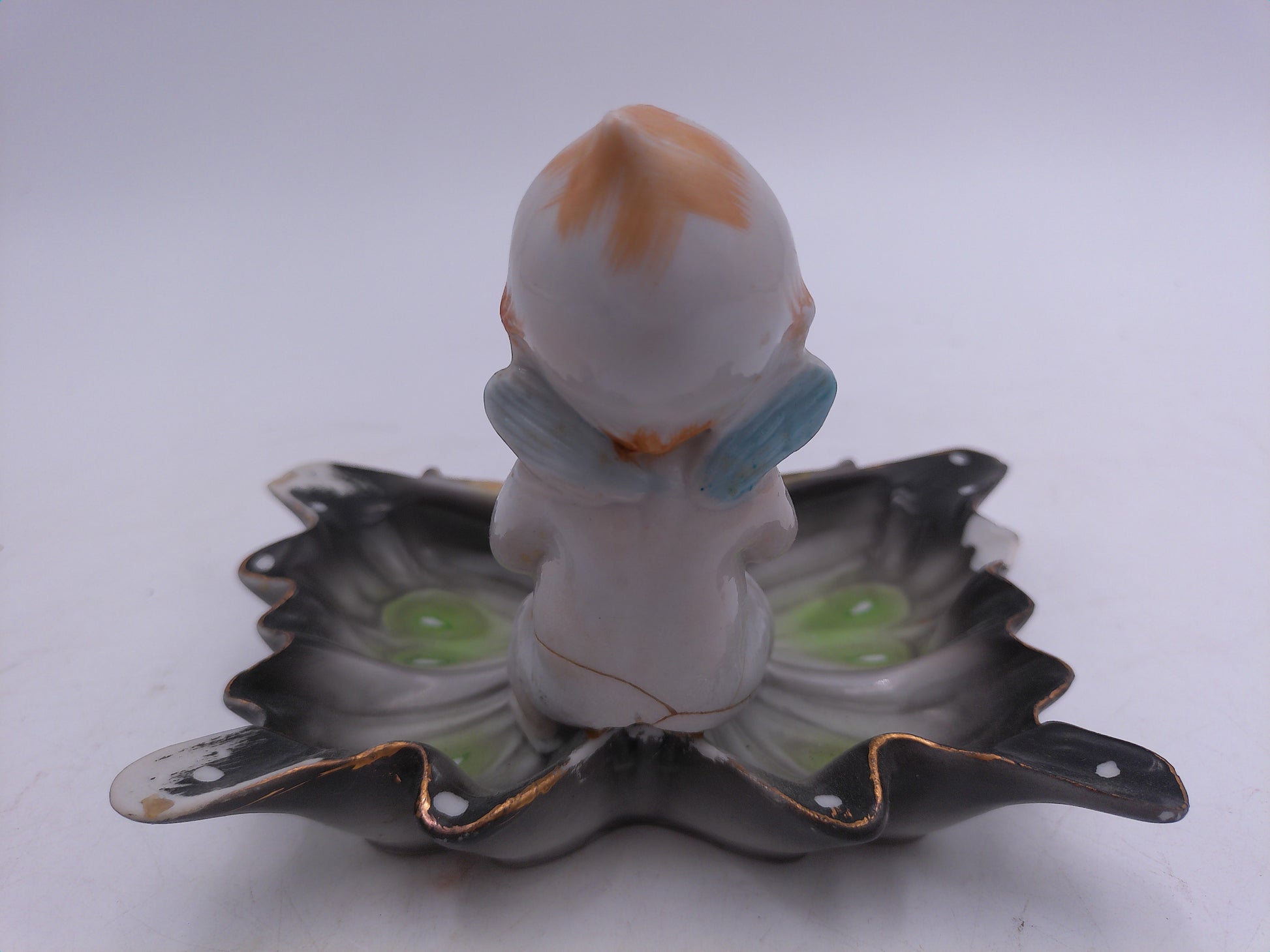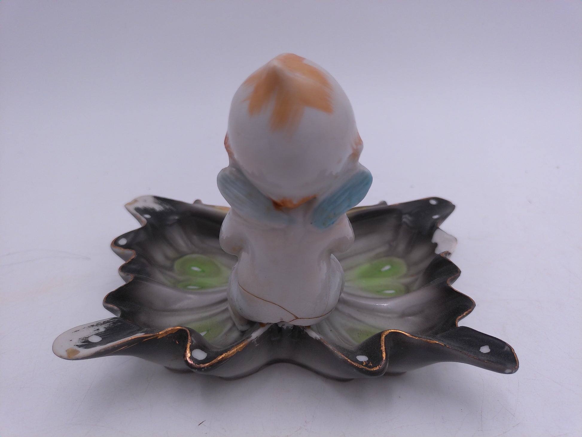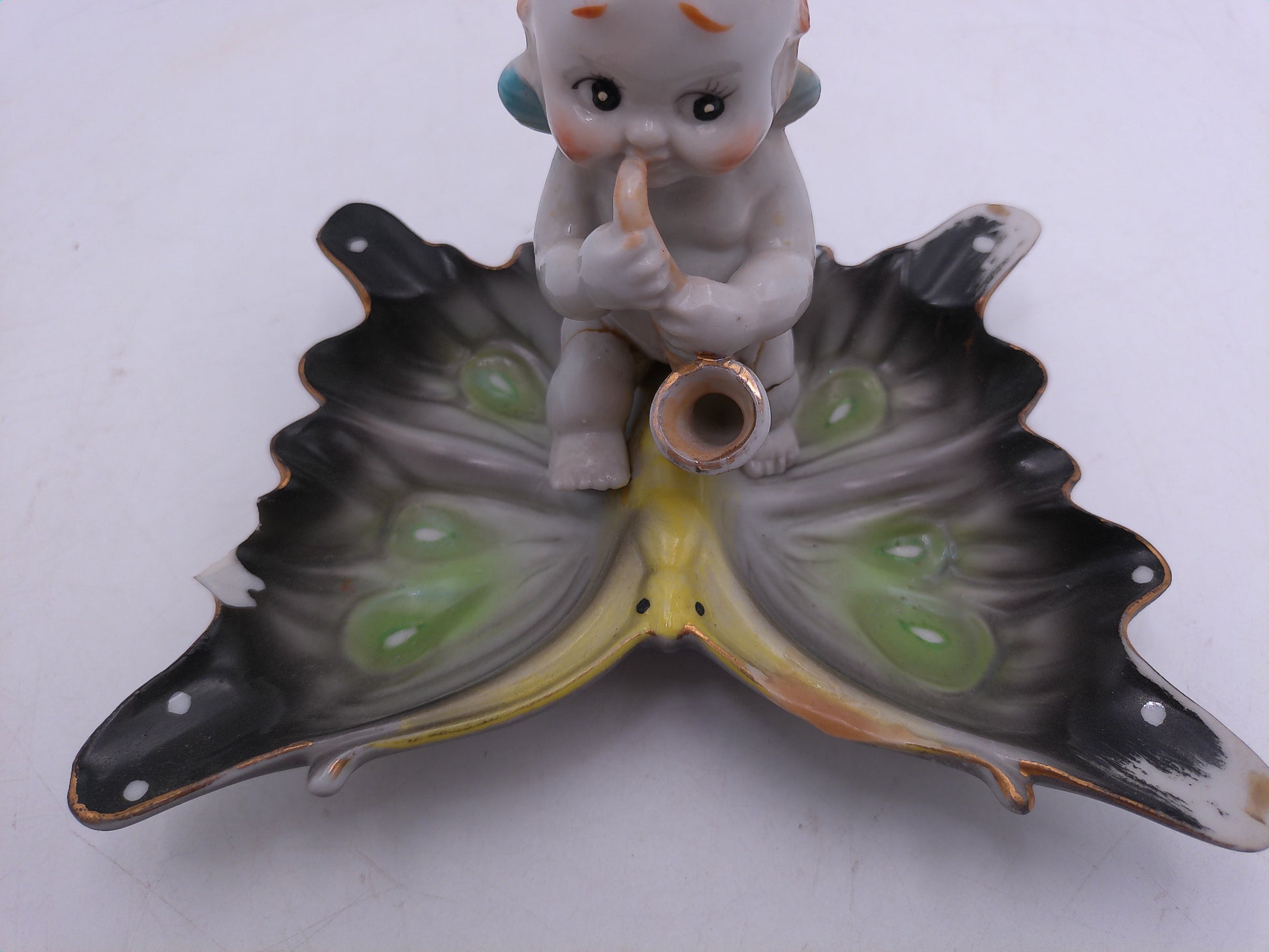 This vintage Kewpie figure features a playful Kewpie riding on a butterfly while playing the saxophone. Crafted with attention to detail, this whimsical piece adds a touch of nostalgia and charm to any collection. Perfect for lovers of vintage and music alike.