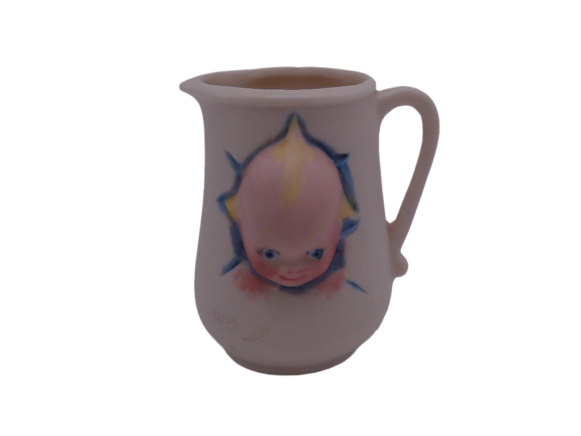 This vintage Kewpie Pitcher is a collector's delight. Made with high-quality materials and adorned with intricate details, it is perfect for displaying or serving drinks. Its unique design and expert craftsmanship make it a timeless piece of art that will add character to any space. A must-have for any vintage lover or avid collector.