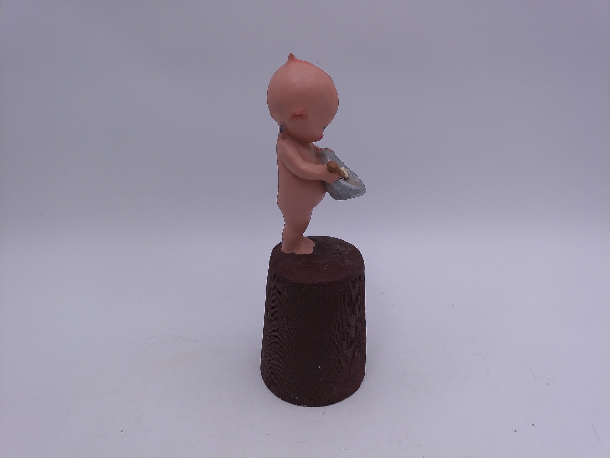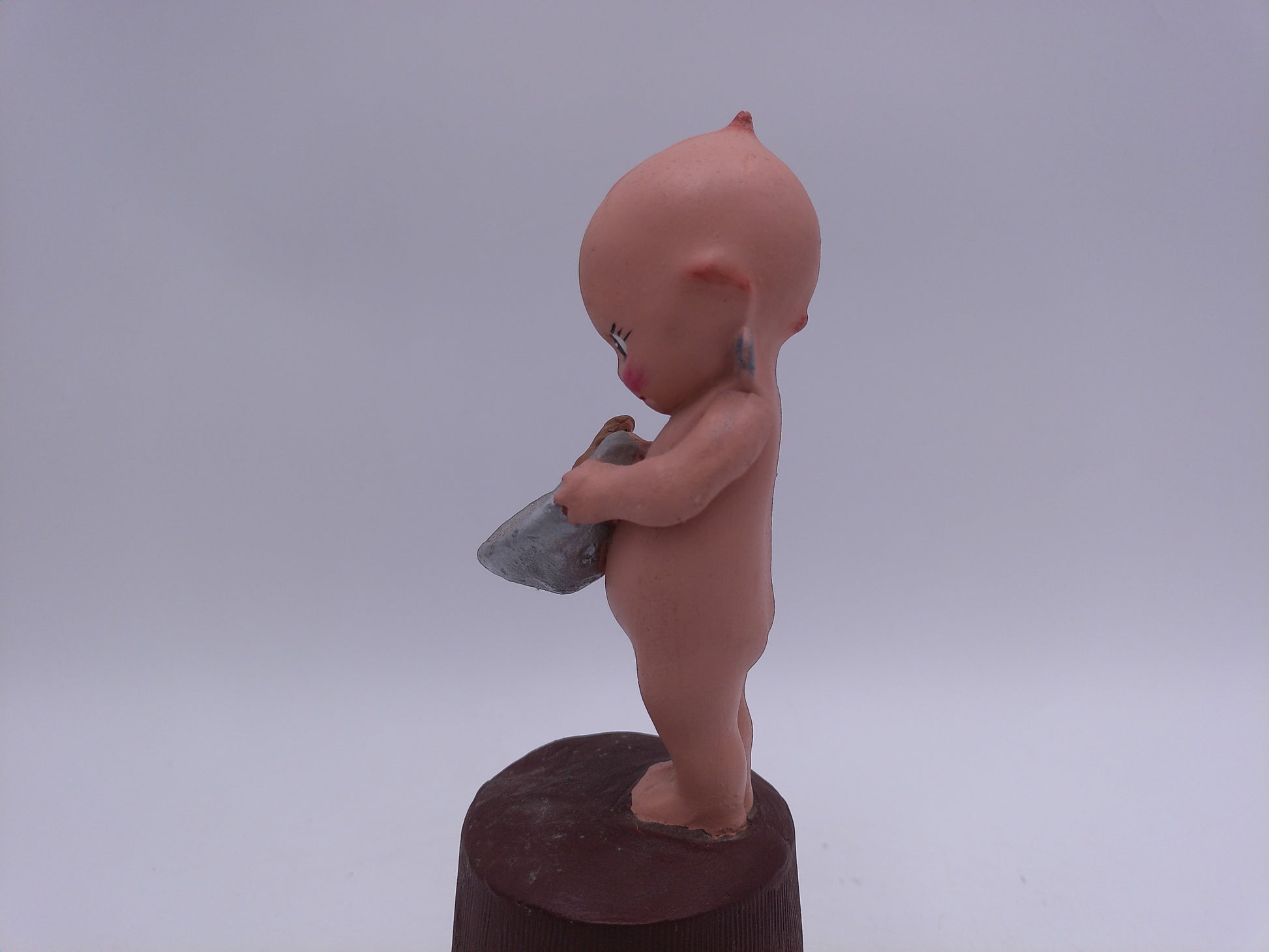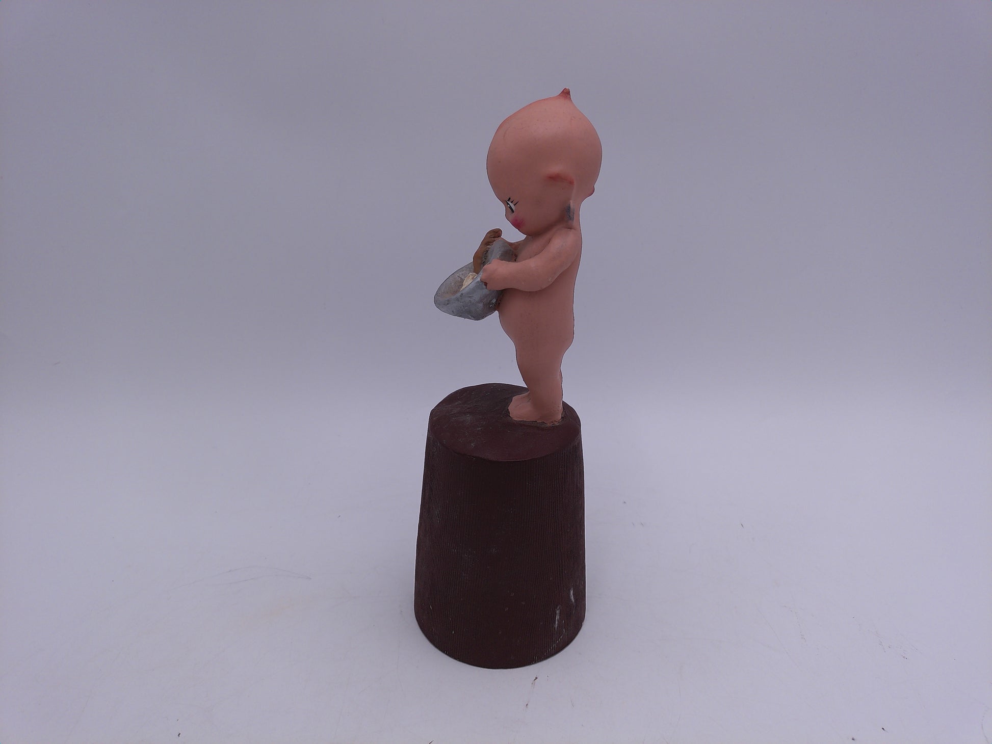 Meet the adorable Kewpie Standing on Log, the perfect addition to your home decor. Made with intricate detailing, this figurine will add a touch of charm and whimsy to any room. Perfect for displaying on a shelf or mantle, it also doubles as a dish or bowl holder for added functionality. Bring a smile to your face every day with this delightful Kewpie Standing on Log.