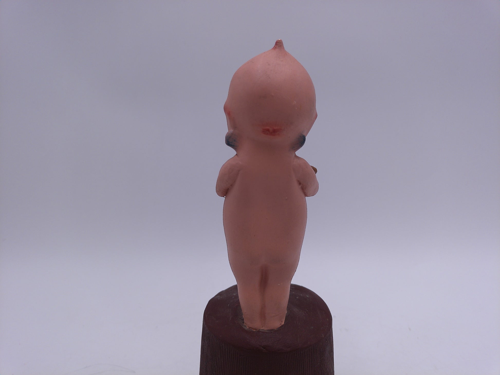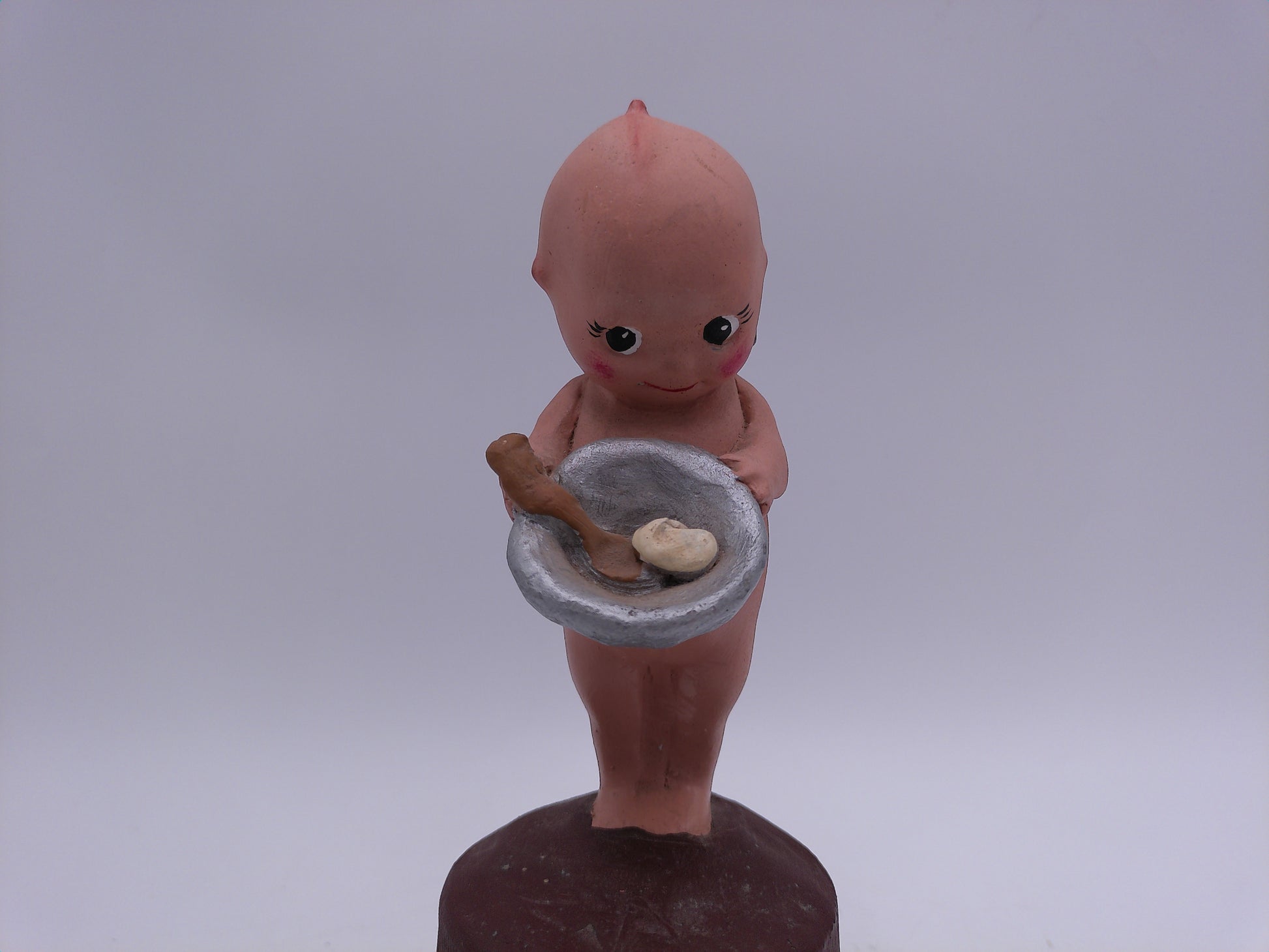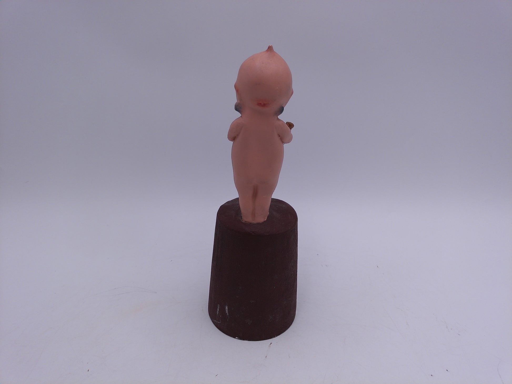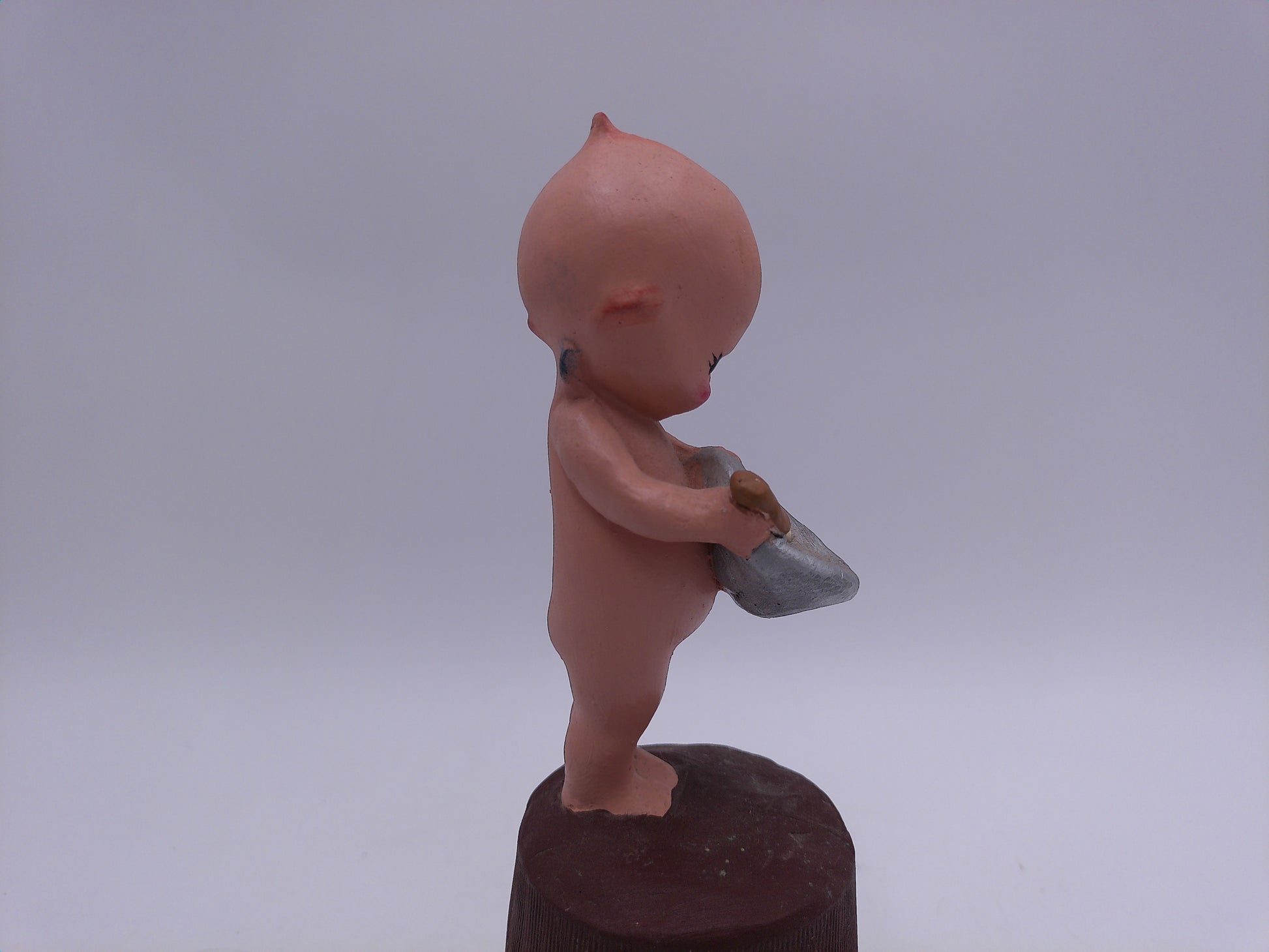 Meet the adorable Kewpie Standing on Log, the perfect addition to your home decor. Made with intricate detailing, this figurine will add a touch of charm and whimsy to any room. Perfect for displaying on a shelf or mantle, it also doubles as a dish or bowl holder for added functionality. Bring a smile to your face every day with this delightful Kewpie Standing on Log.